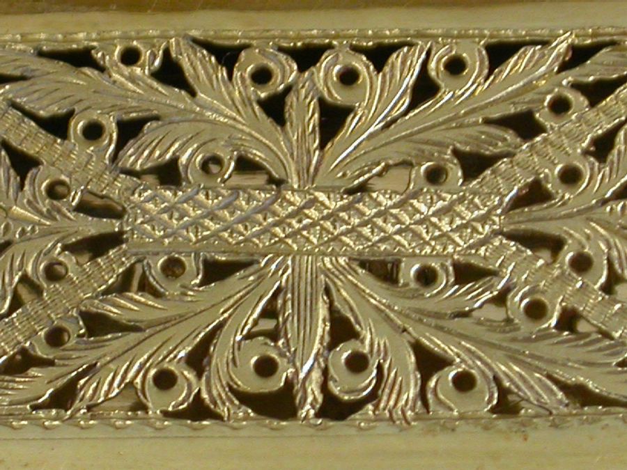 The silver gilt interior with an intricately pierced grill depicting feathers.