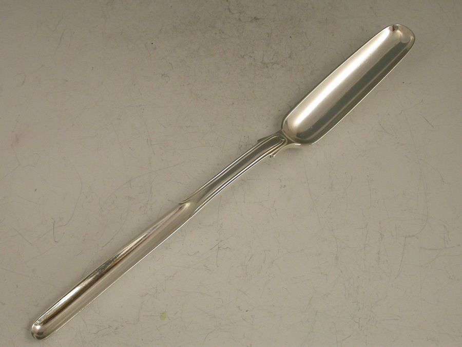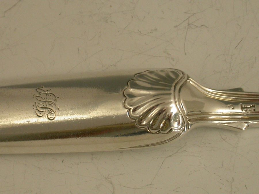 A good quality George IV heavy cast silver Marrow Scoop of Kings Hour Glass pattern with a Union Shell Heel to the bowl. The large bowl engraved with initials.