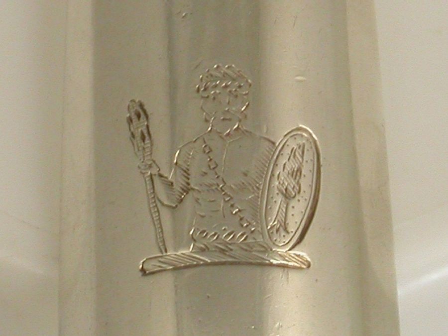 A fine quality George IV heavy cast silver Marrow Scoop in a variant of the Kings pattern with a 'Diamond Heel'. The larger bowl engraved with a crest of a 'Wild Man' or 'Saracen' holding a club and shield.