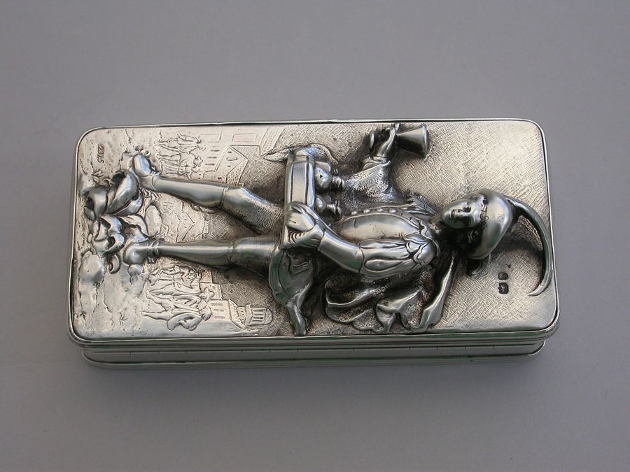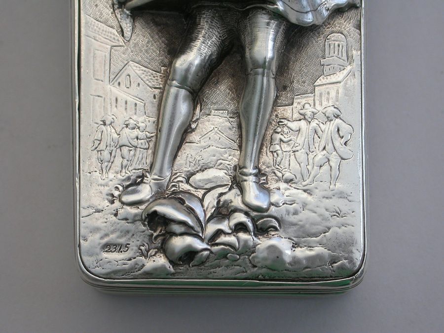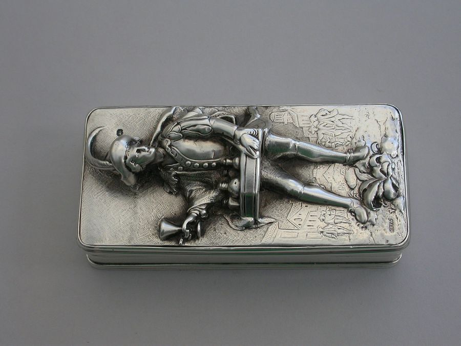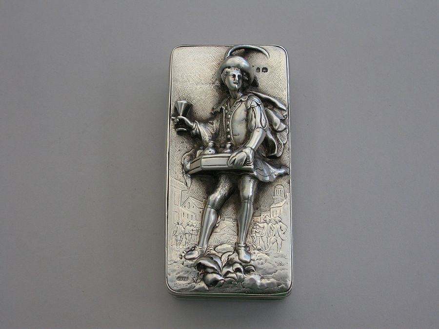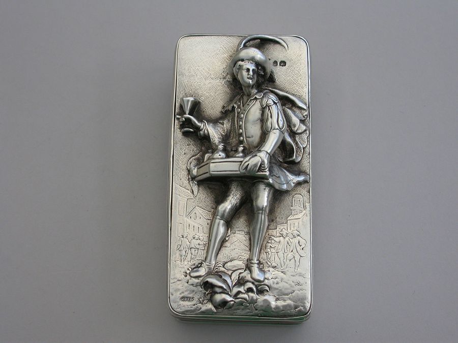 A very fine George IV silver ""Wine Pedlar"" Snuff Box, the lid chased in high relief depicting a Cavalier gentleman trading his wares, the background engraved with figures standing by buildings in a town square, the plain base and sides with raised reeded borders. Original silver gilt interior.