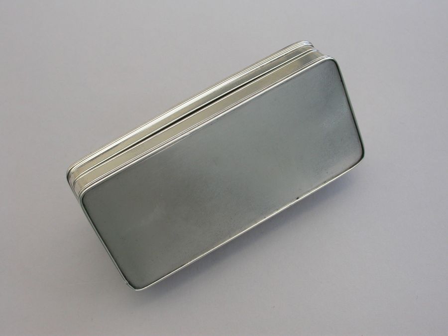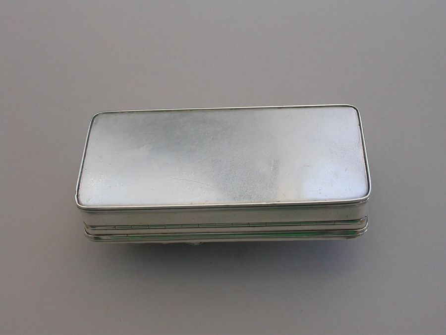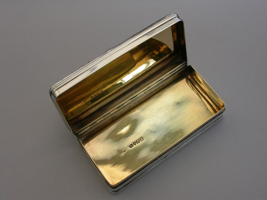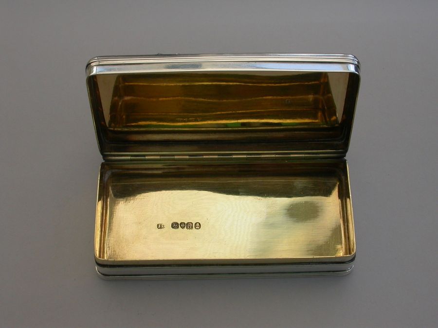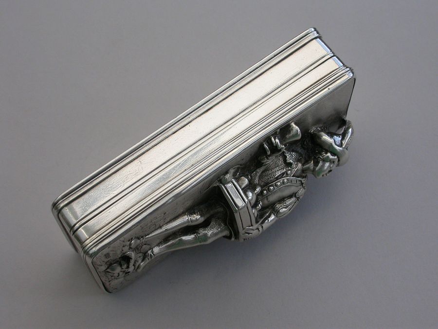 A very fine George IV silver ""Wine Pedlar"" Snuff Box, the lid chased in high relief depicting a Cavalier gentleman trading his wares, the background engraved with figures standing by buildings in a town square, the plain base and sides with raised reeded borders. Original silver gilt interior.