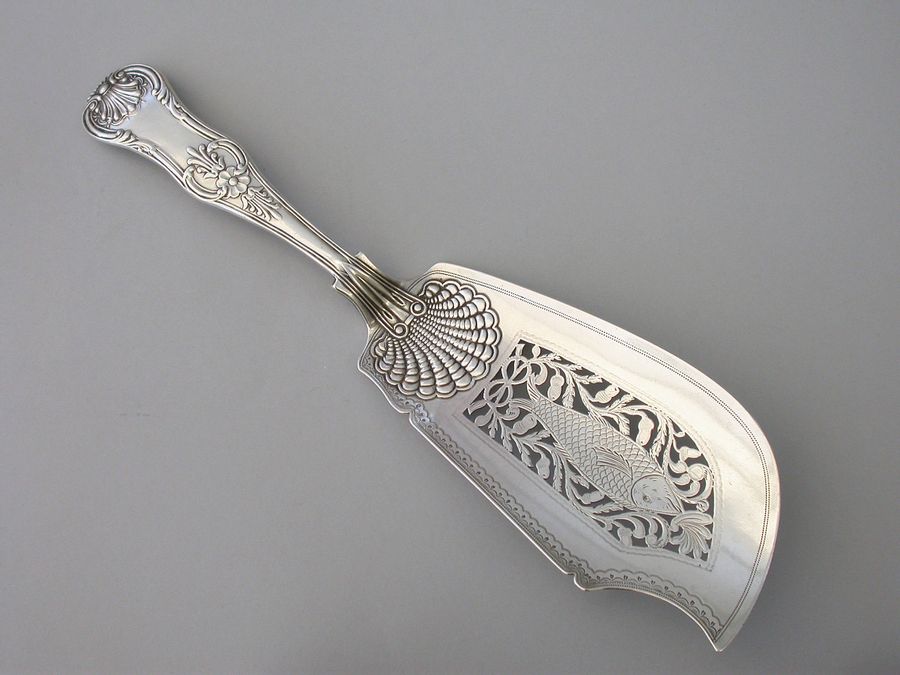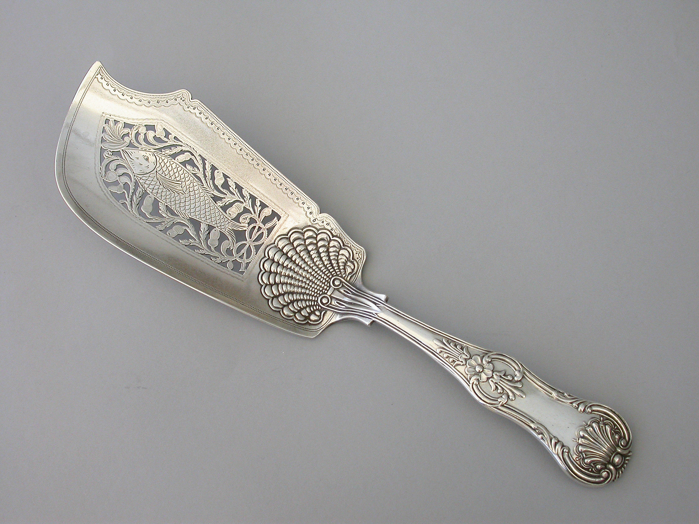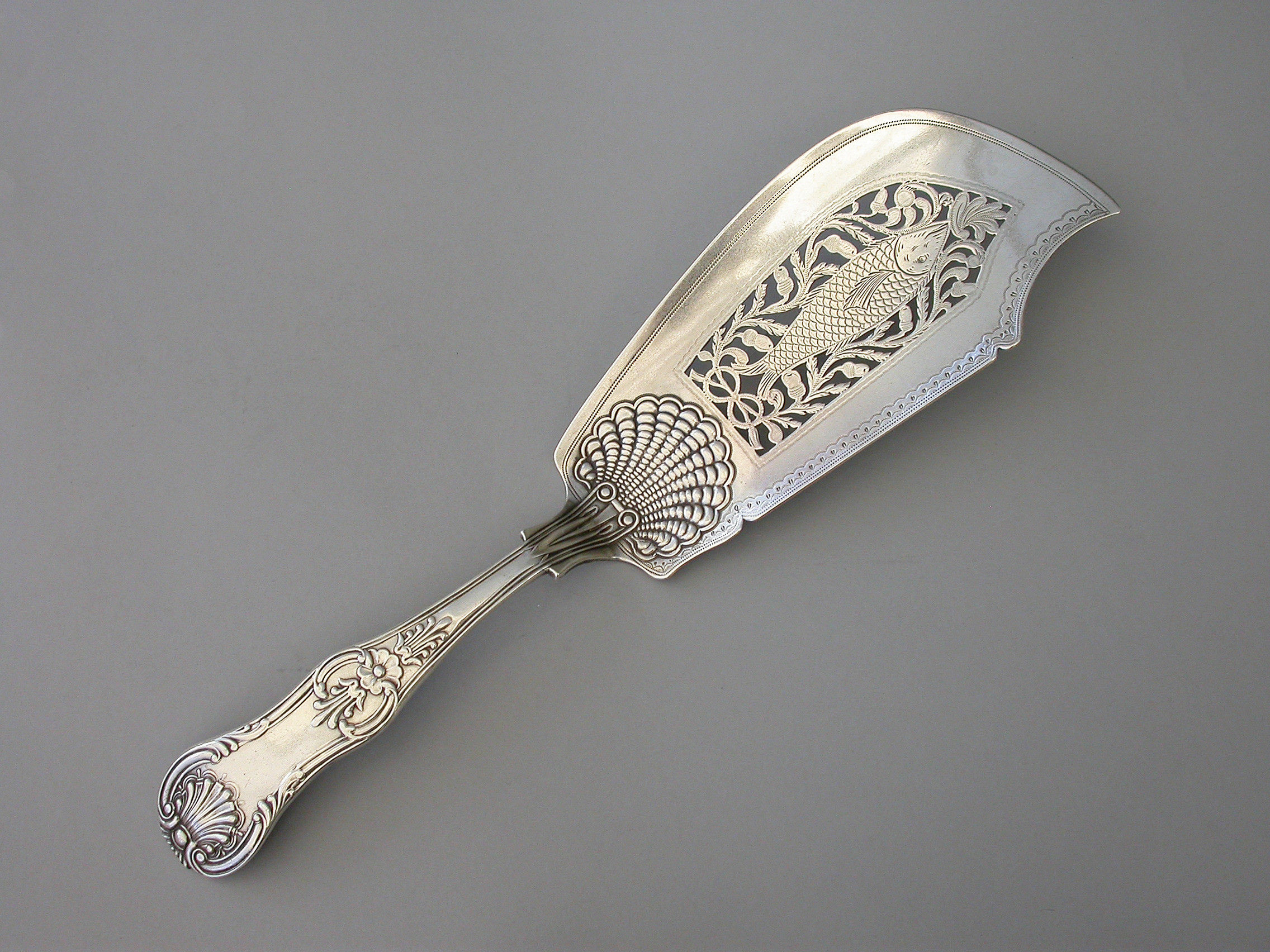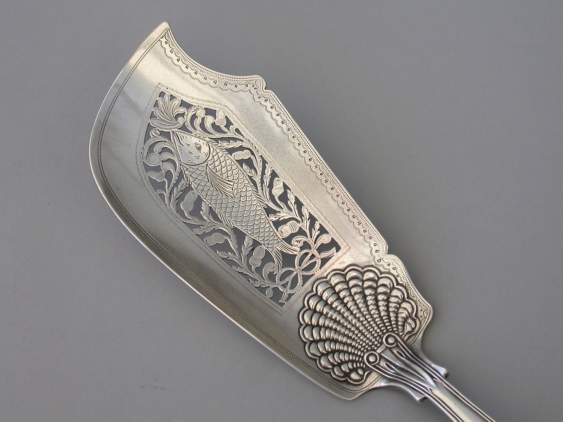 A good quality Victorian silver Fish Slice made in Queens Oyster pattern, with double-struck handle and large oyster shell to the base of the blade, finely pierced with a fish and acorns.