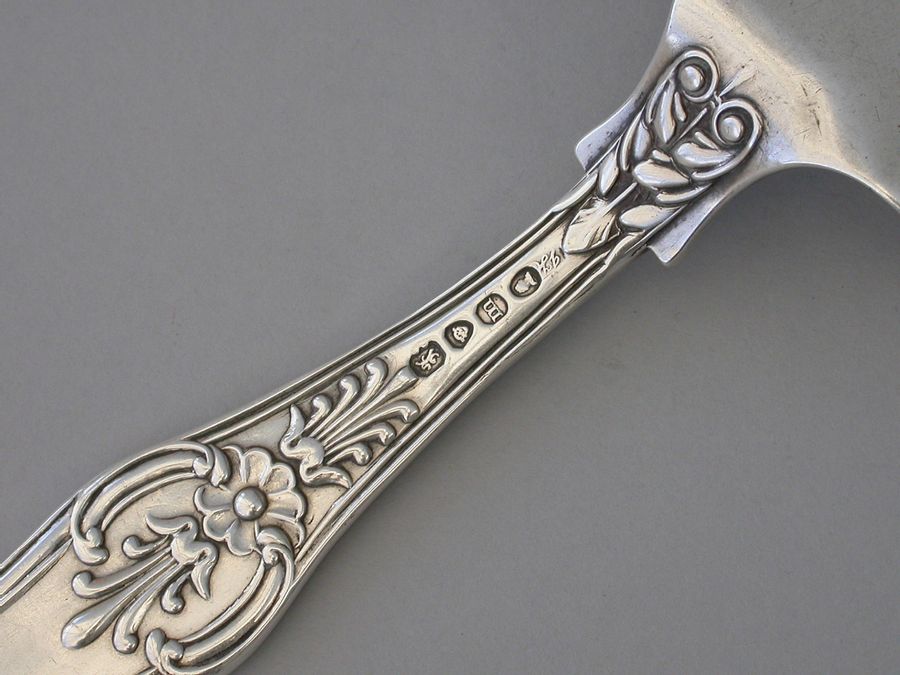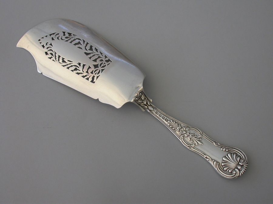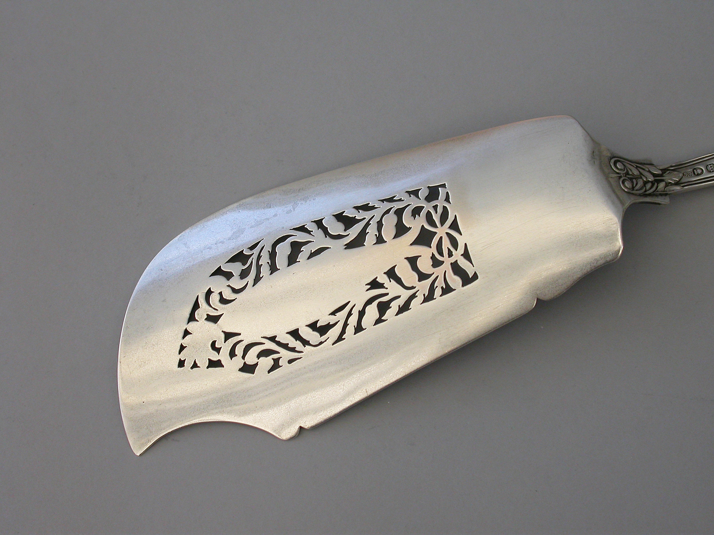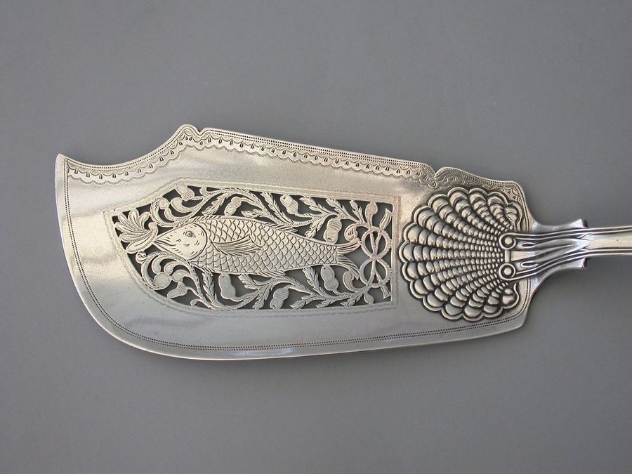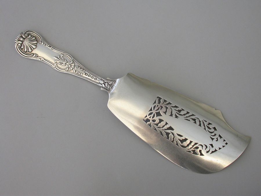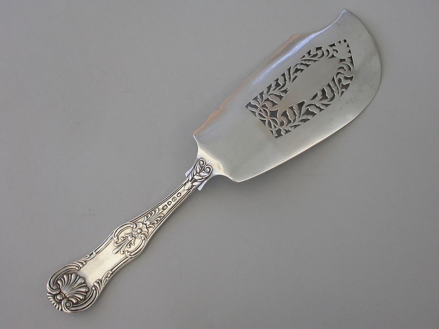 A good quality Victorian silver Fish Slice made in Queens Oyster pattern, with double-struck handle and large oyster shell to the base of the blade, finely pierced with a fish and acorns.