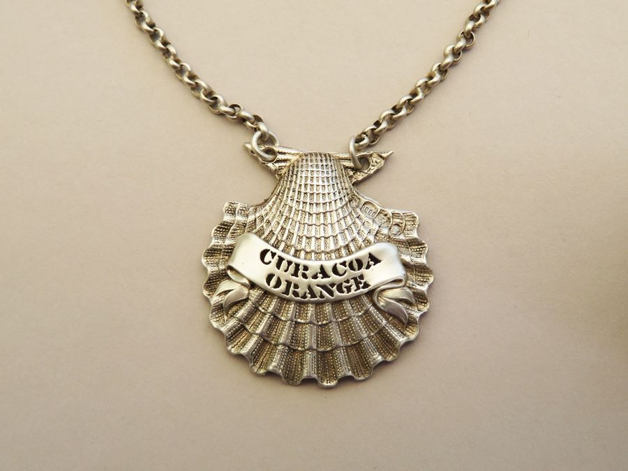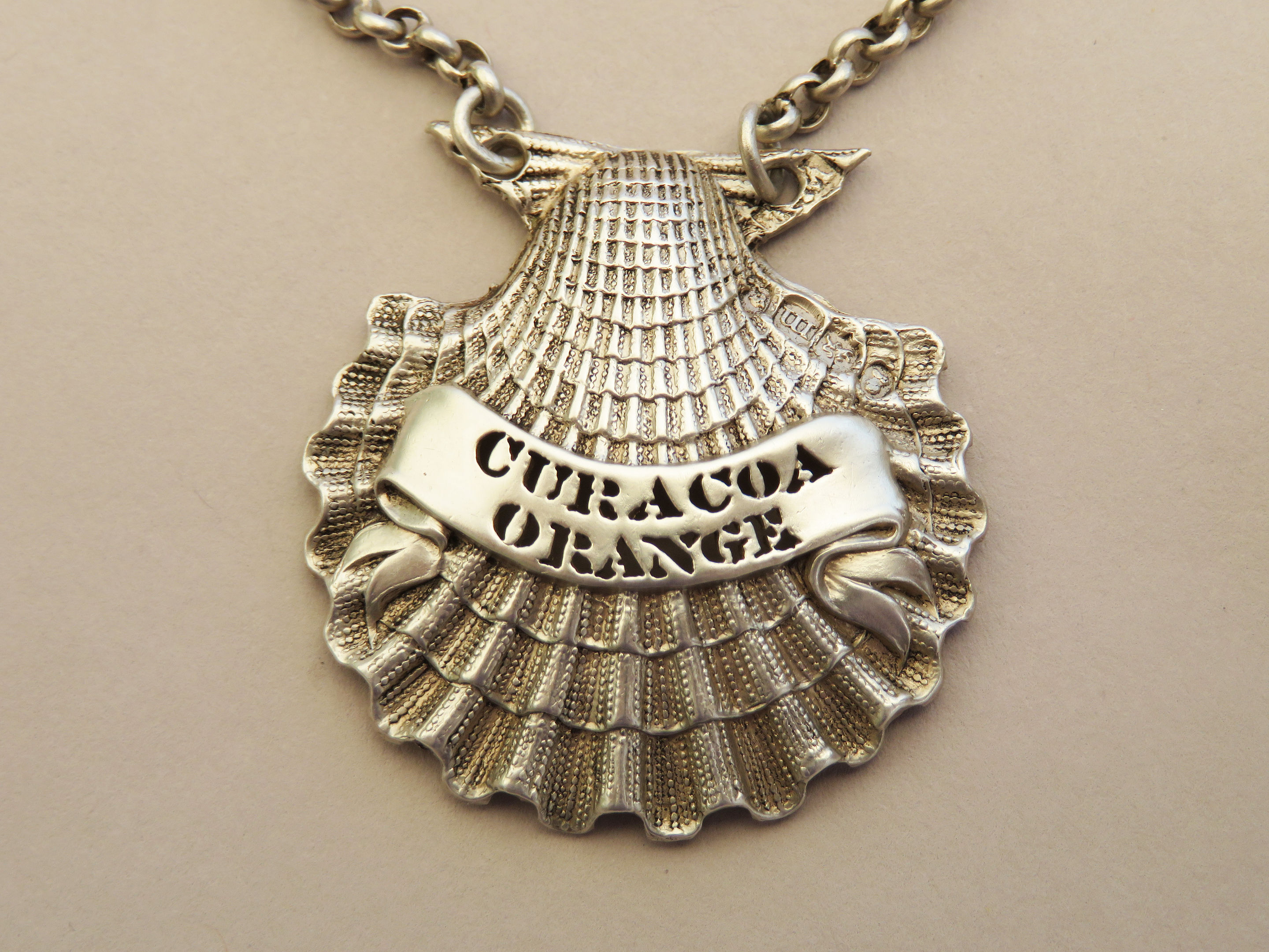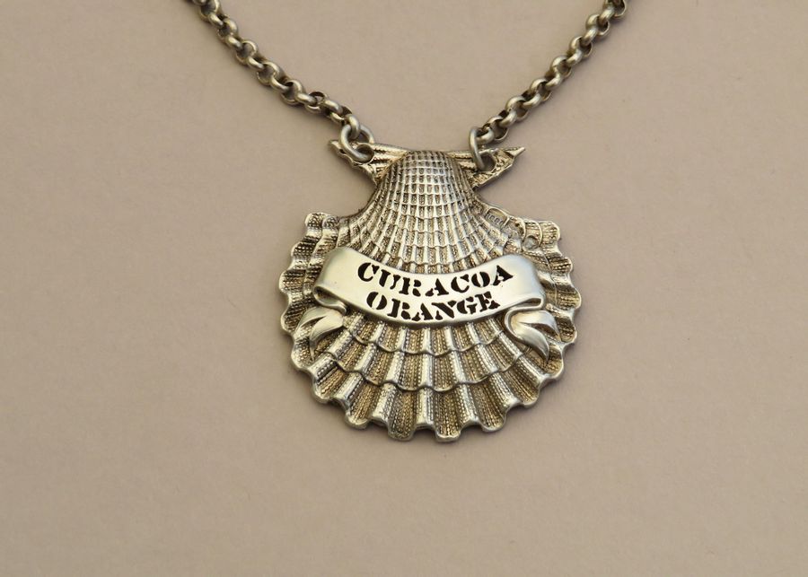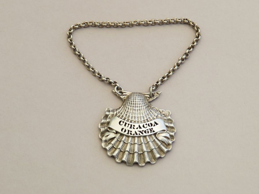 An extremely rare George IV cast silver Sauce Label, naturalistically formed as a scallop shell, pierced for Curacoa Orange on a scrolled name plate (a previously unrecorded title).