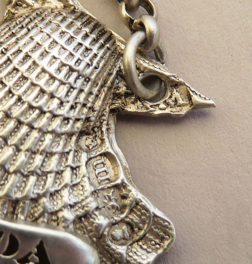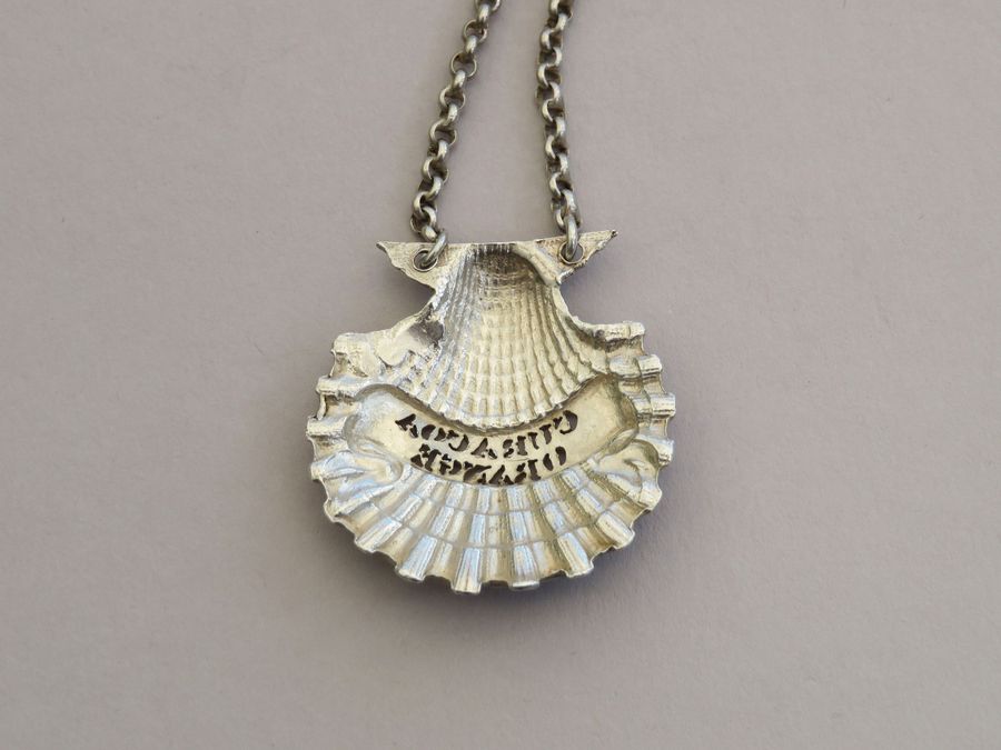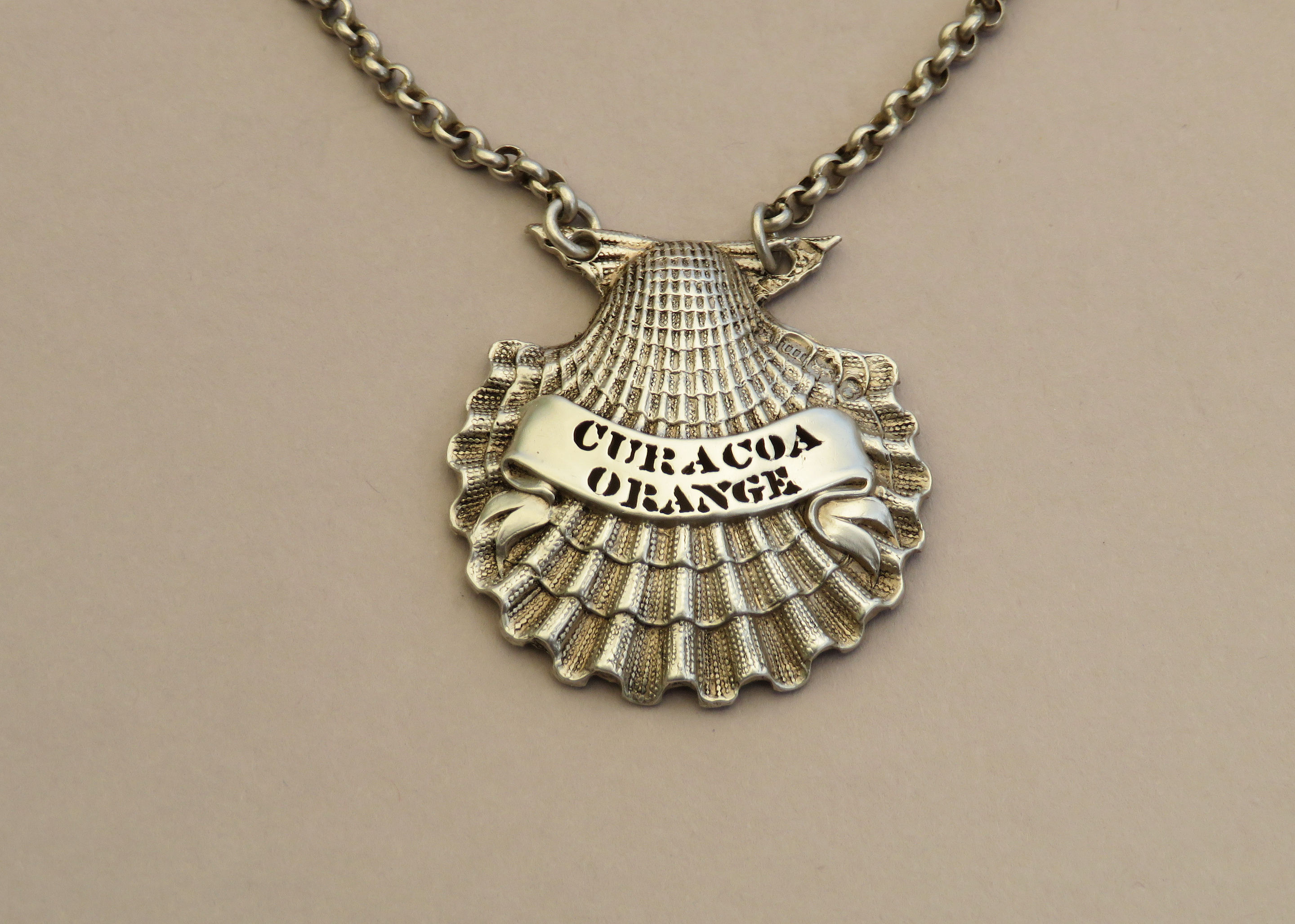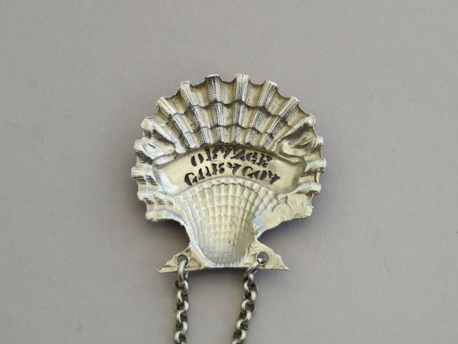 An extremely rare George IV cast silver Sauce Label, naturalistically formed as a scallop shell, pierced for Curacoa Orange on a scrolled name plate (a previously unrecorded title).