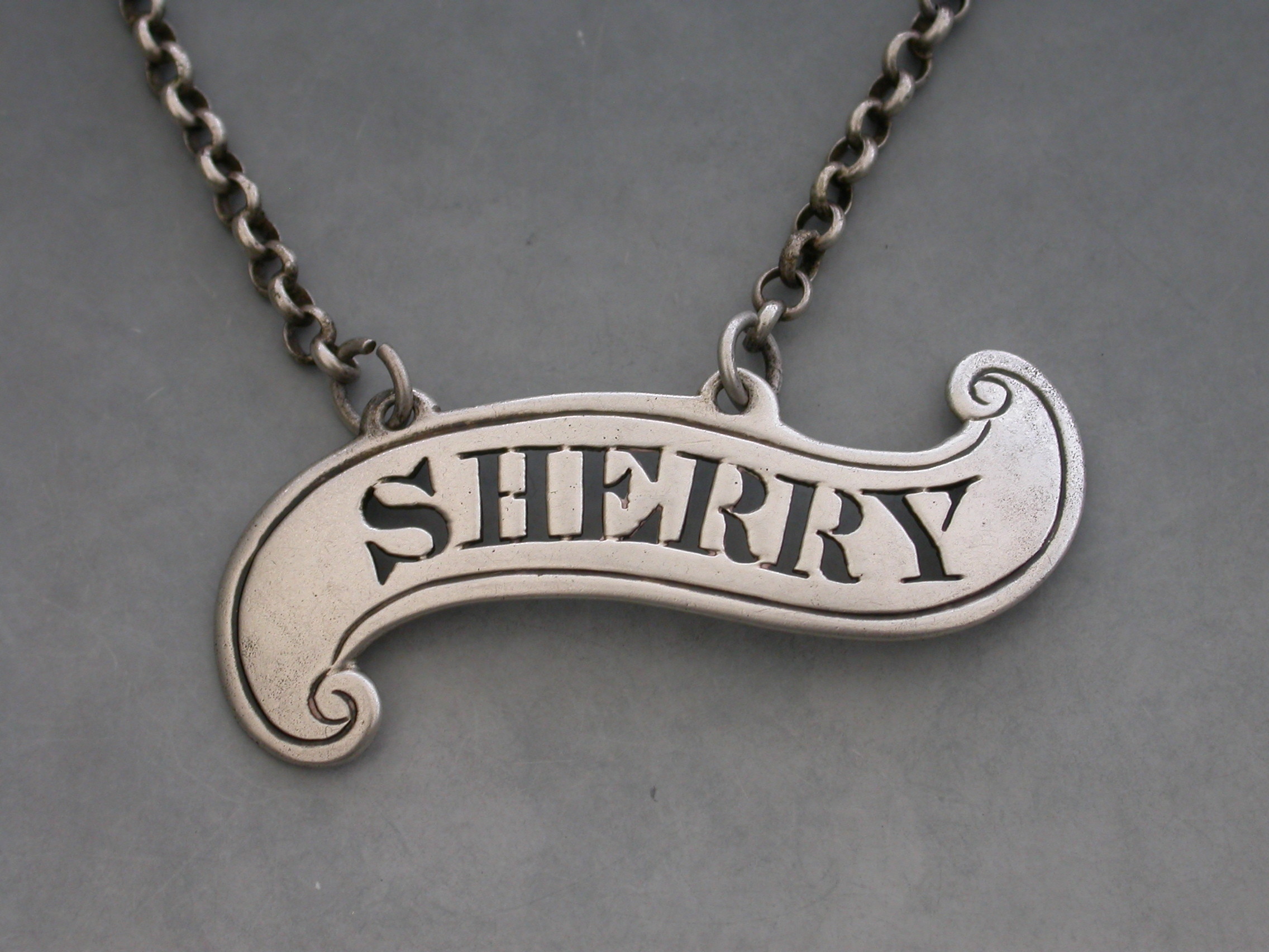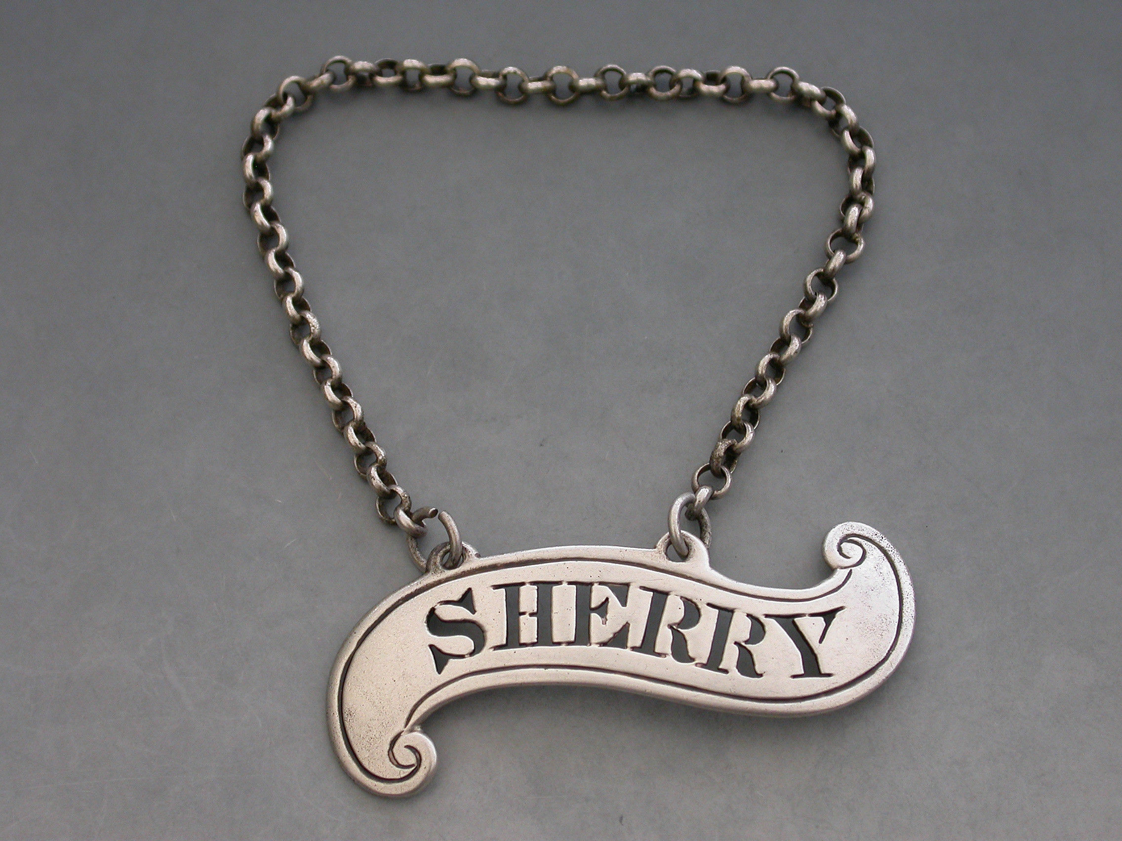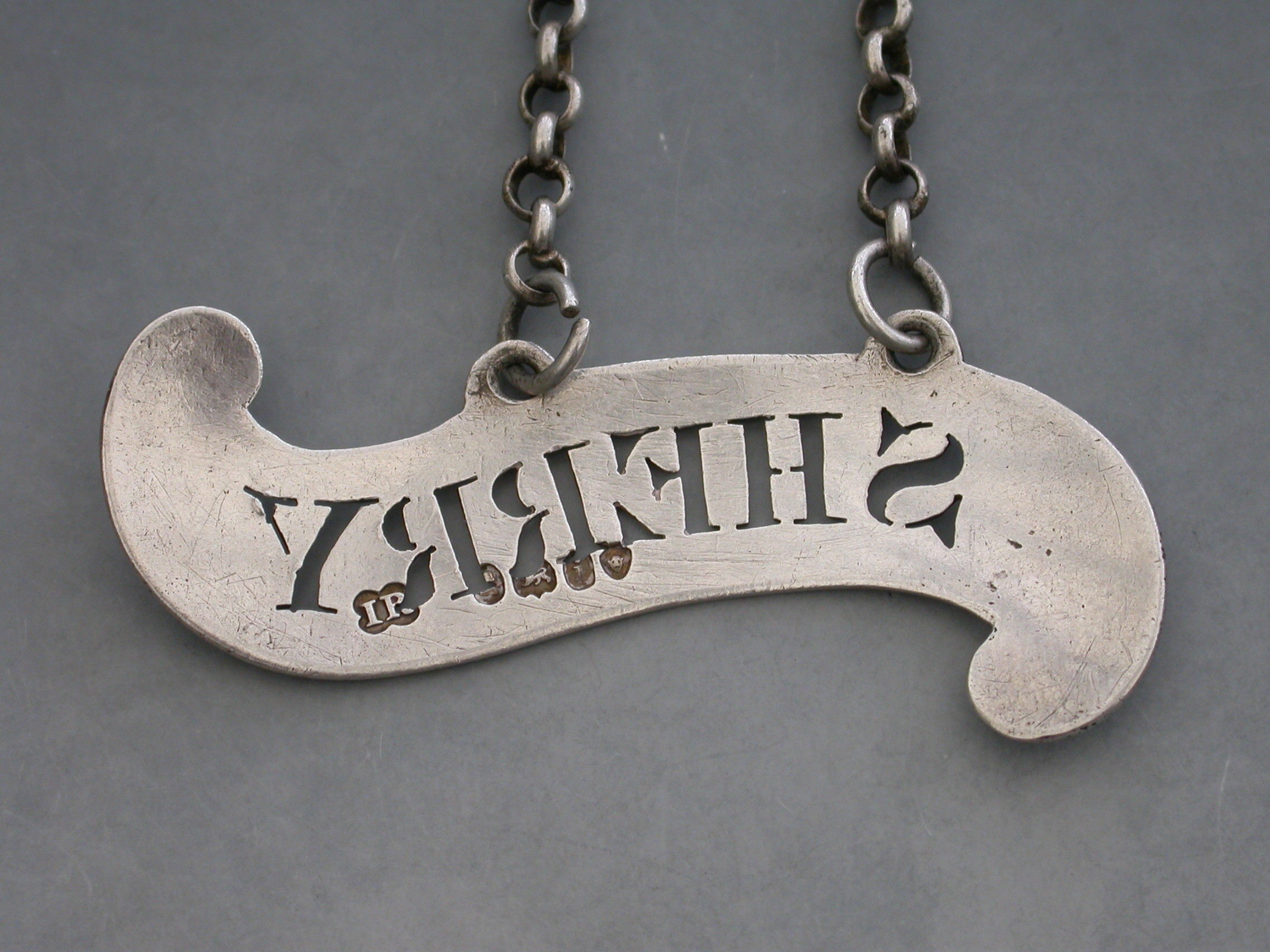 An unusual George IV silver Wine Label of plain scroll form with single reeded border, pierced for Sherry.