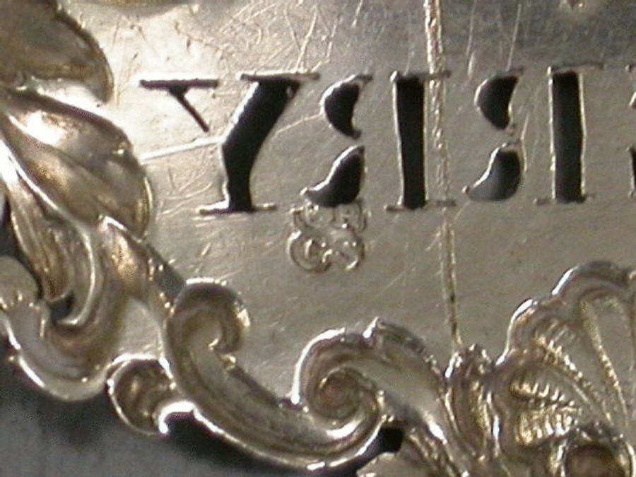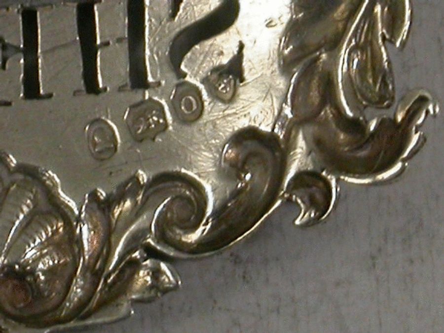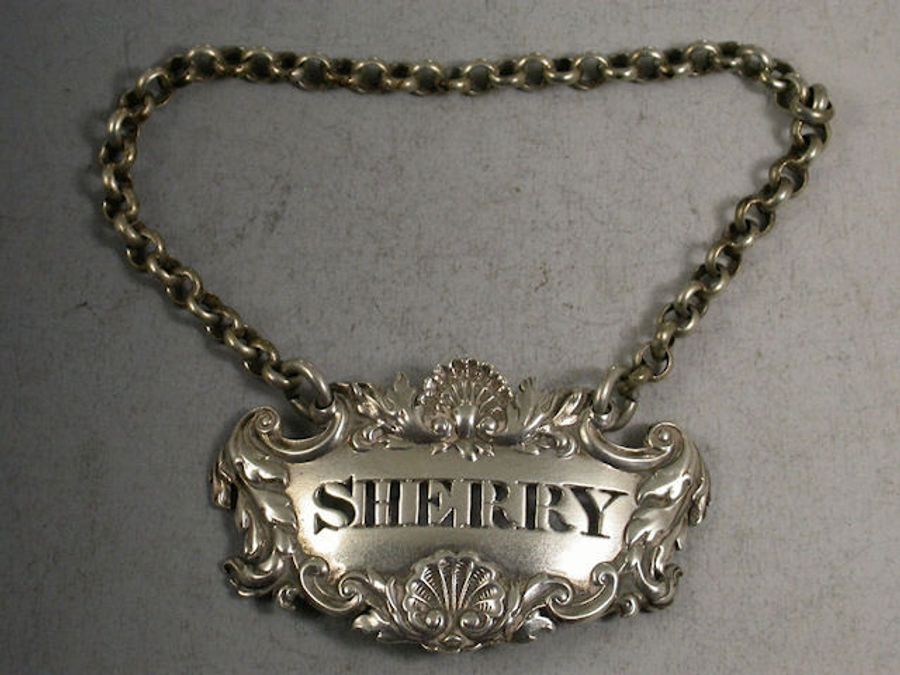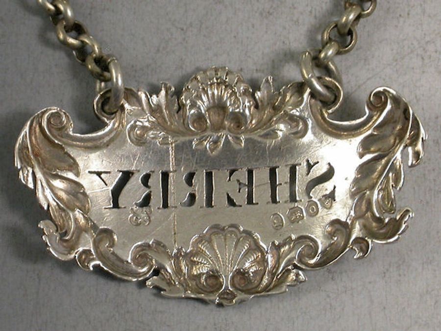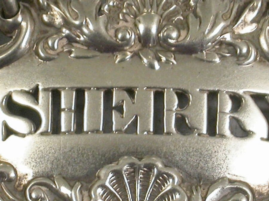 A George IV heavy die-stamped silver Wine Label of cartouche form with shell, scroll and acanthus leaf boarder, pierced for SHERRY.