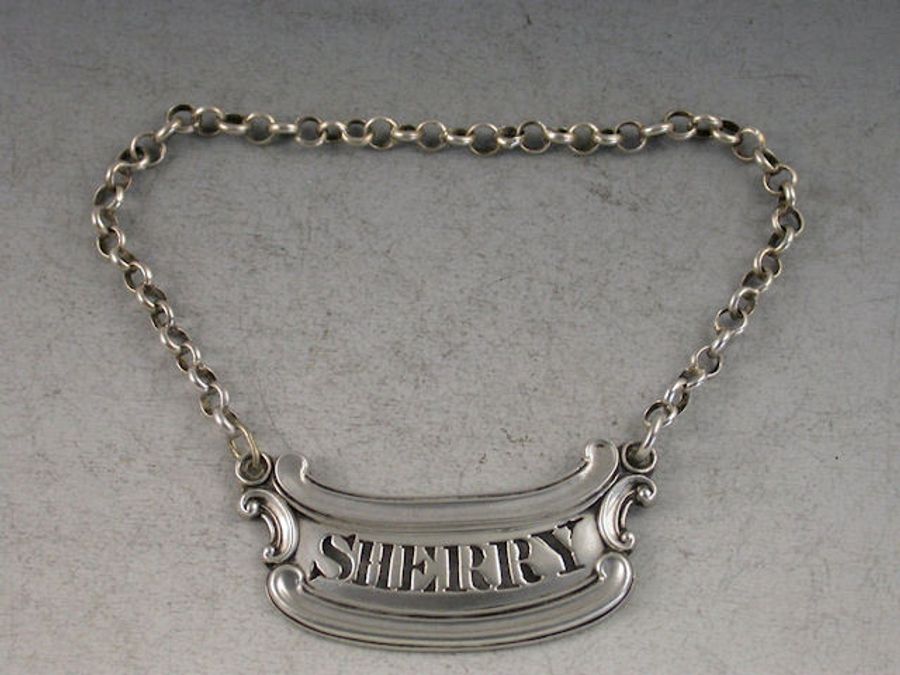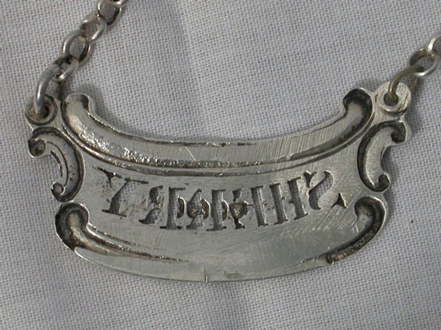A good Georgian cast silver Wine Label of shallow crescent or cartouche form with scrolled moulded borders, pierced for SHERRY.