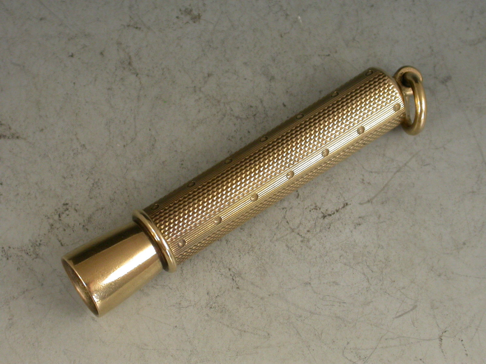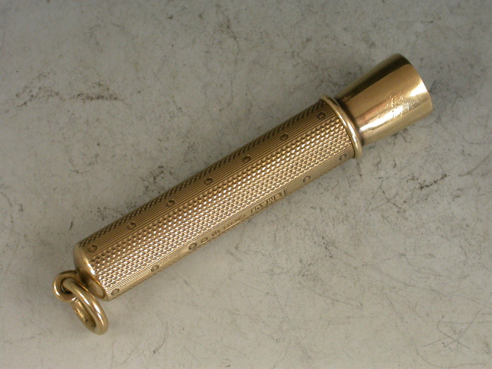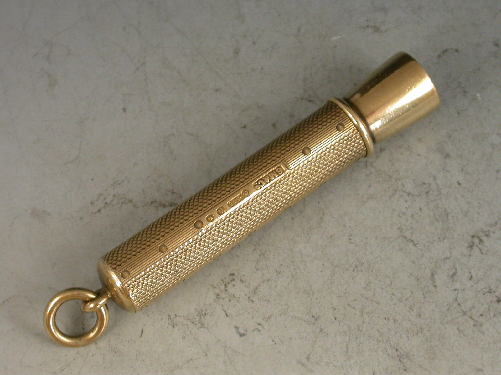 A good quality George V 9 carat gold sprung Cigar Piercer of tubular form, with engine turned line and dot decoration to the sheath, attached suspension ring. The metal piercer with sprung push button mechanism.