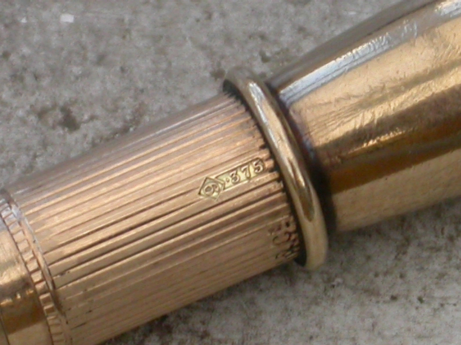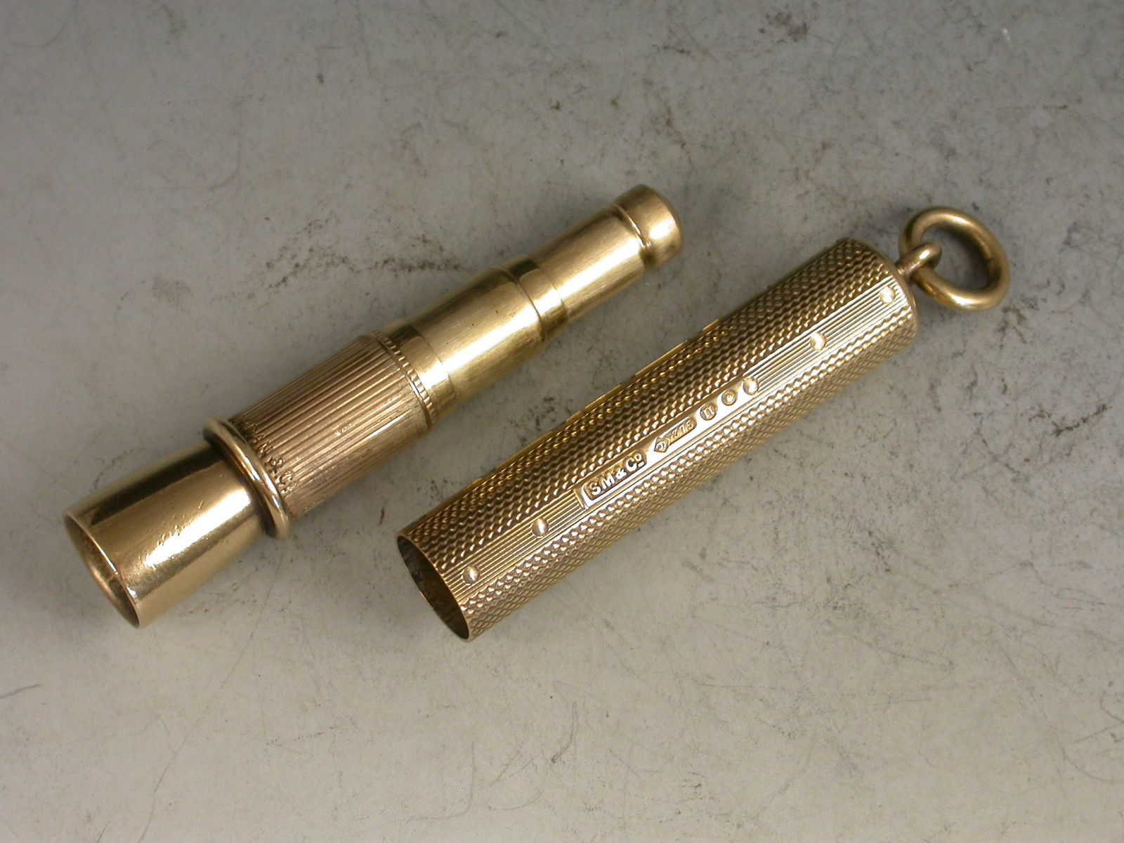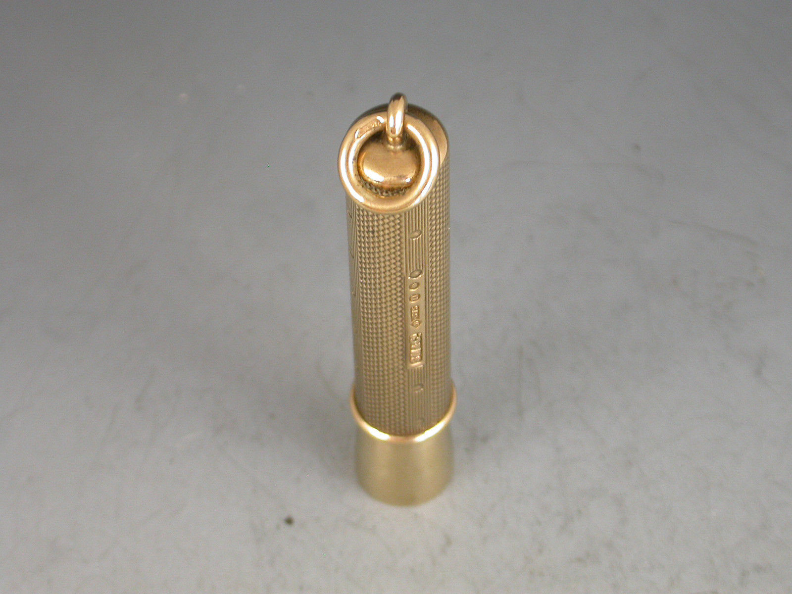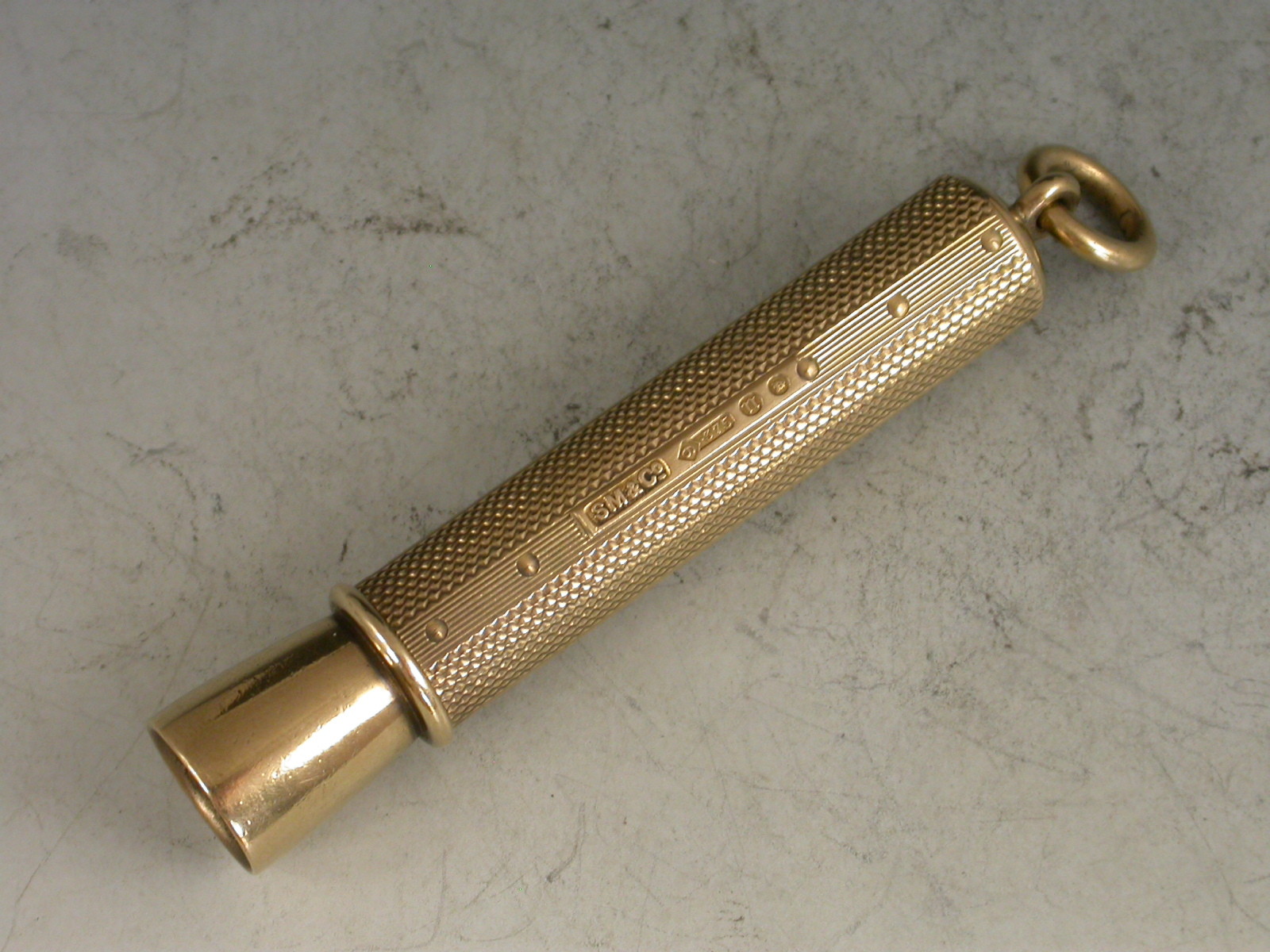 A good quality George V 9 carat gold sprung Cigar Piercer of tubular form, with engine turned line and dot decoration to the sheath, attached suspension ring. The metal piercer with sprung push button mechanism.
