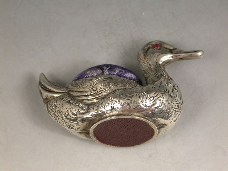 A rare Edwardian novelty silver Pin Cushion, made in the form of a swimming Duck with up-turned tail, complete with ruby red glass eyes and blue velvet cushion. Realistically modeled complete with trailing webbed feet.