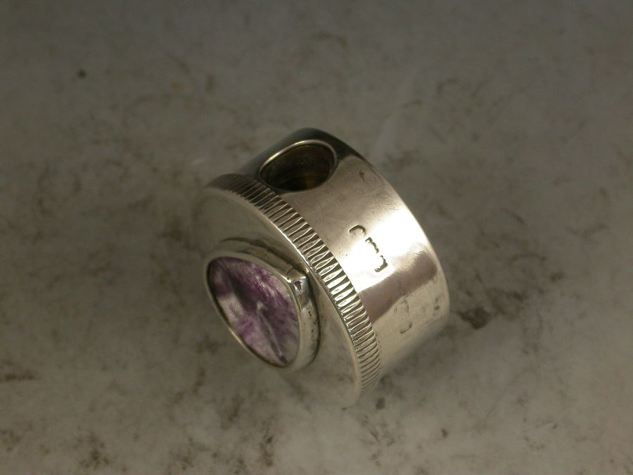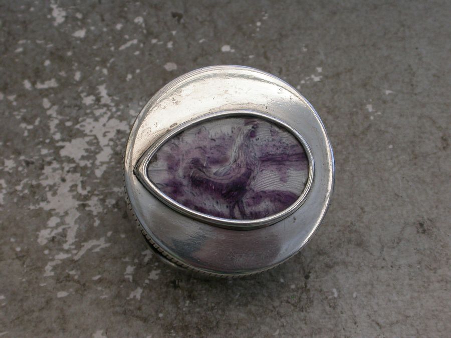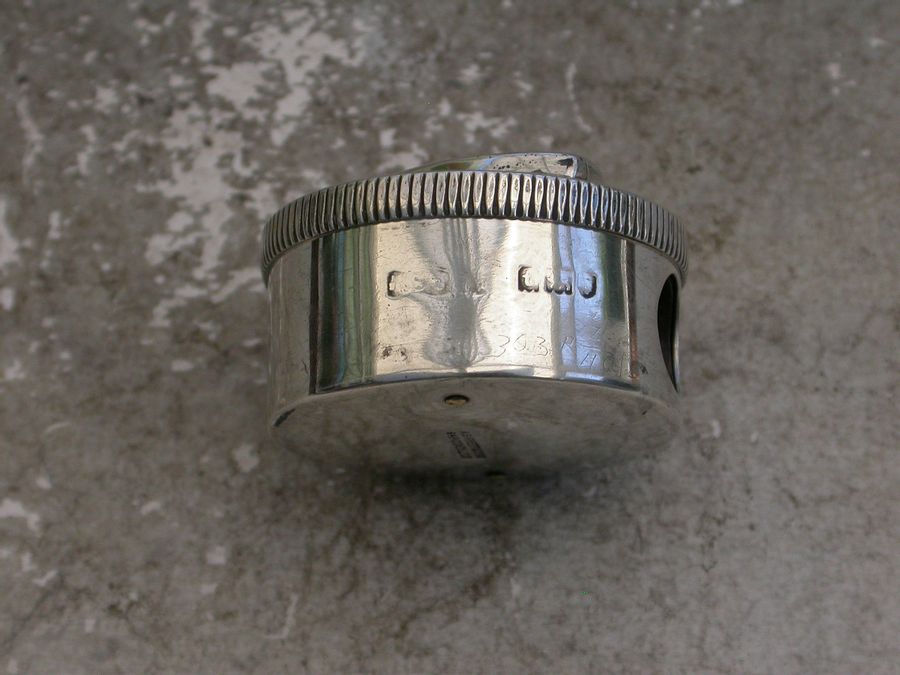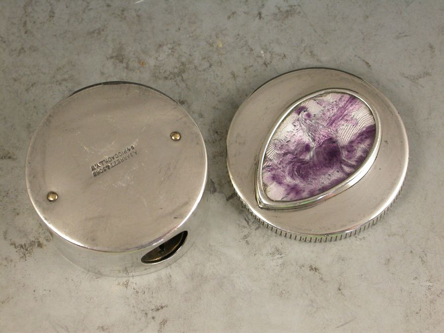 An unusual early 20th century silver and enamel Pocket Pencil Sharpener of circular form with pull-off lid. The lid set with a tear-drop shaped panel decorated with puce guilloche enamel depicting a cockerel in a landscape scene with a sunrise in the background.