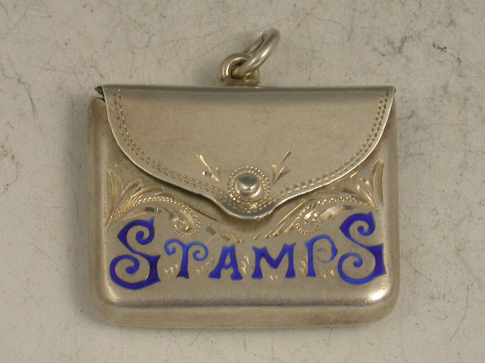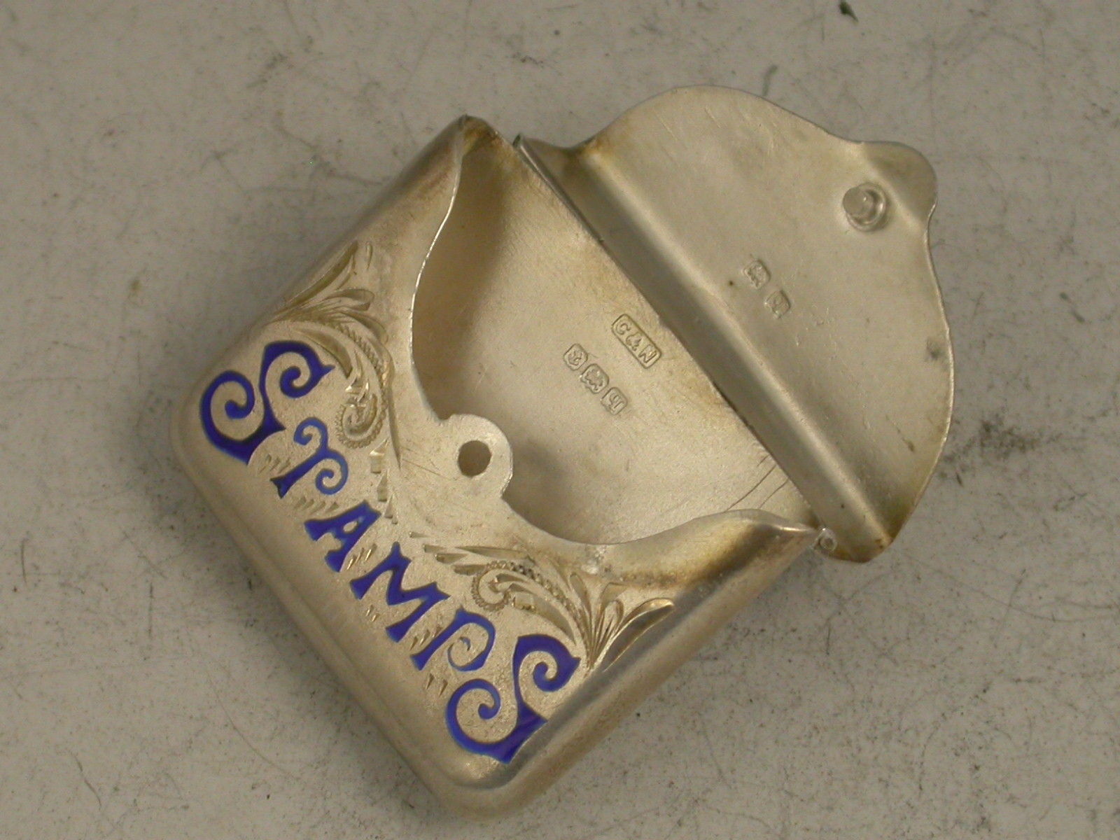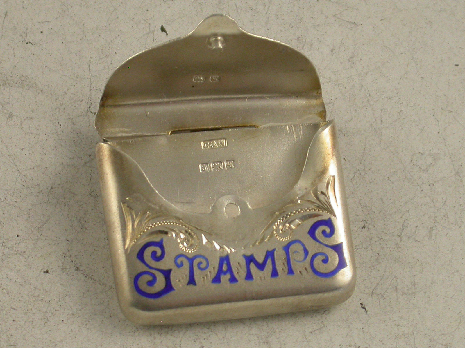 A good George V silver Stamp Case of envelope form with hinged lid, the body with engraved decoration and the word 'Stamps' highlighted in blue enamel.