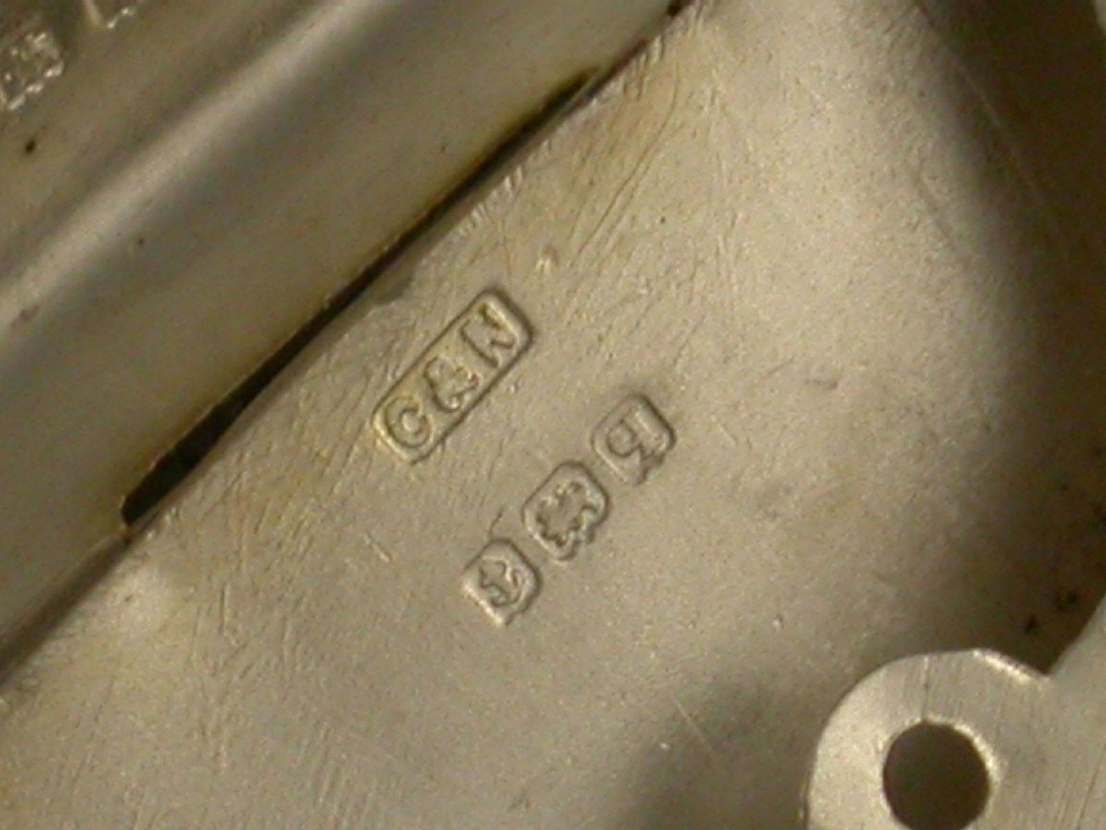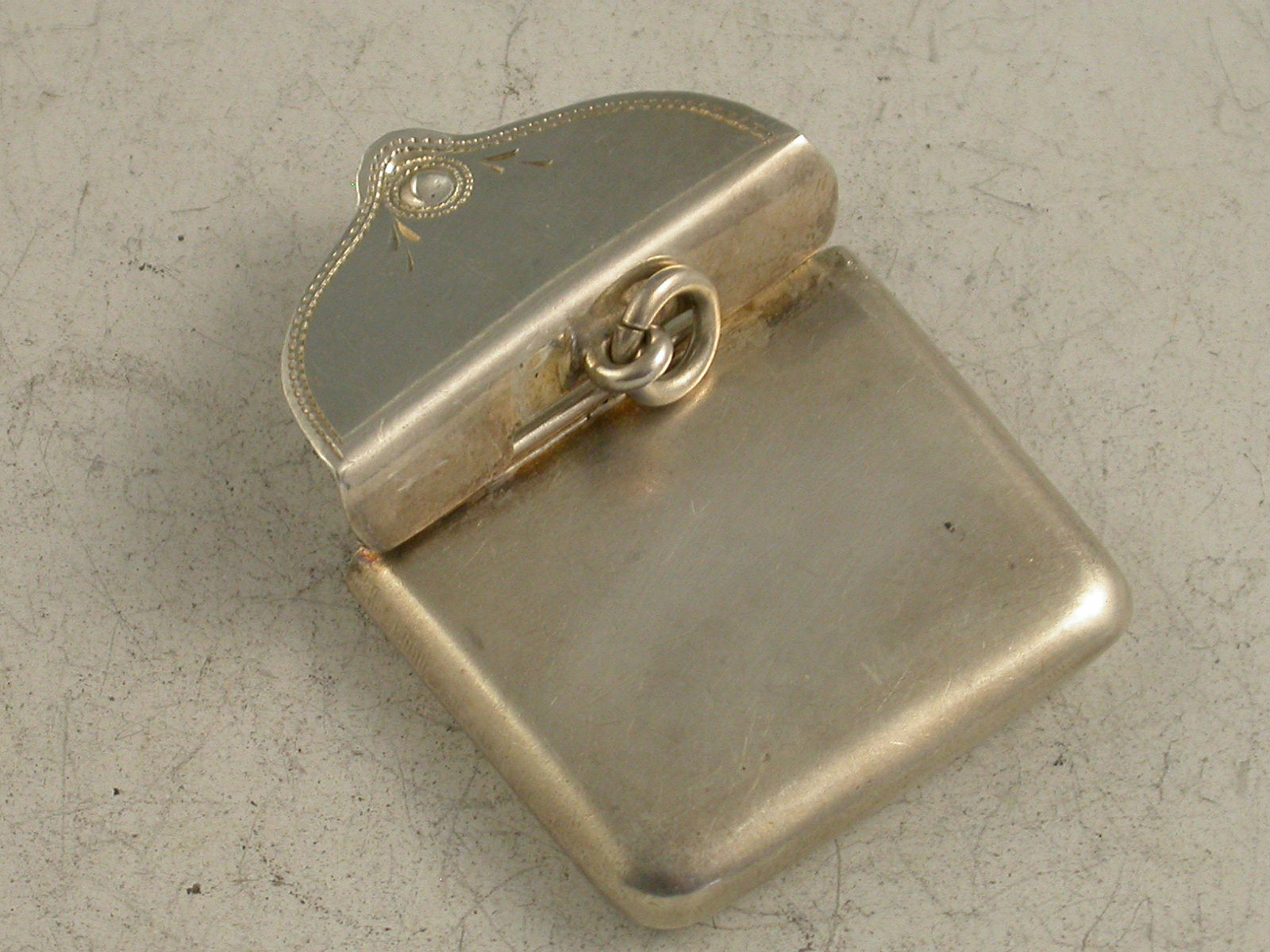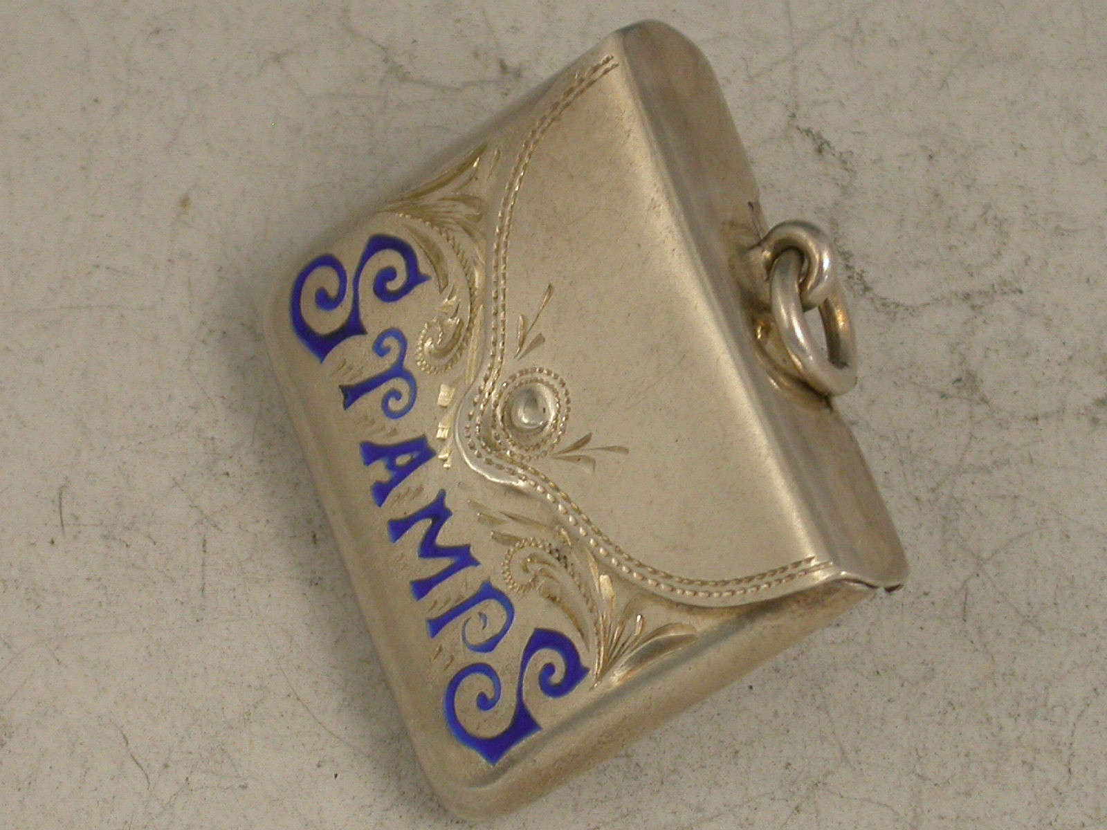 A good George V silver Stamp Case of envelope form with hinged lid, the body with engraved decoration and the word 'Stamps' highlighted in blue enamel.