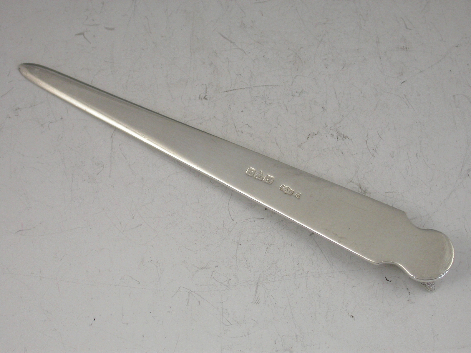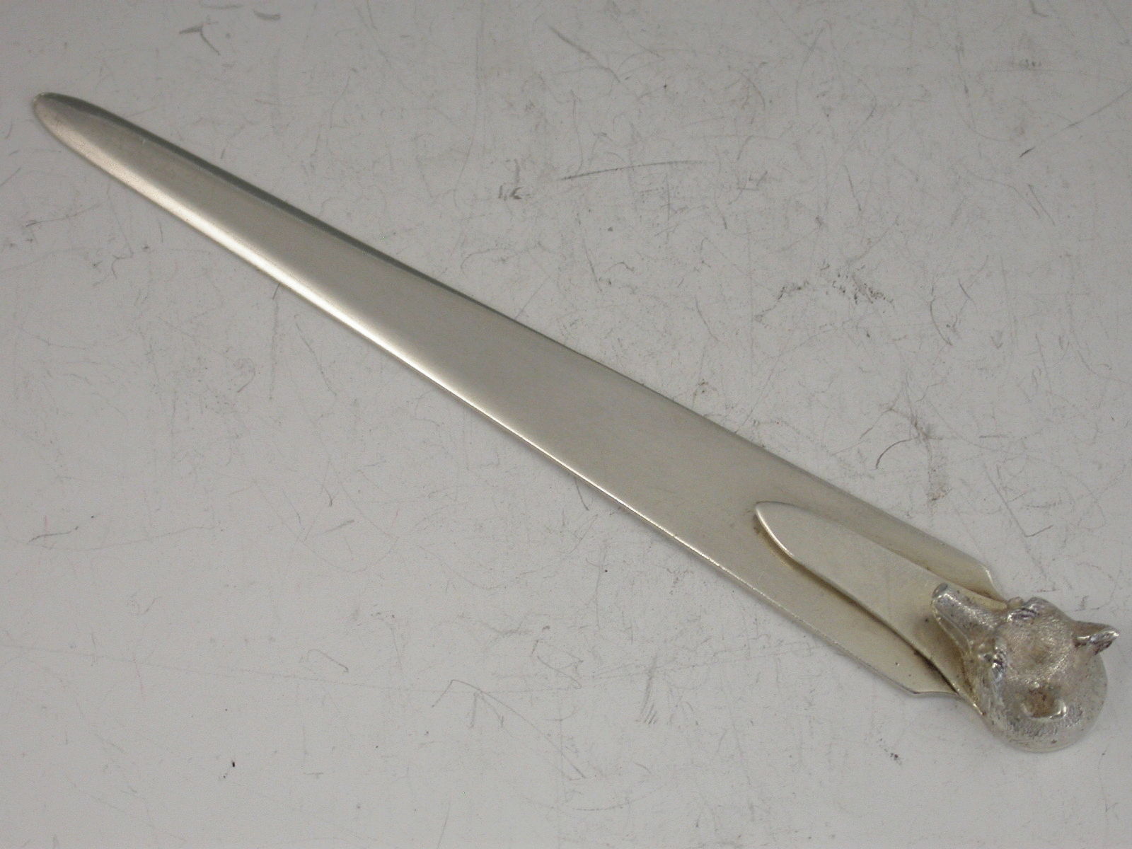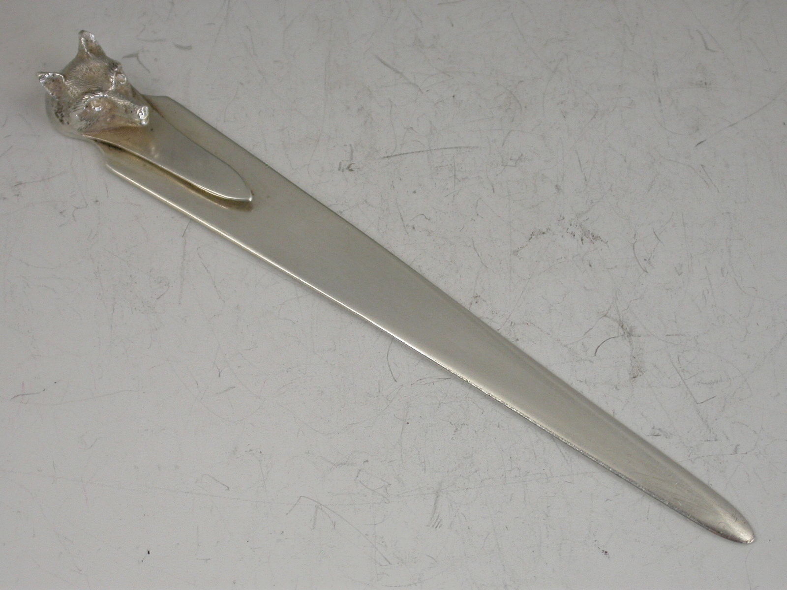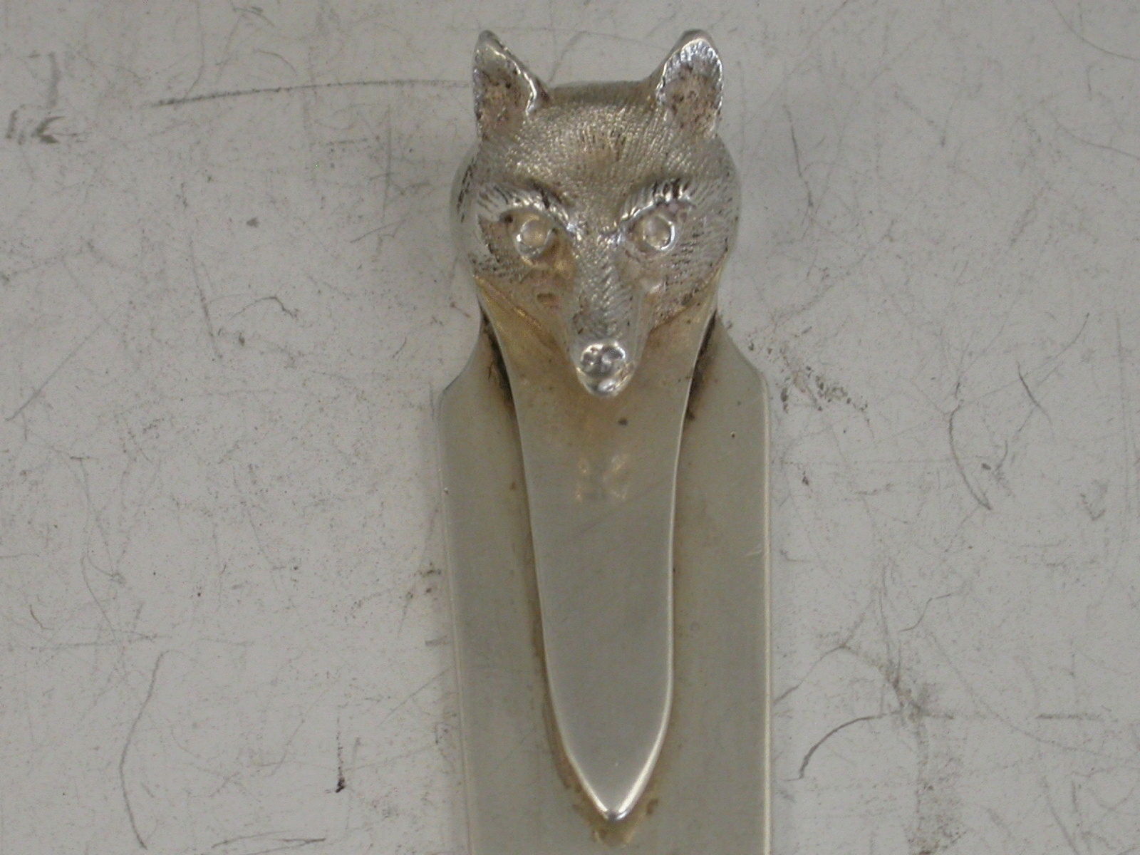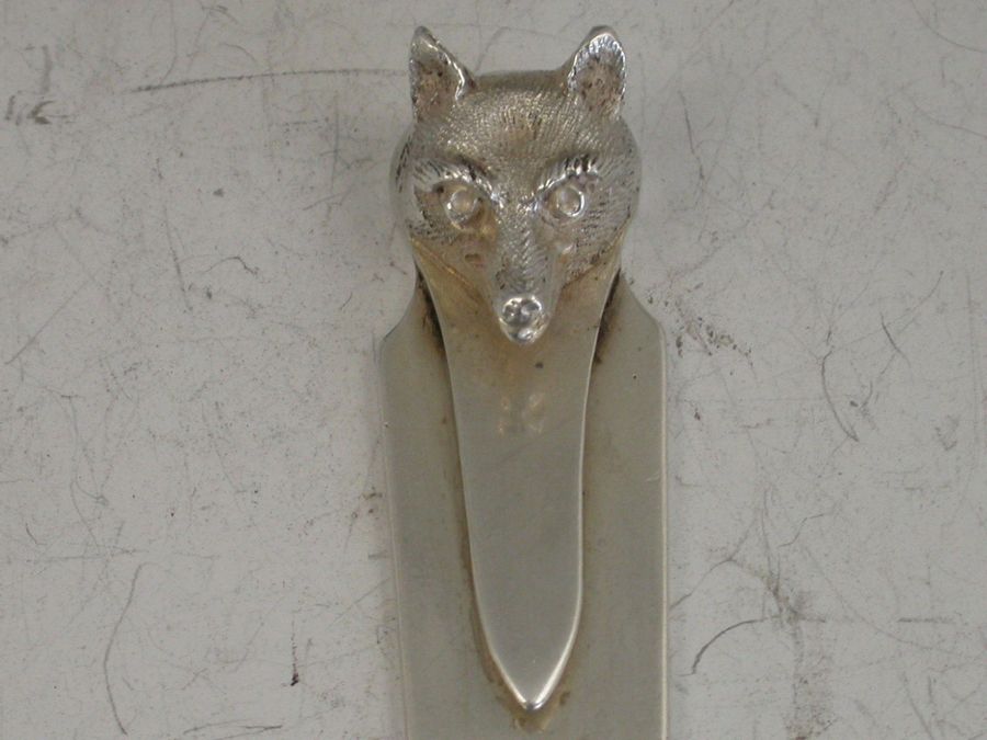 A fine quality George V silver Bookmark / Paperknife with plain tapering blades and cast fox head terminal.