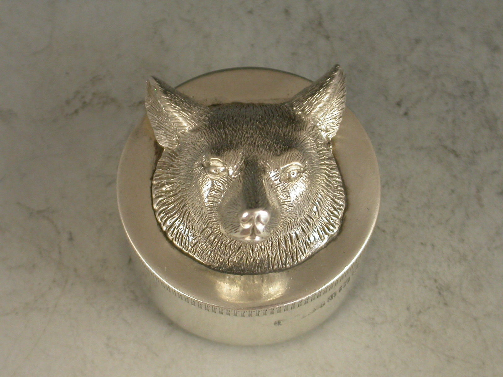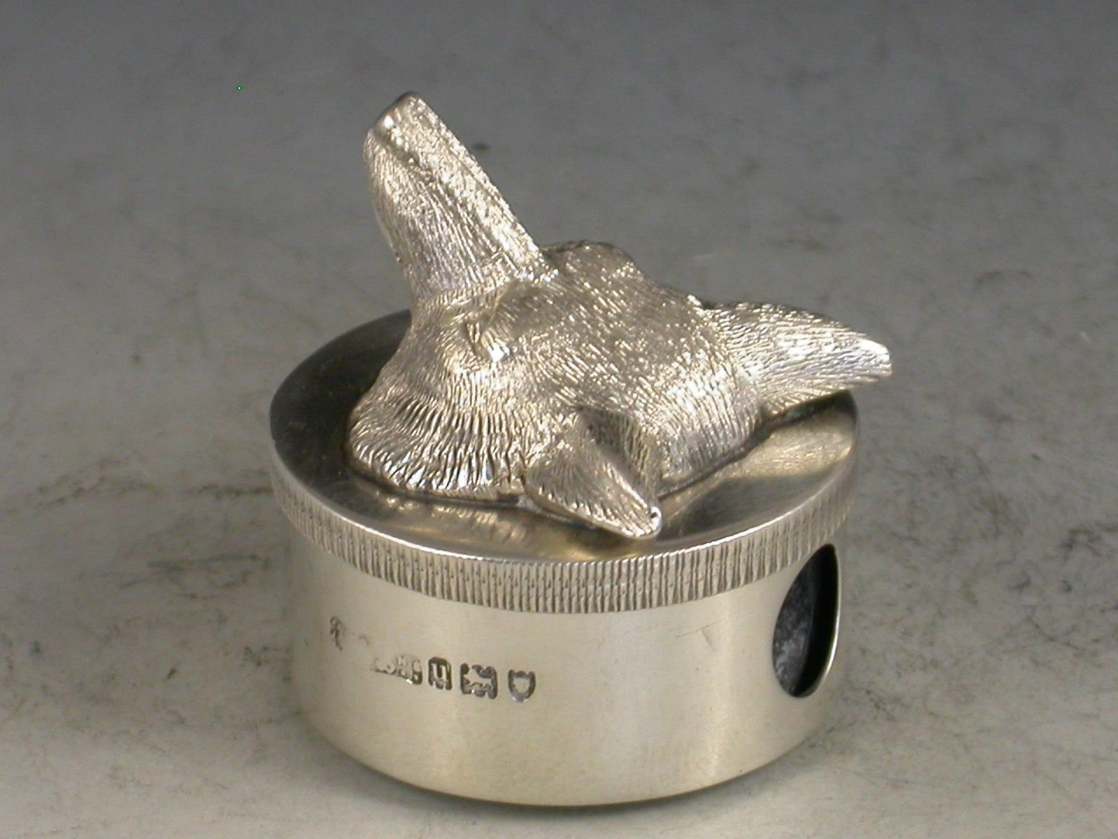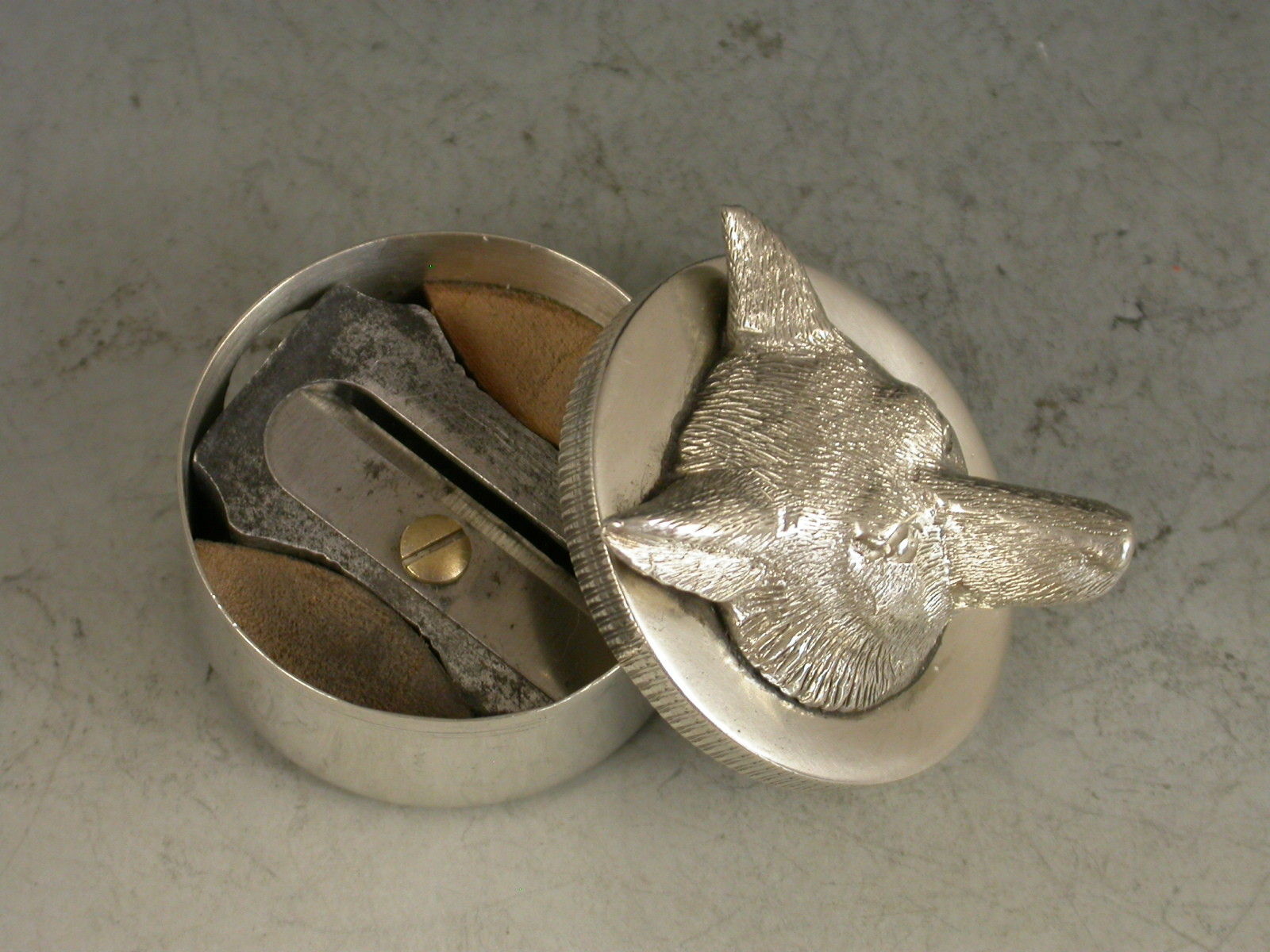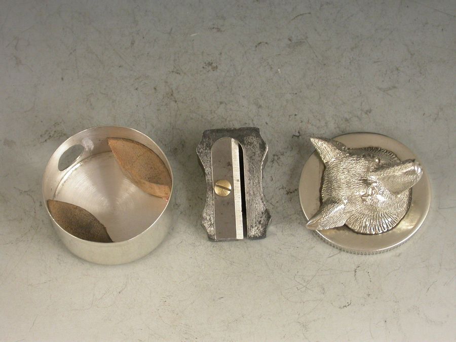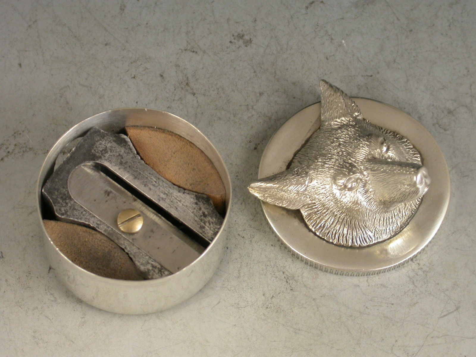 A nice quality early 20th century silver Pocket Pencil Sharpener of circular form with pull-off lid. Complete with original vintage Dux German metal pencil sharpener. The lid applied with a cast silver Foxes head.