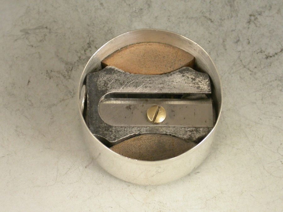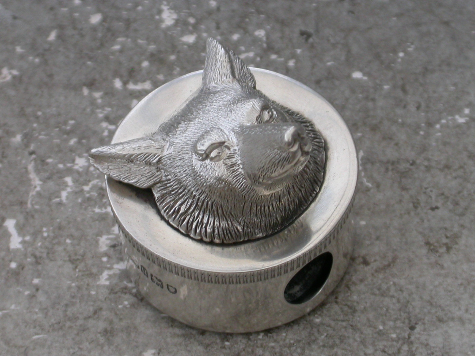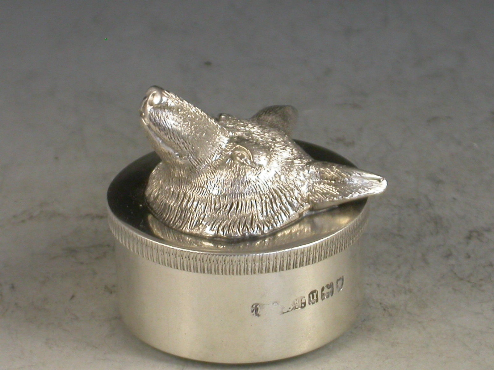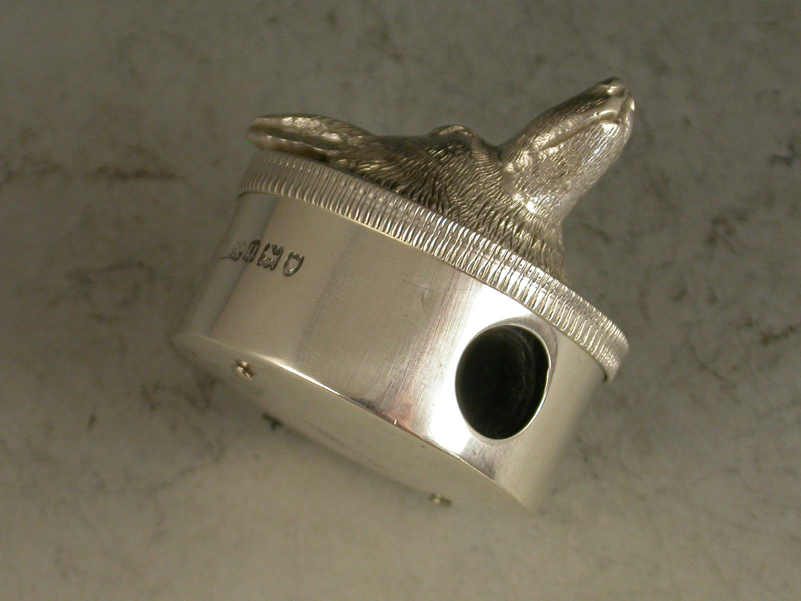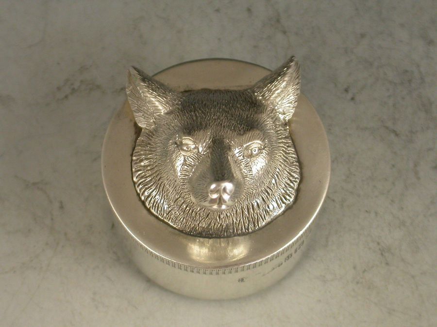 A nice quality early 20th century silver Pocket Pencil Sharpener of circular form with pull-off lid. Complete with original vintage Dux German metal pencil sharpener. The lid applied with a cast silver Foxes head.