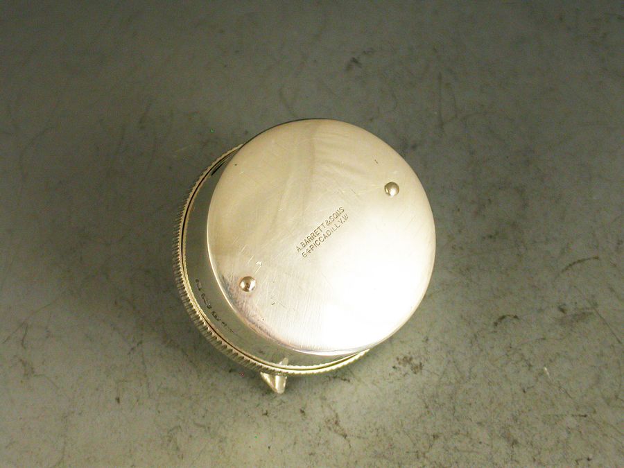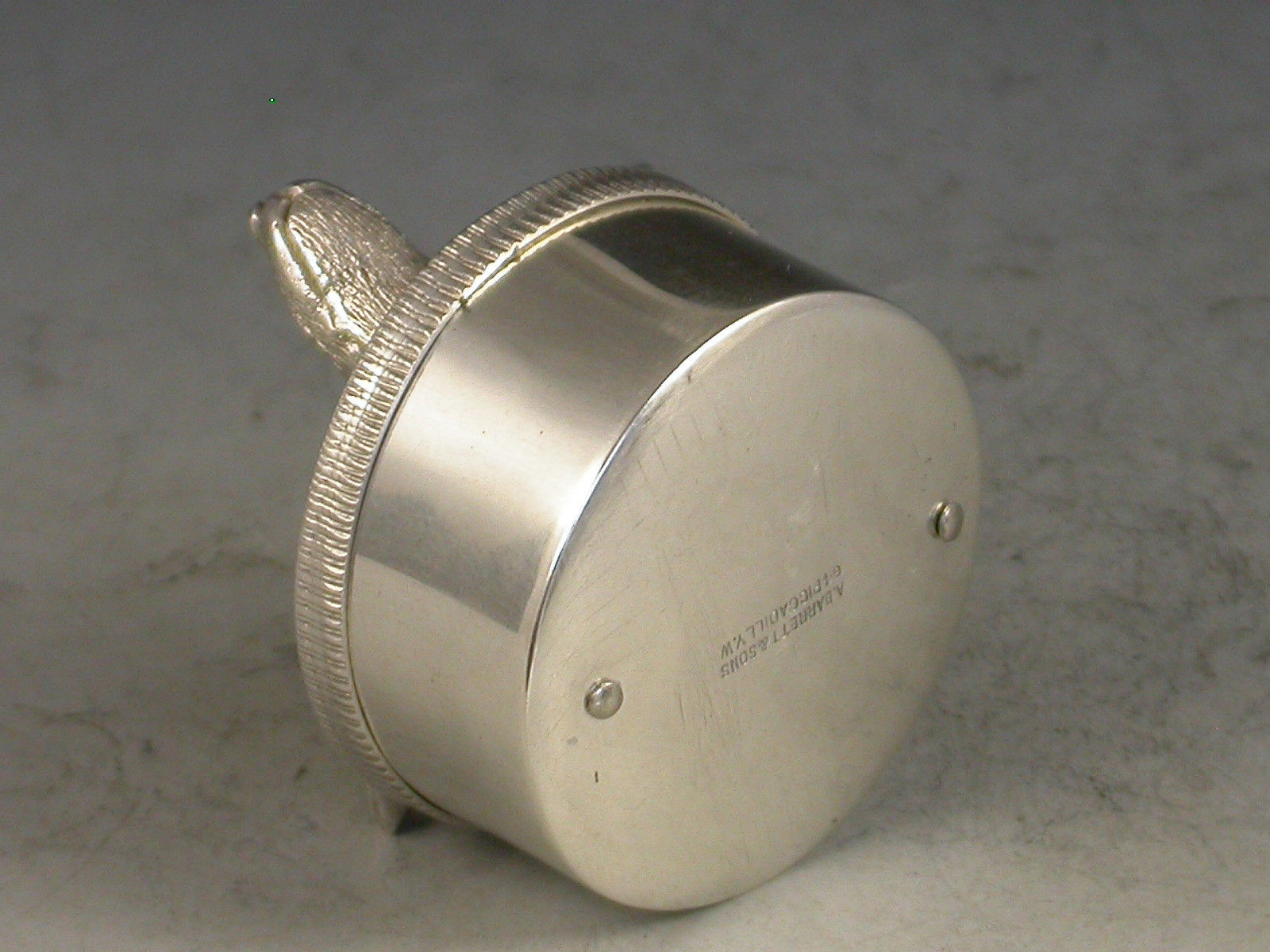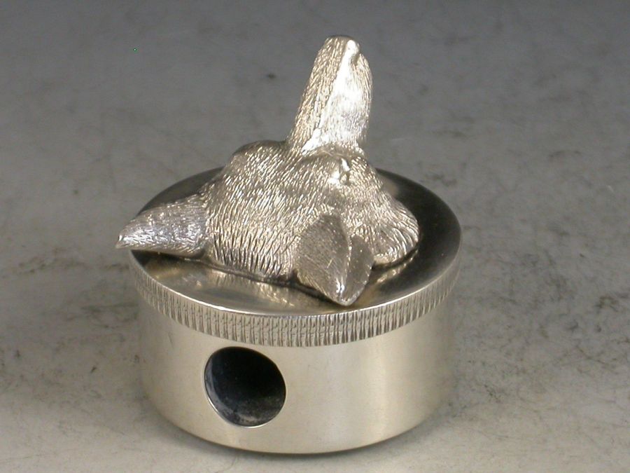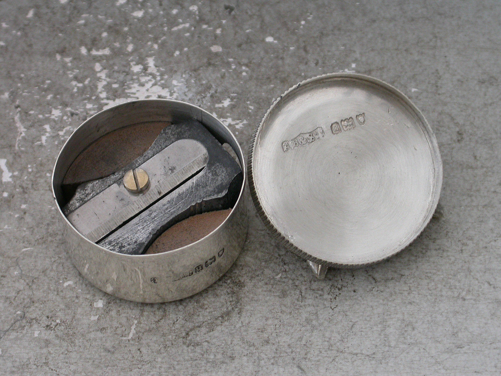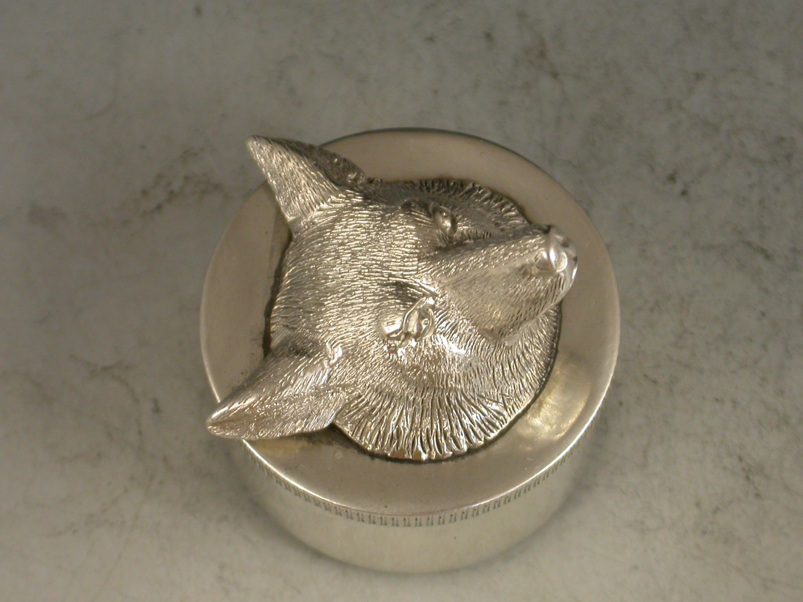 A nice quality early 20th century silver Pocket Pencil Sharpener of circular form with pull-off lid. Complete with original vintage Dux German metal pencil sharpener. The lid applied with a cast silver Foxes head.