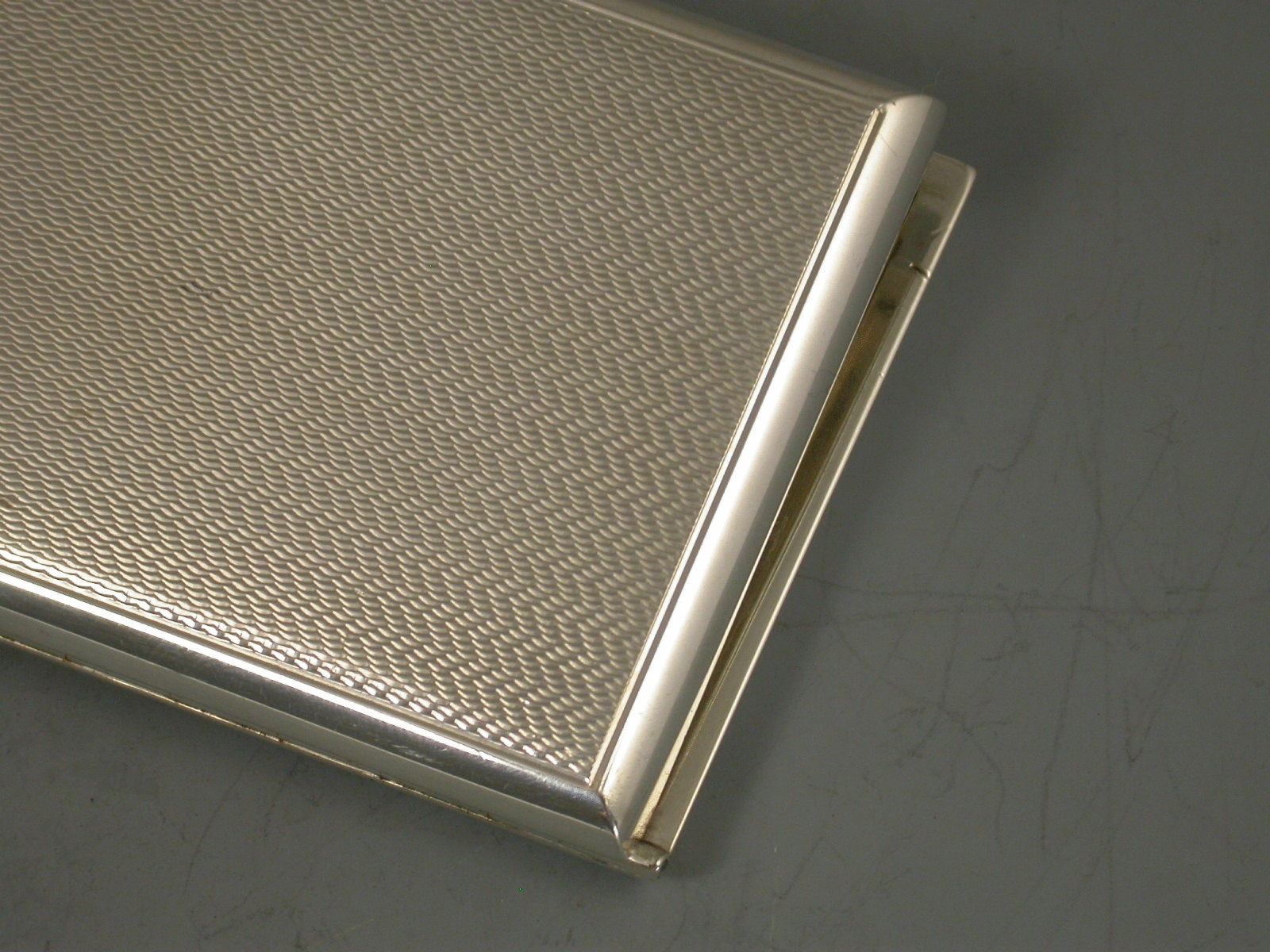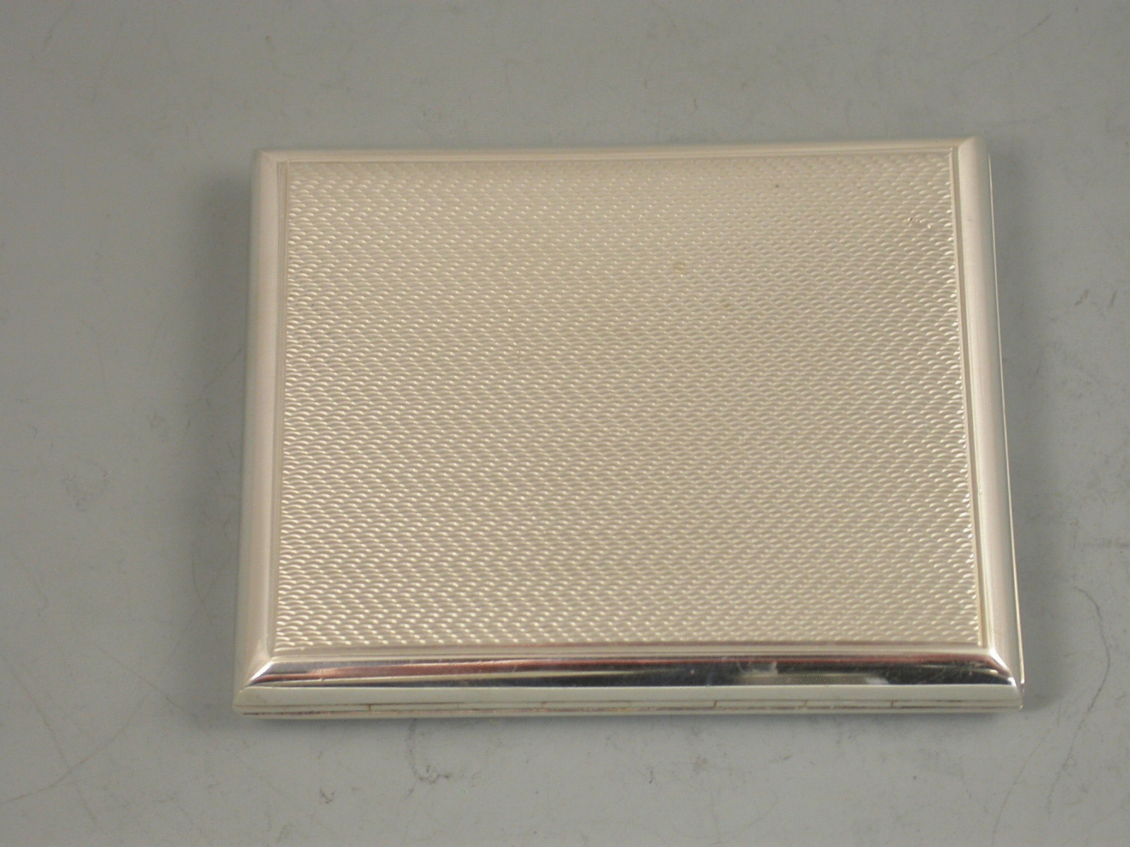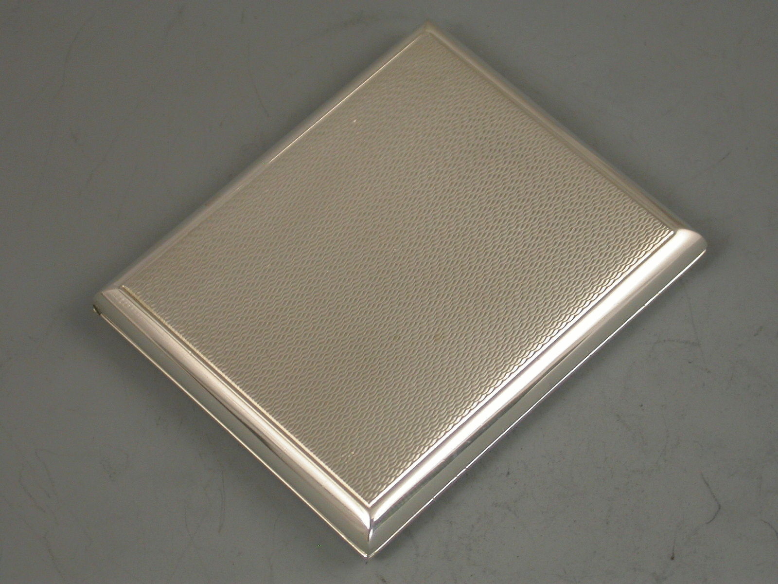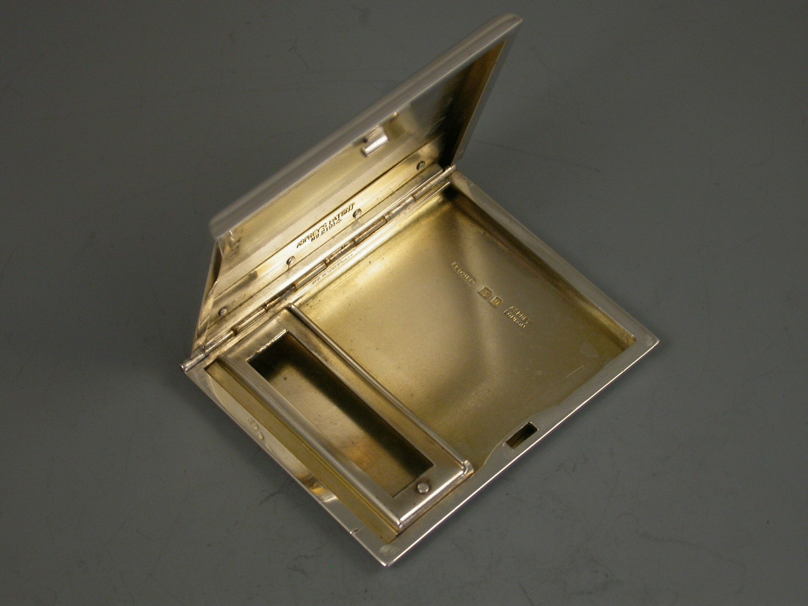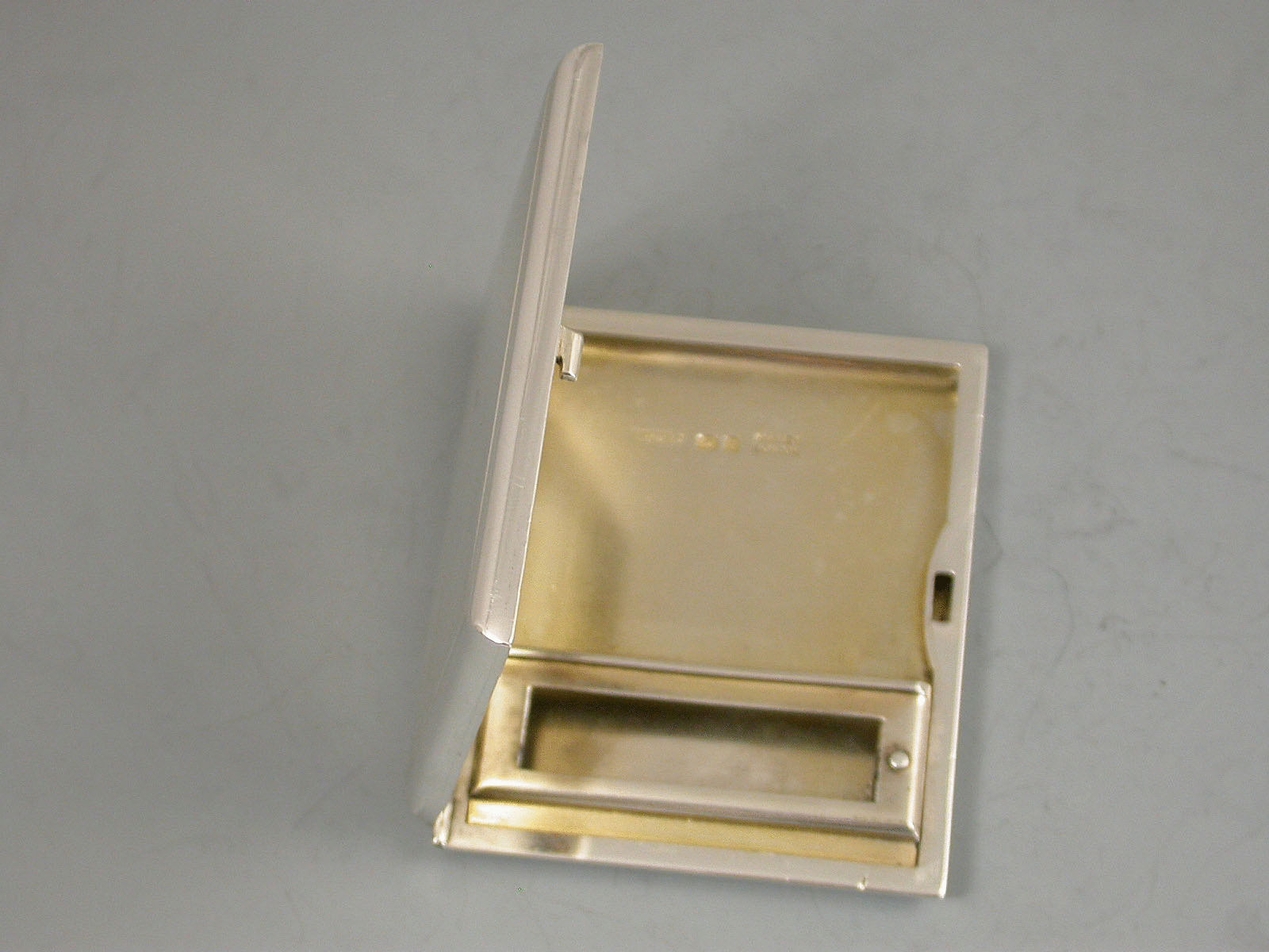 A George V novelty silver Patented Match Book Case in the form of an engine turned Cigarette Case, with trick opening slide action sprung hinged cover, silver gilt interior.