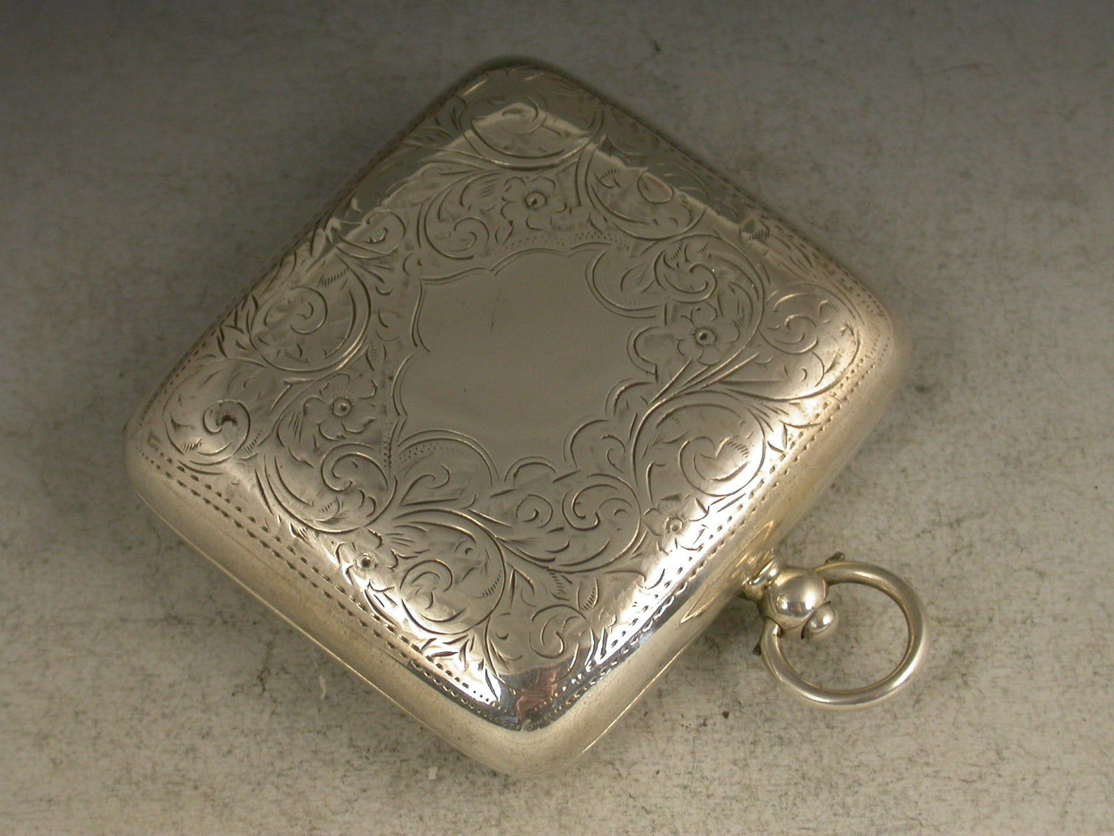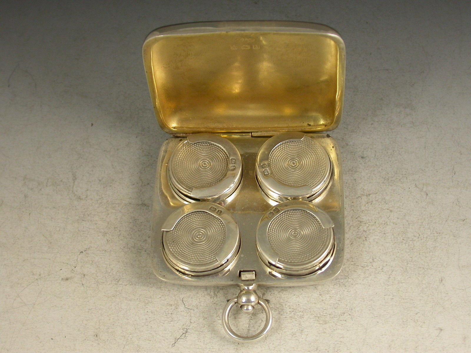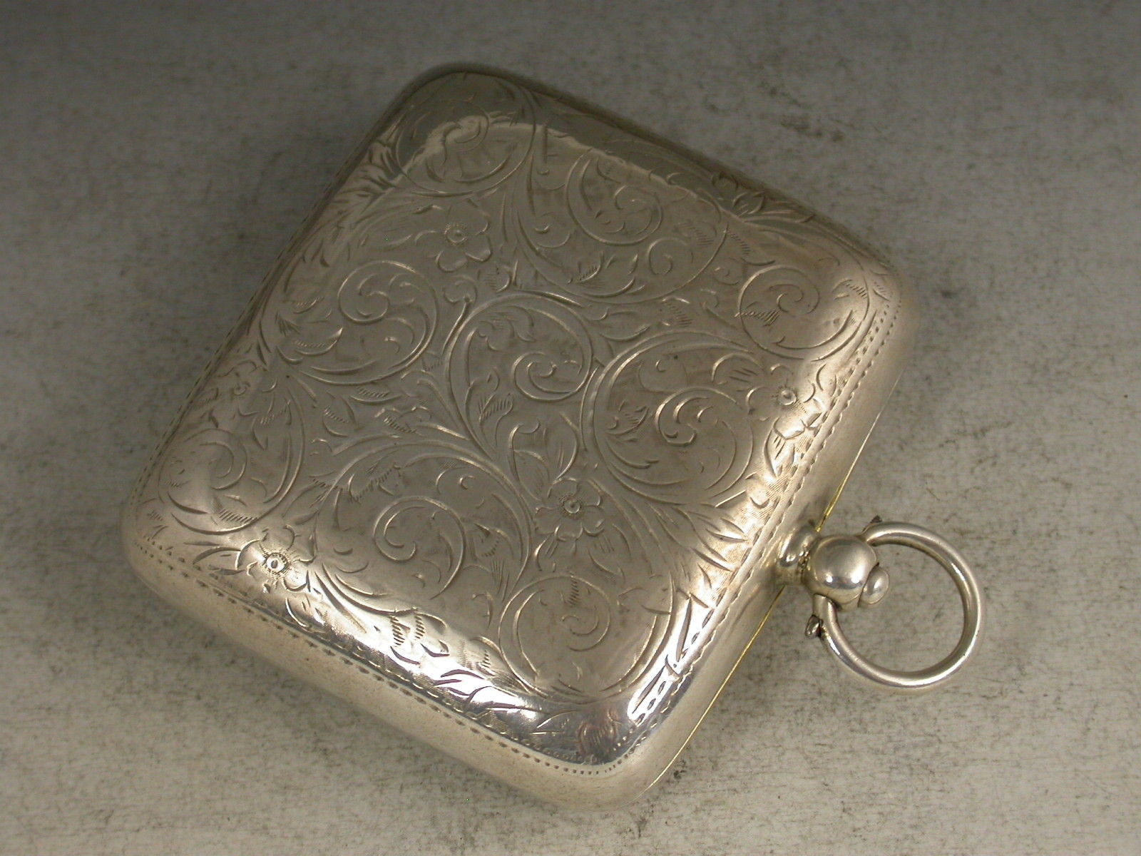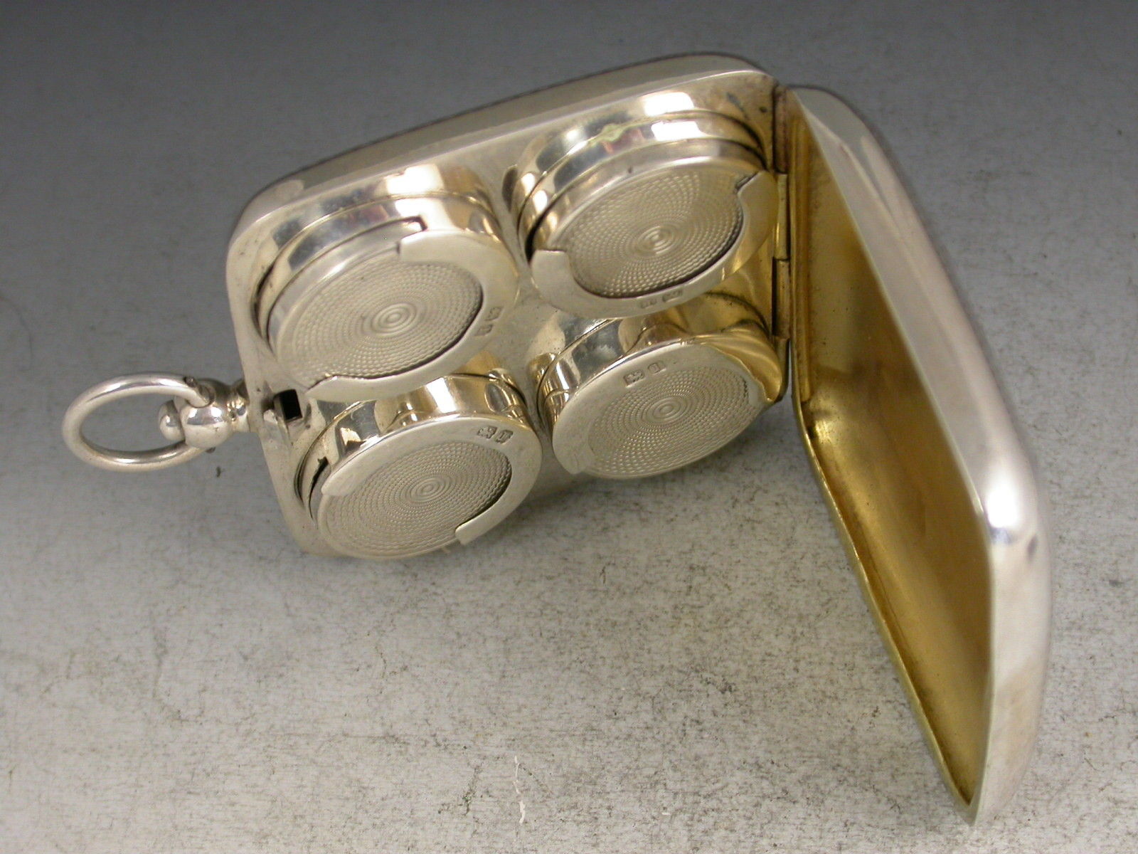 A rare George V silver quadruple Sovereign Case of rounded rectangular form, the lid and base with foliate scroll engraved decoration, push button opening mechanism with attached suspension ring, the interior with four sprung sovereign holders.