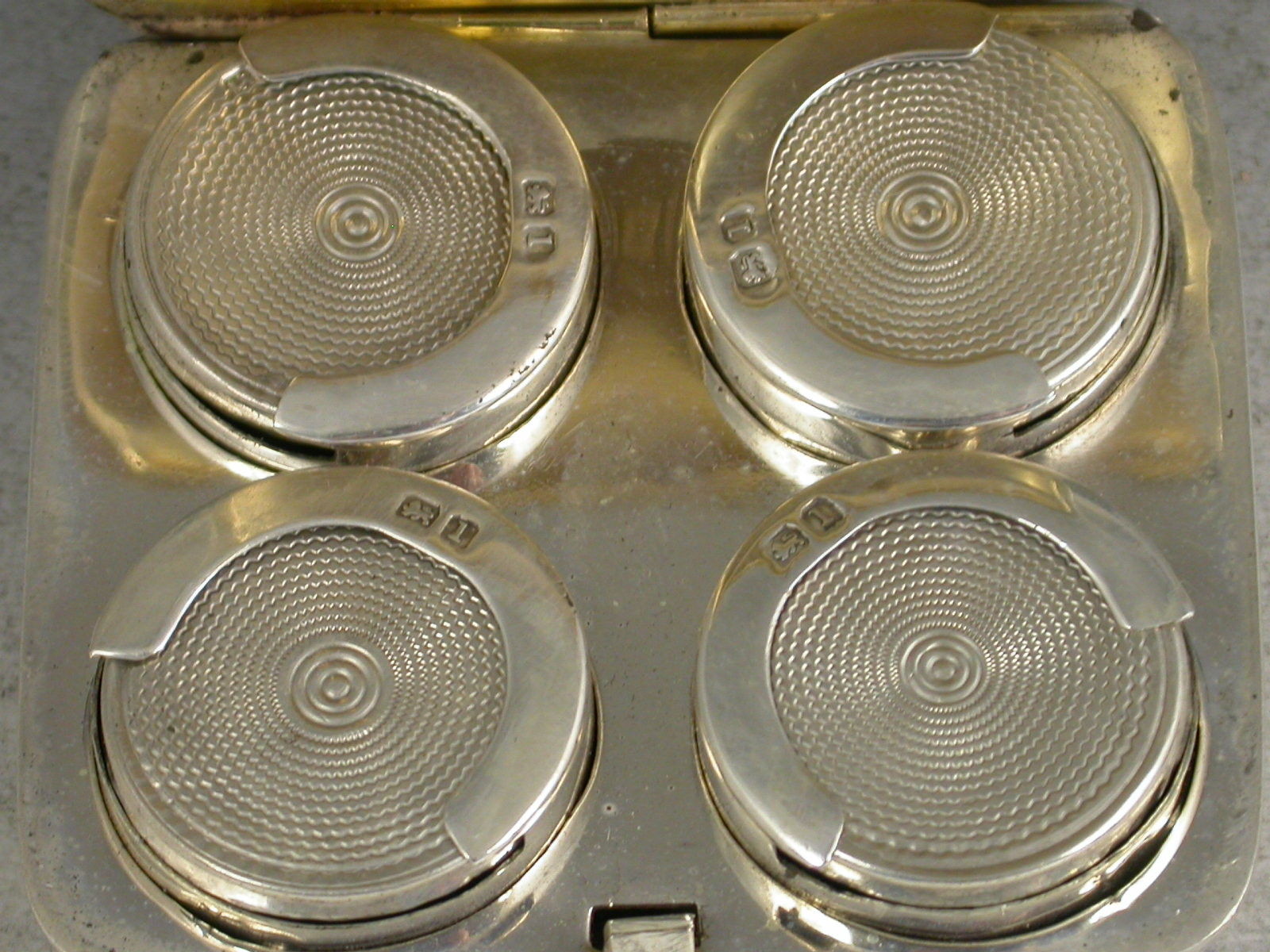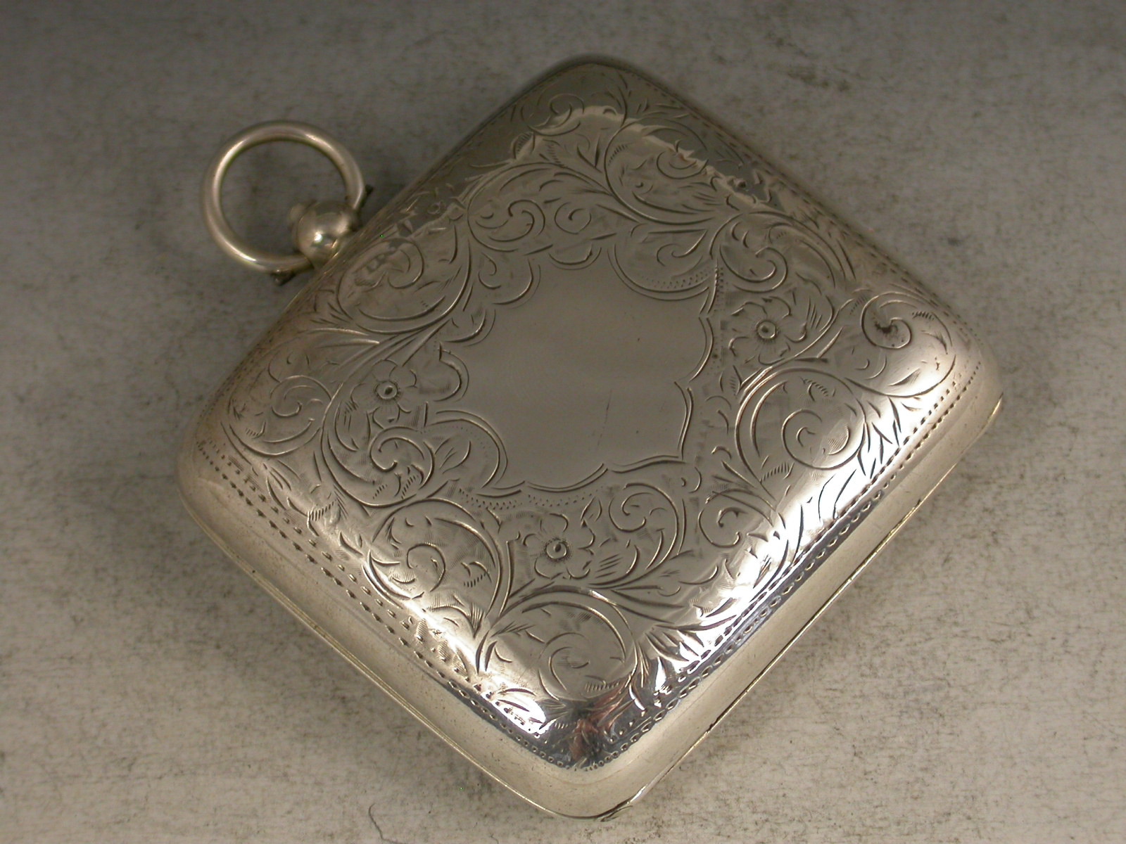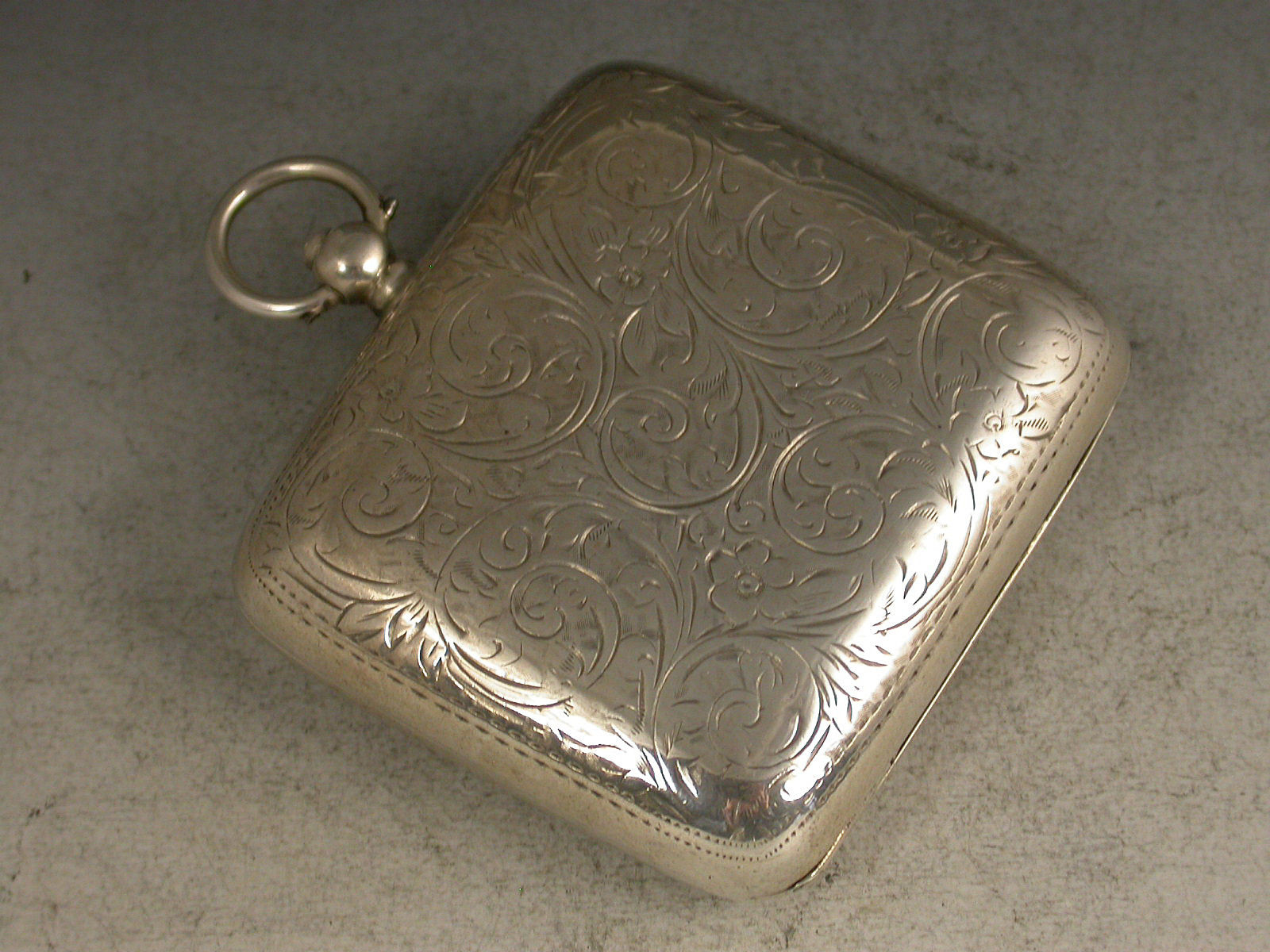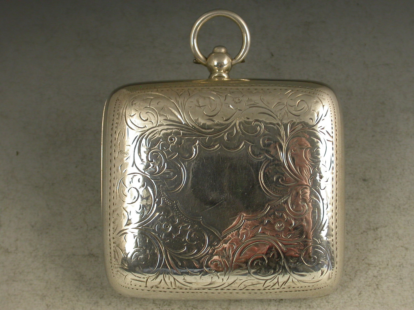 A rare George V silver quadruple Sovereign Case of rounded rectangular form, the lid and base with foliate scroll engraved decoration, push button opening mechanism with attached suspension ring, the interior with four sprung sovereign holders.