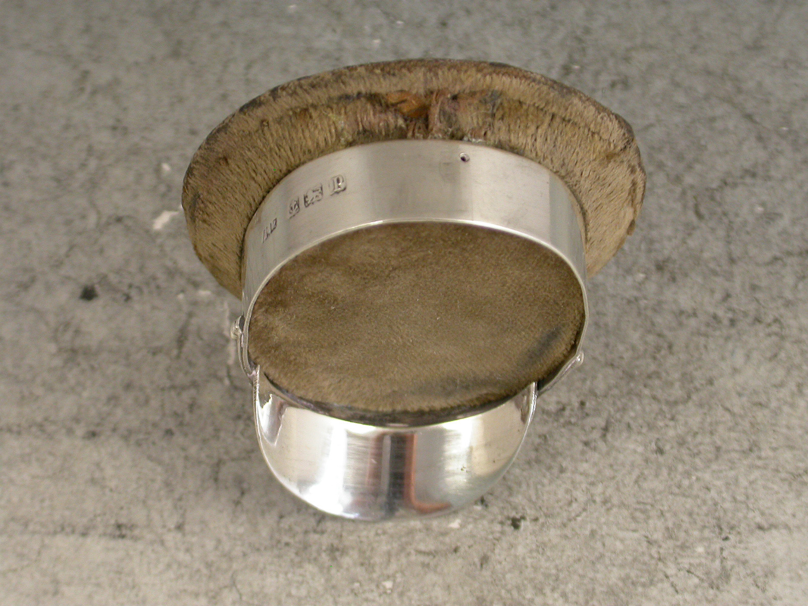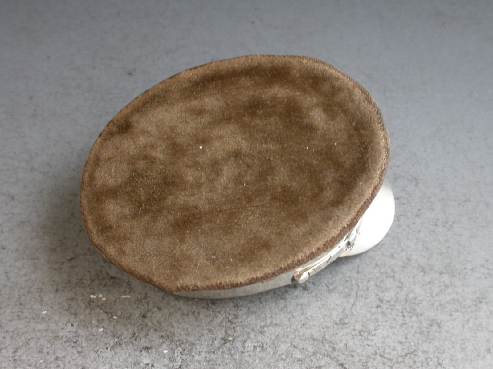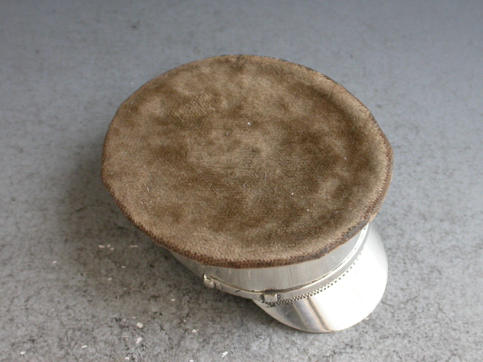 A fine and rare early 20th century silver mounted Pin Cushion made in the form of a World War 1 Army Officers Hat, the wooden frame covered in brown velvet to simulate khaki.