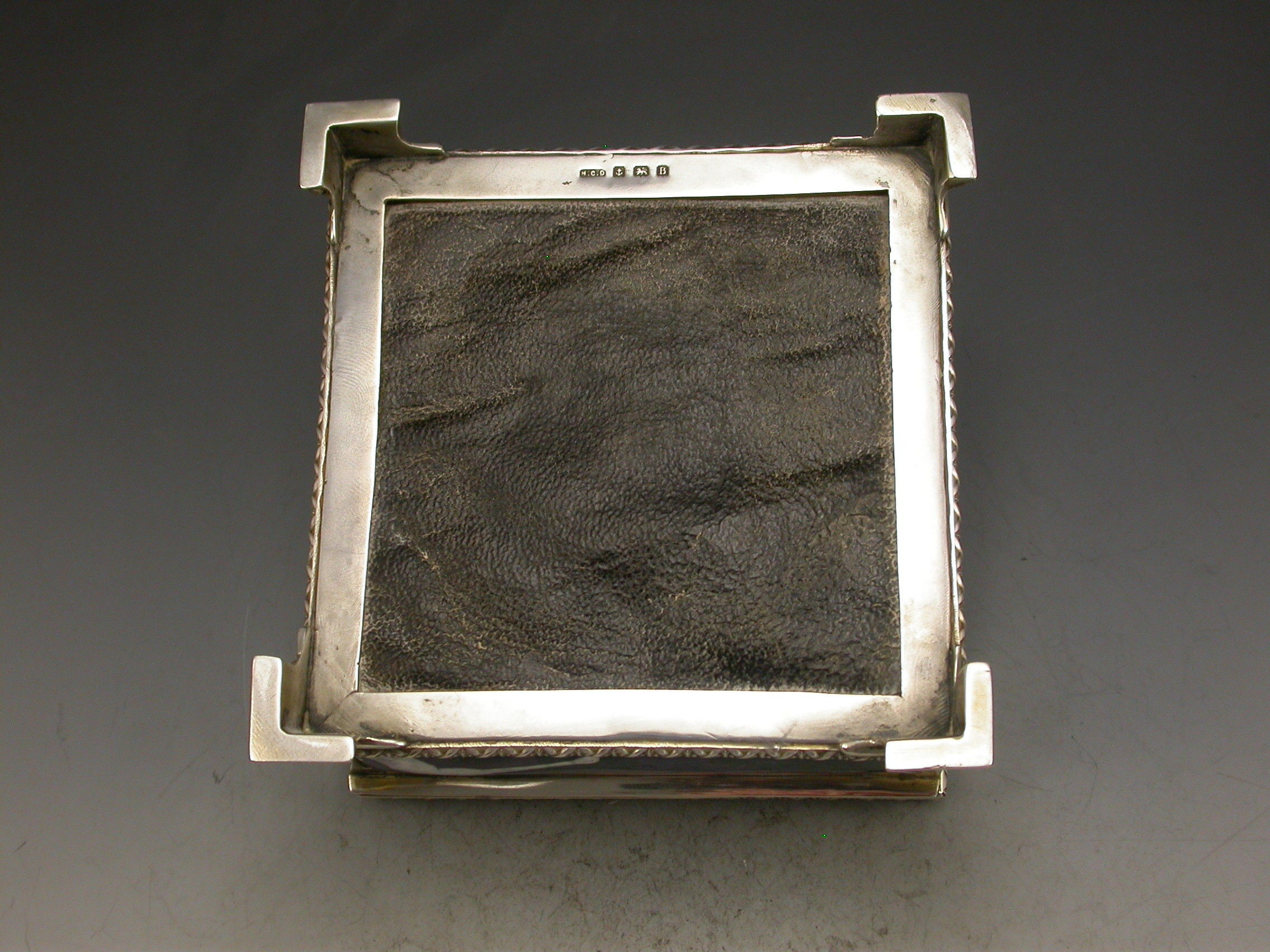 A stylish early 20th century silver mounted Cigarette Case of square form standing on four panel feet with raised borders, the lid and four sides set with enamel panels depicting a Ballerina and Swans in flight on a lilac and green background.