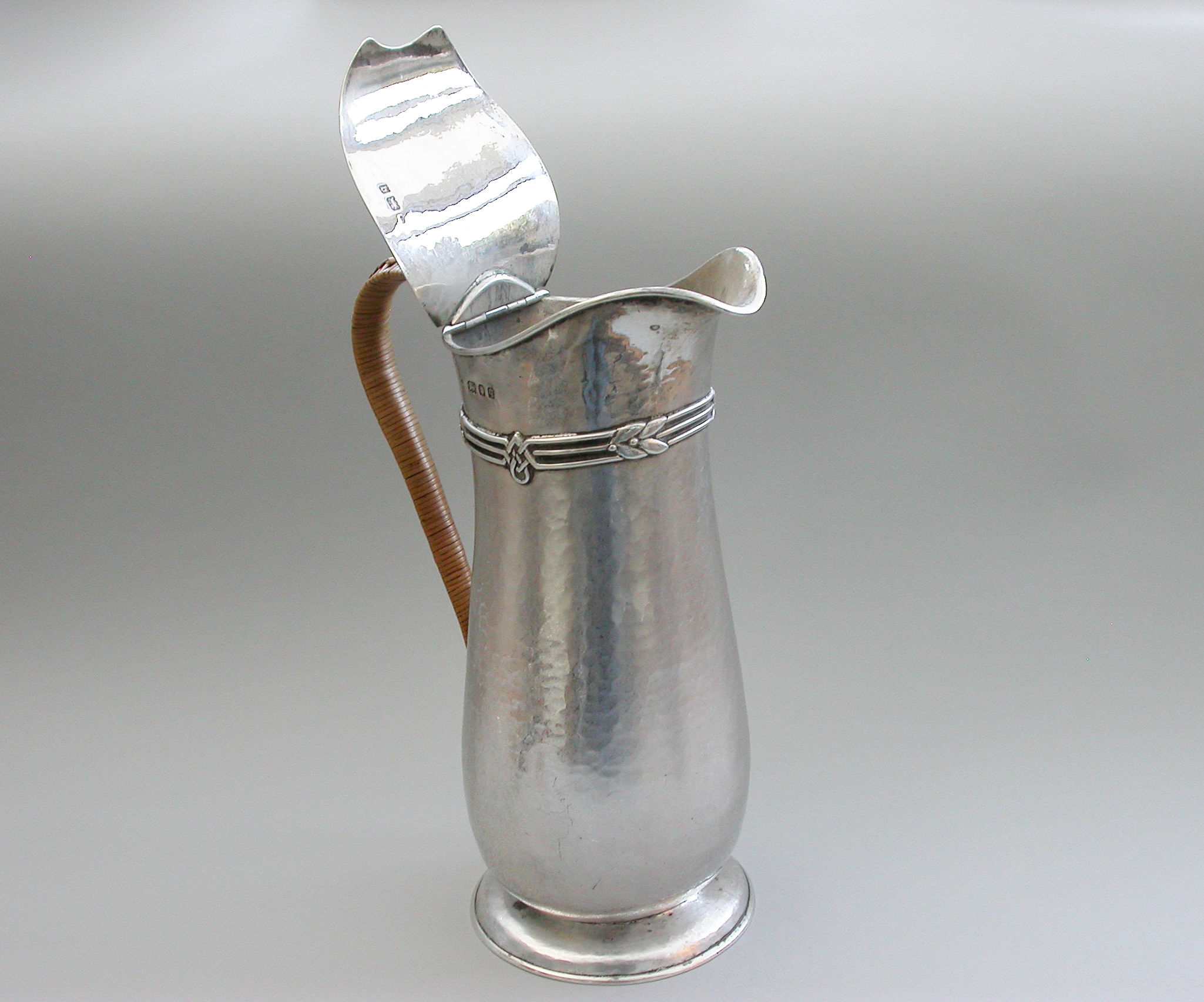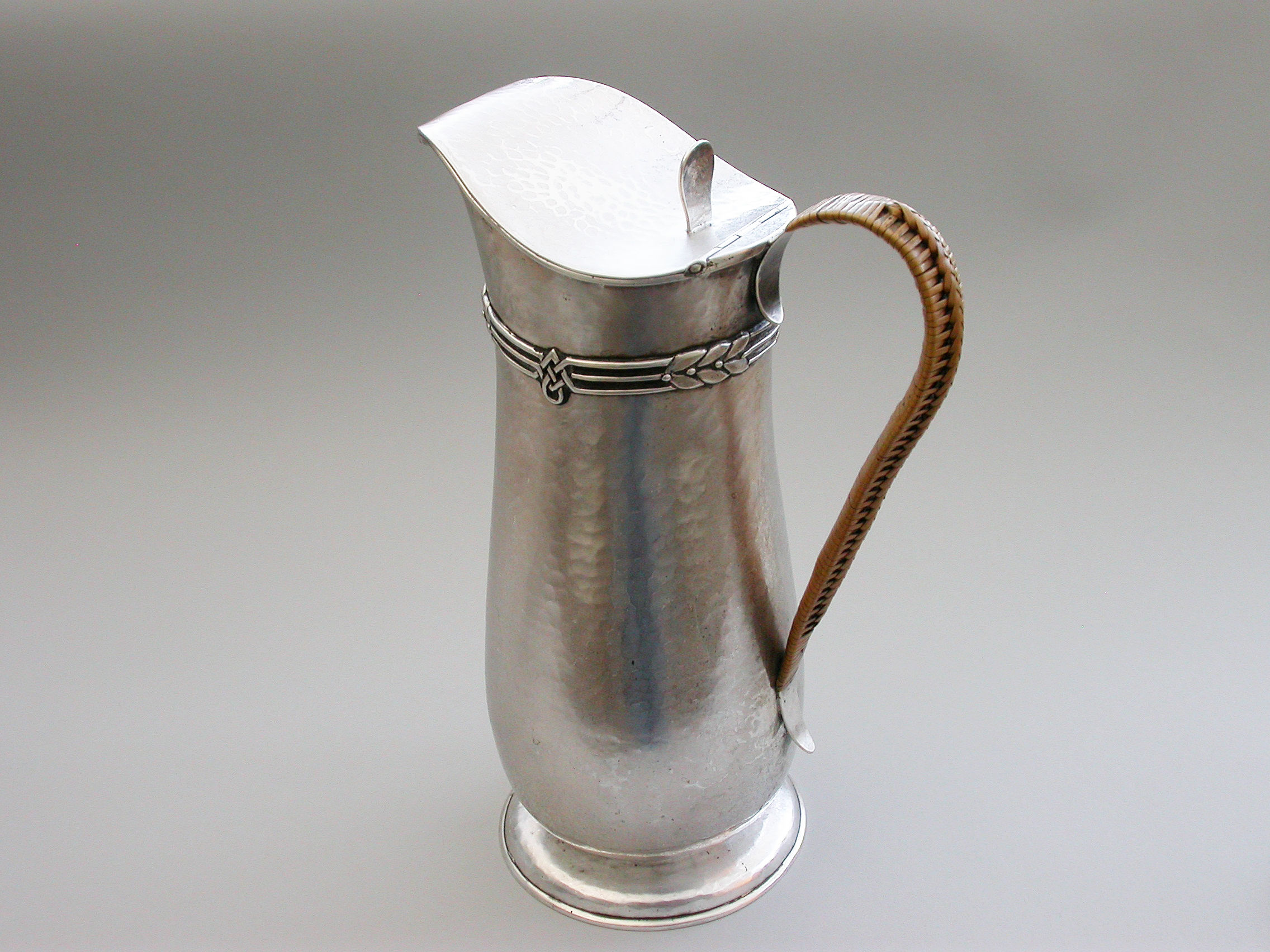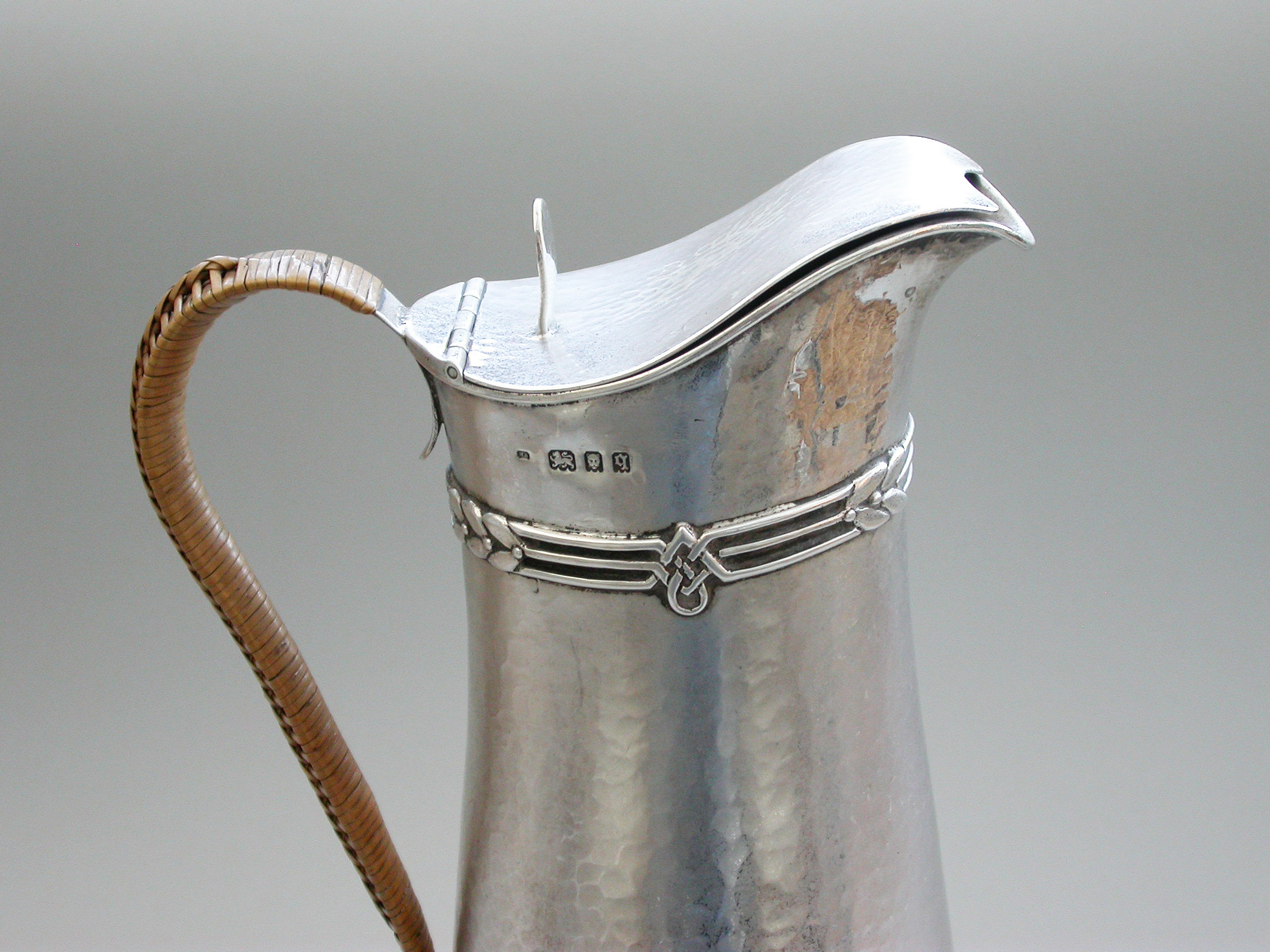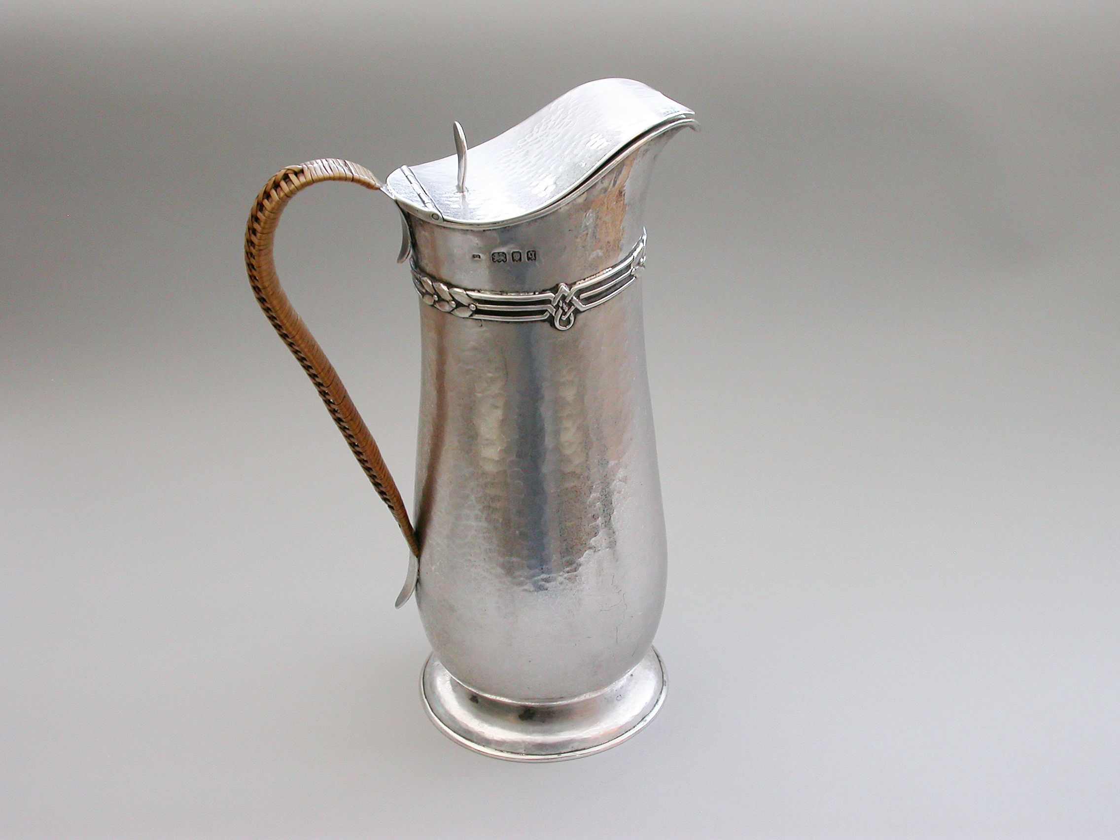 A good quality George V Arts & Crafts hammered silver lidded hot water Jug with wheat ear and Celtic designs around the neck, rattan braided handle.