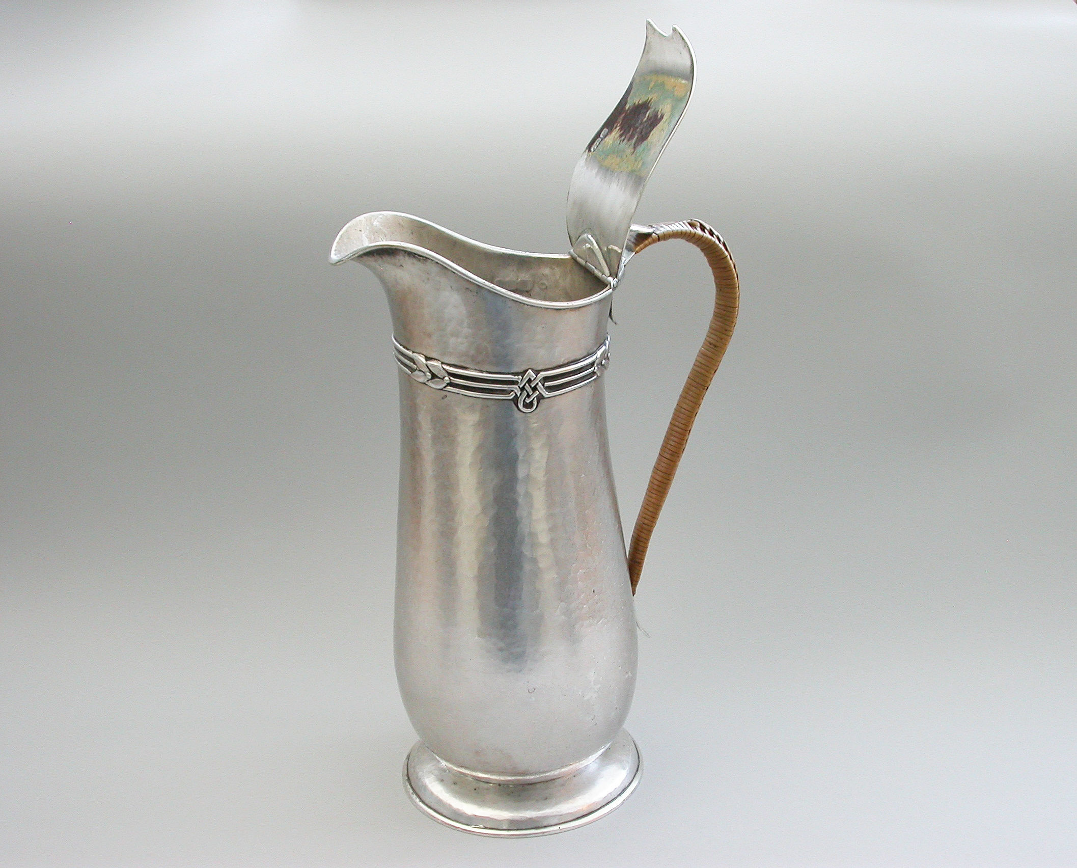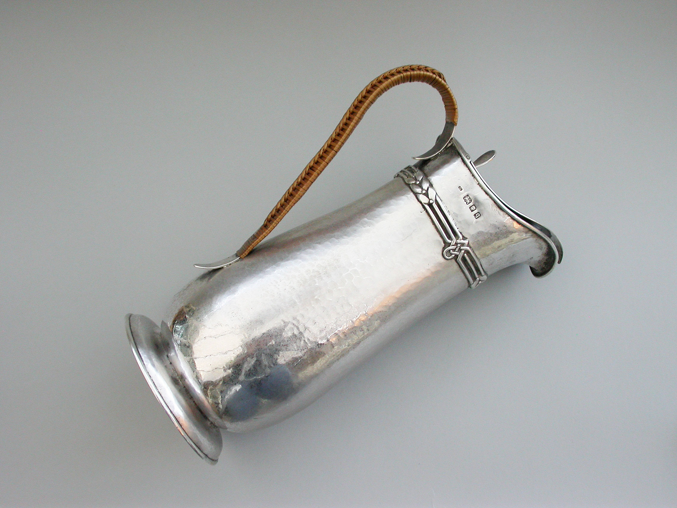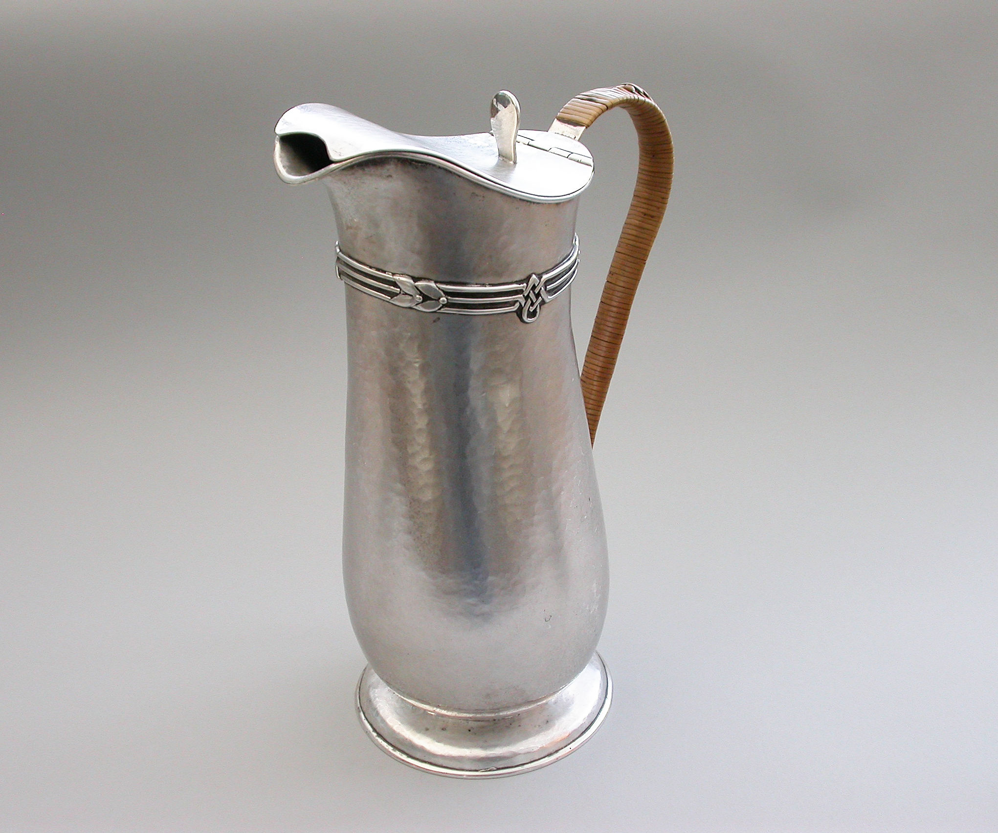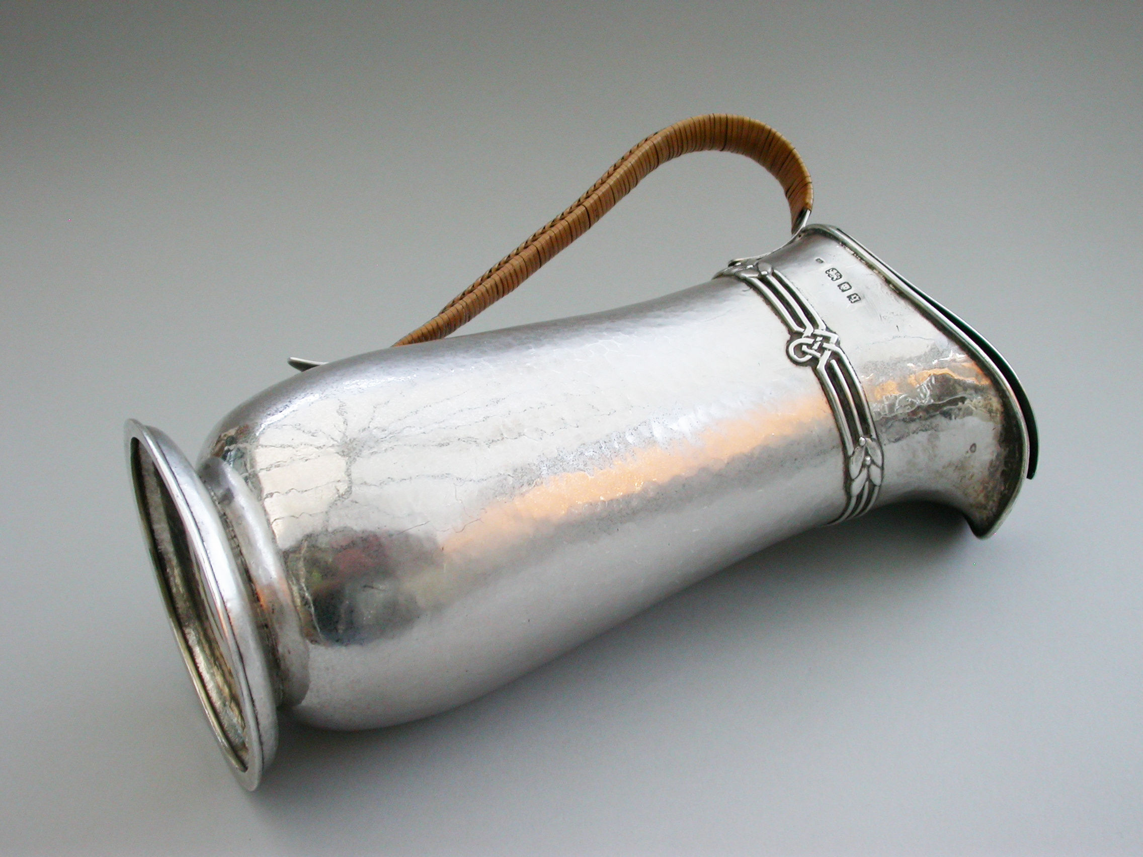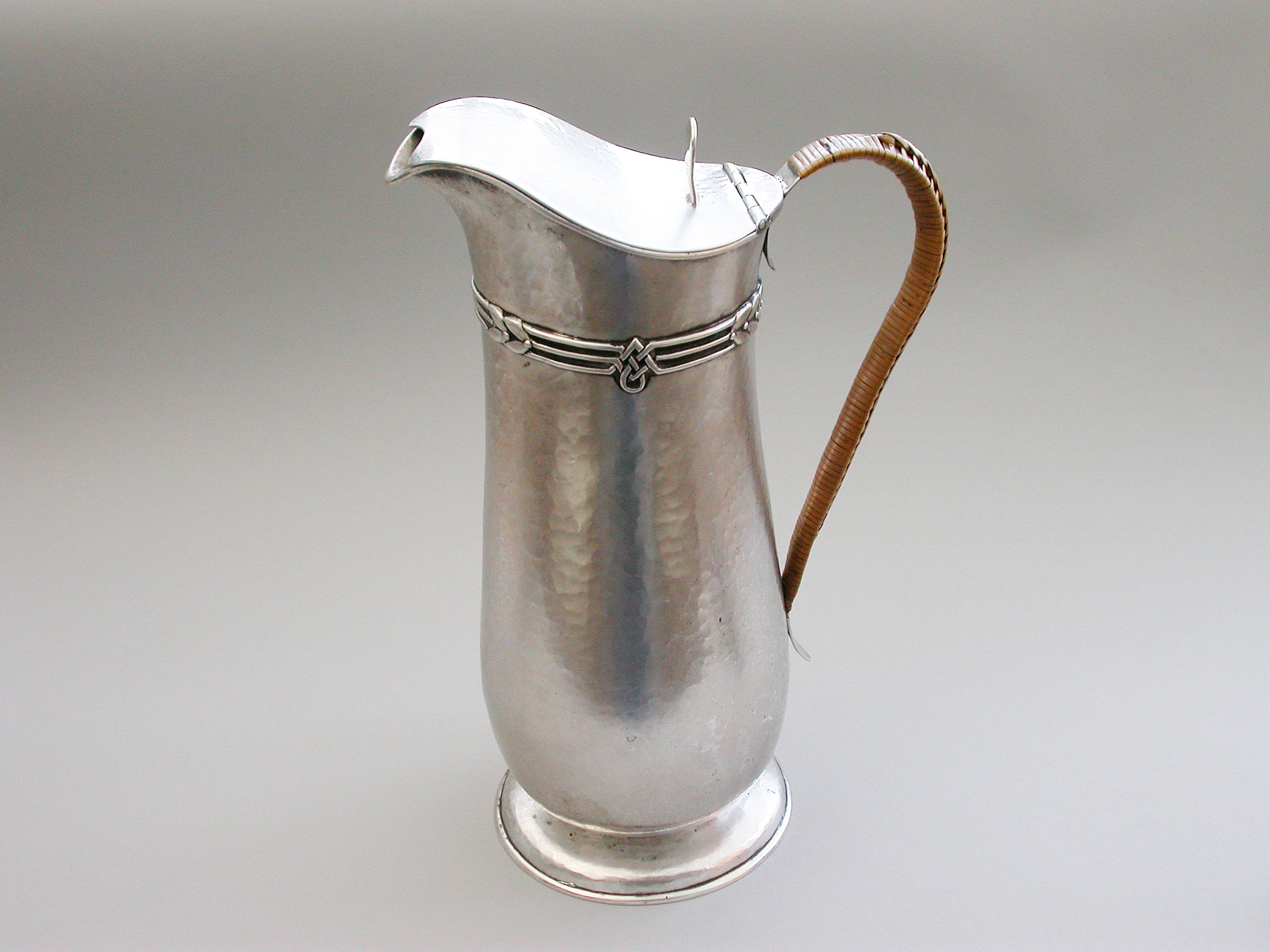 A good quality George V Arts & Crafts hammered silver lidded hot water Jug with wheat ear and Celtic designs around the neck, rattan braided handle.