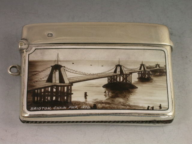 A rare George V silver and enamel Vesta Case of large elongated curved rectangular form with hinged flat flip top lid and attached suspension ring. The fine sepia enamelled panel to the front depicting Brighton Chain Pier and dated 1870.