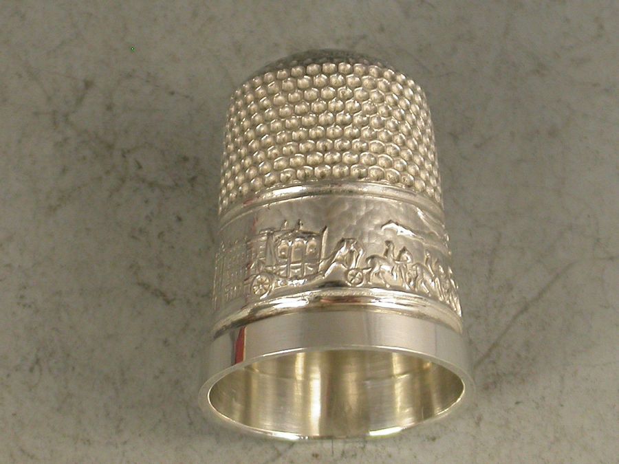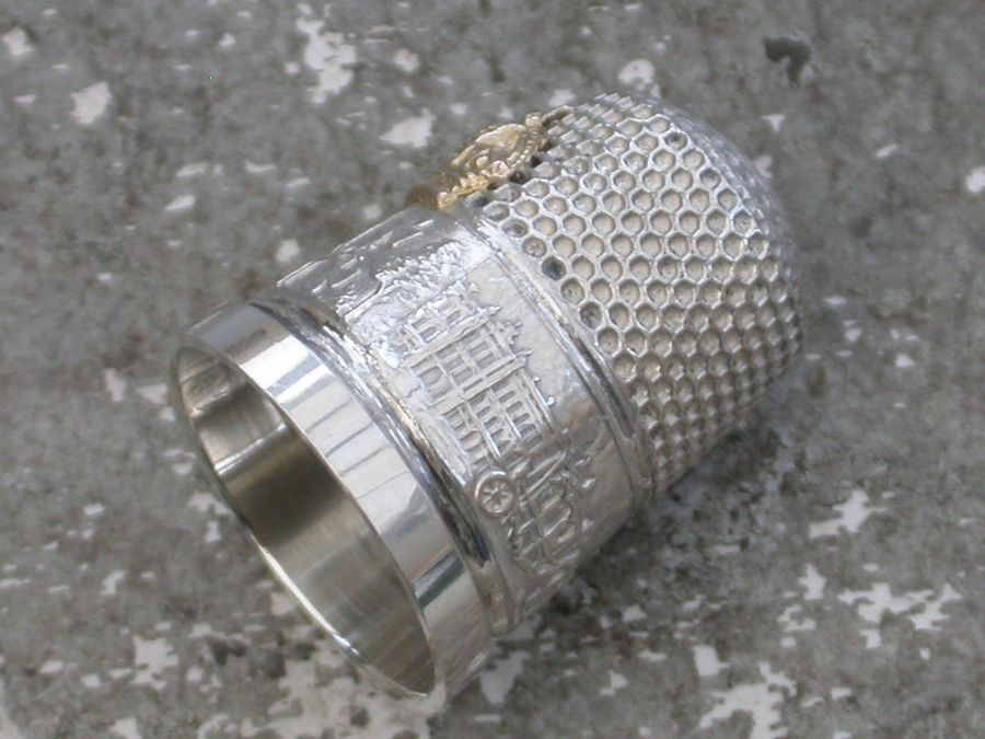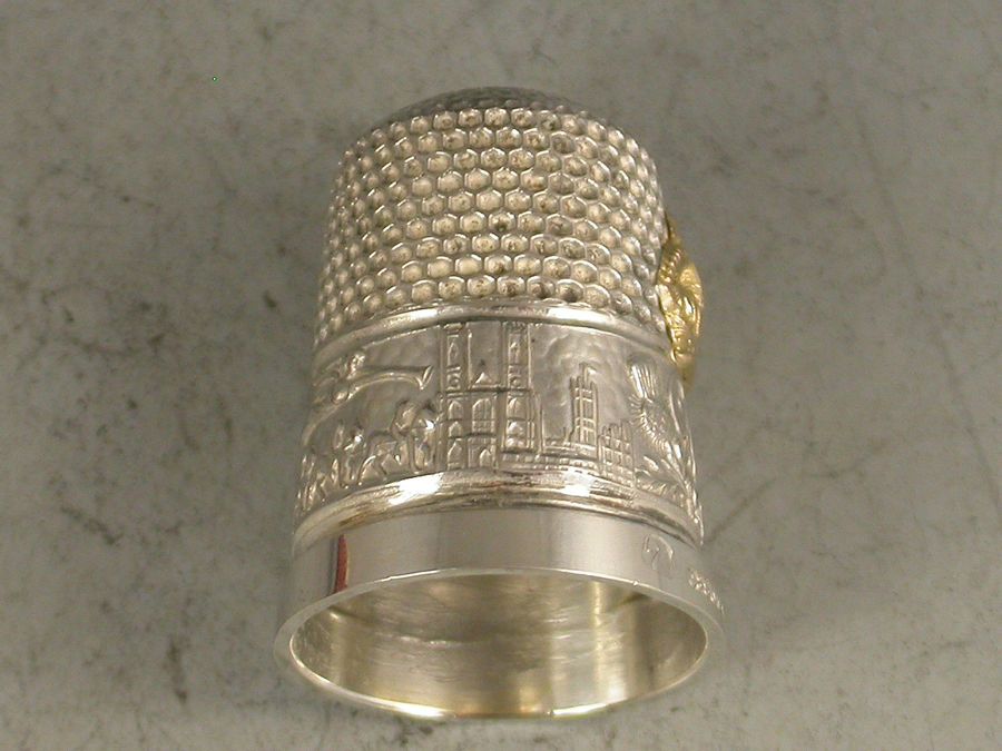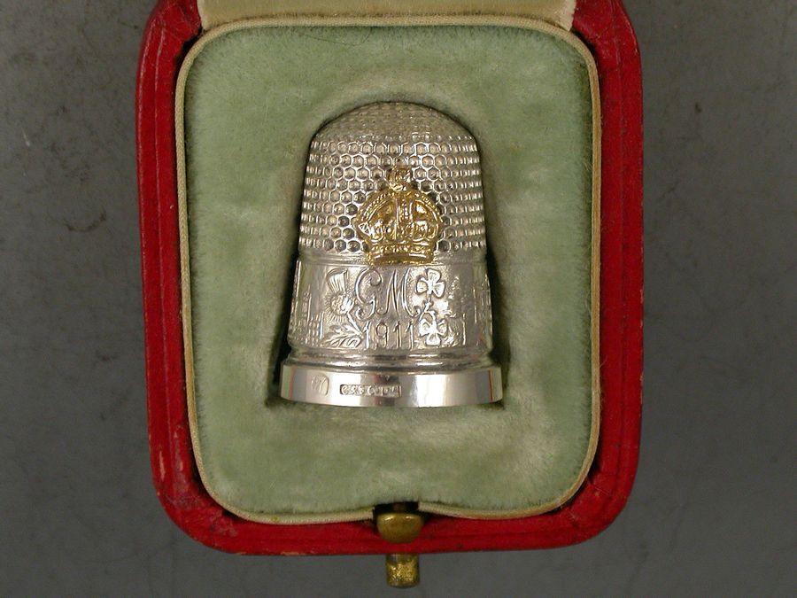 A nice quality early 20th century Commemorative silver and gold Thimble, the border with applied band chased with Buckingham Palace, the Coronation Coach and Westminster Abbey, also with the legend ""GM 1911"". The side also additionally applied with a gold crown. Complete with original silk and velvet lined Morocco red leather fitted case.