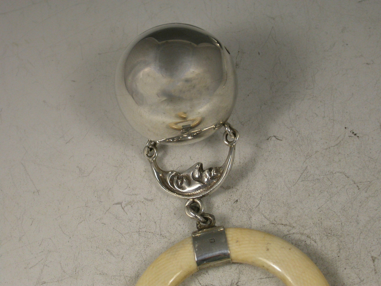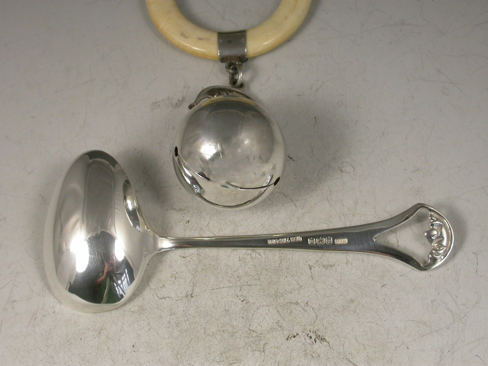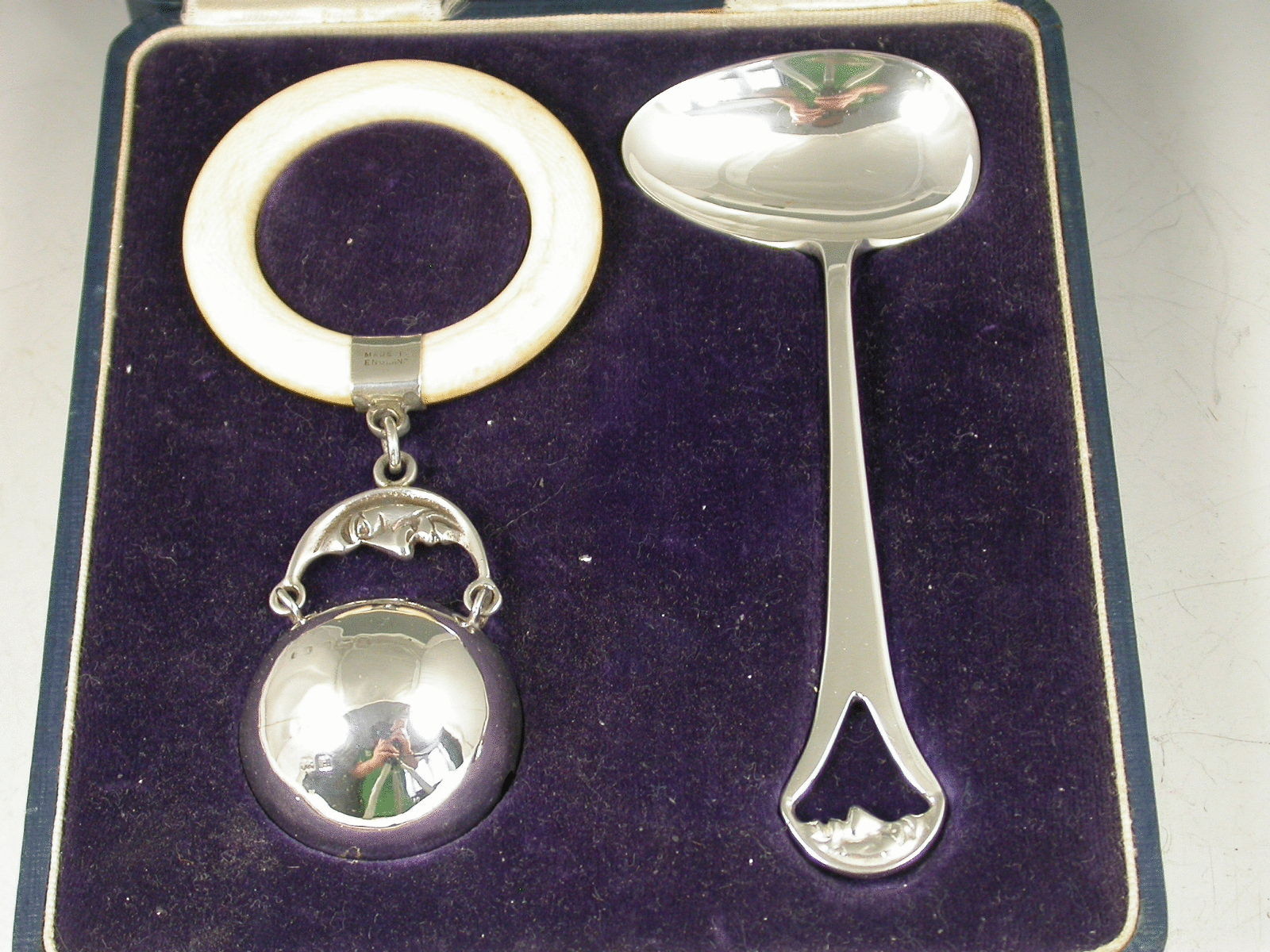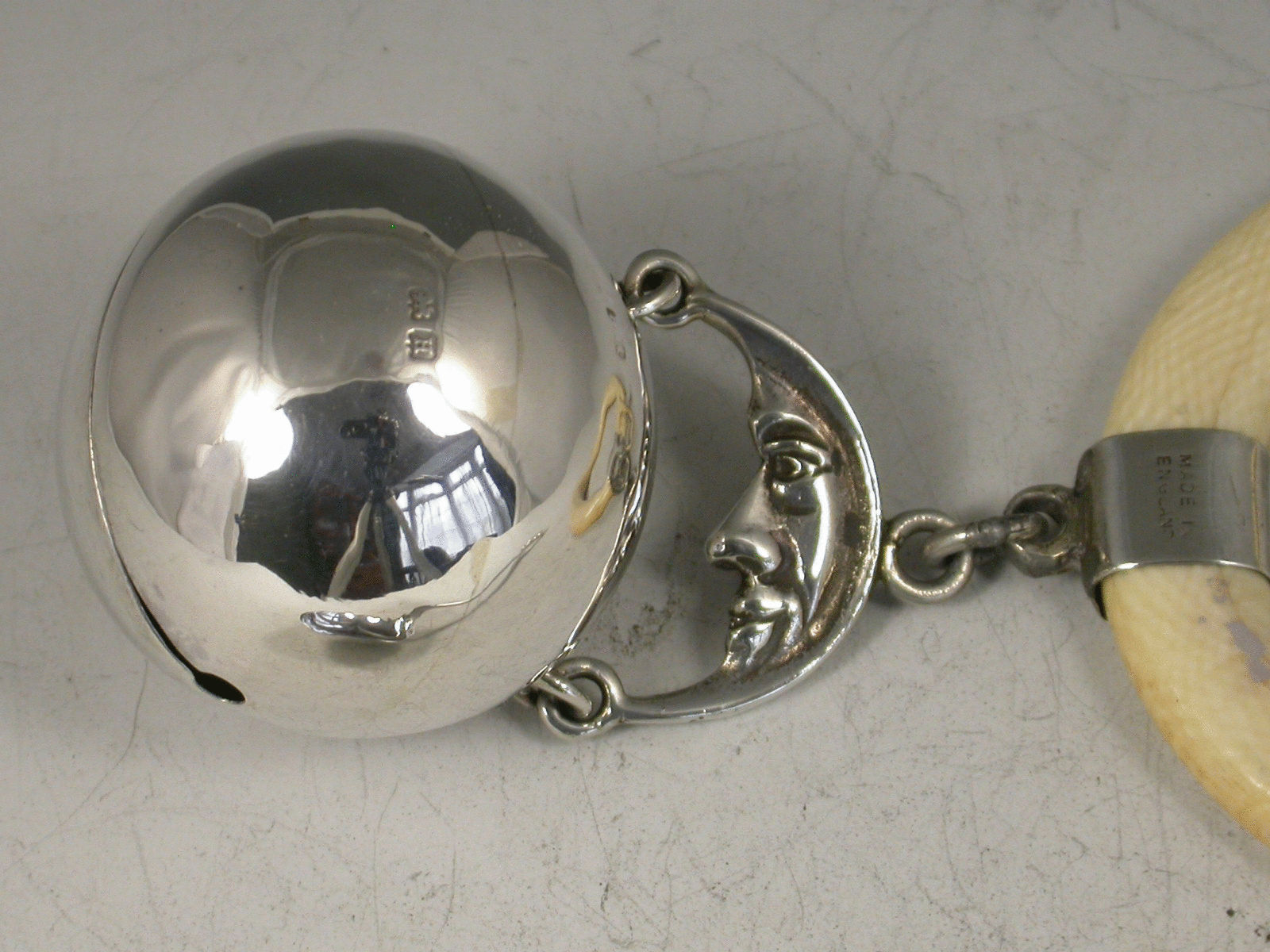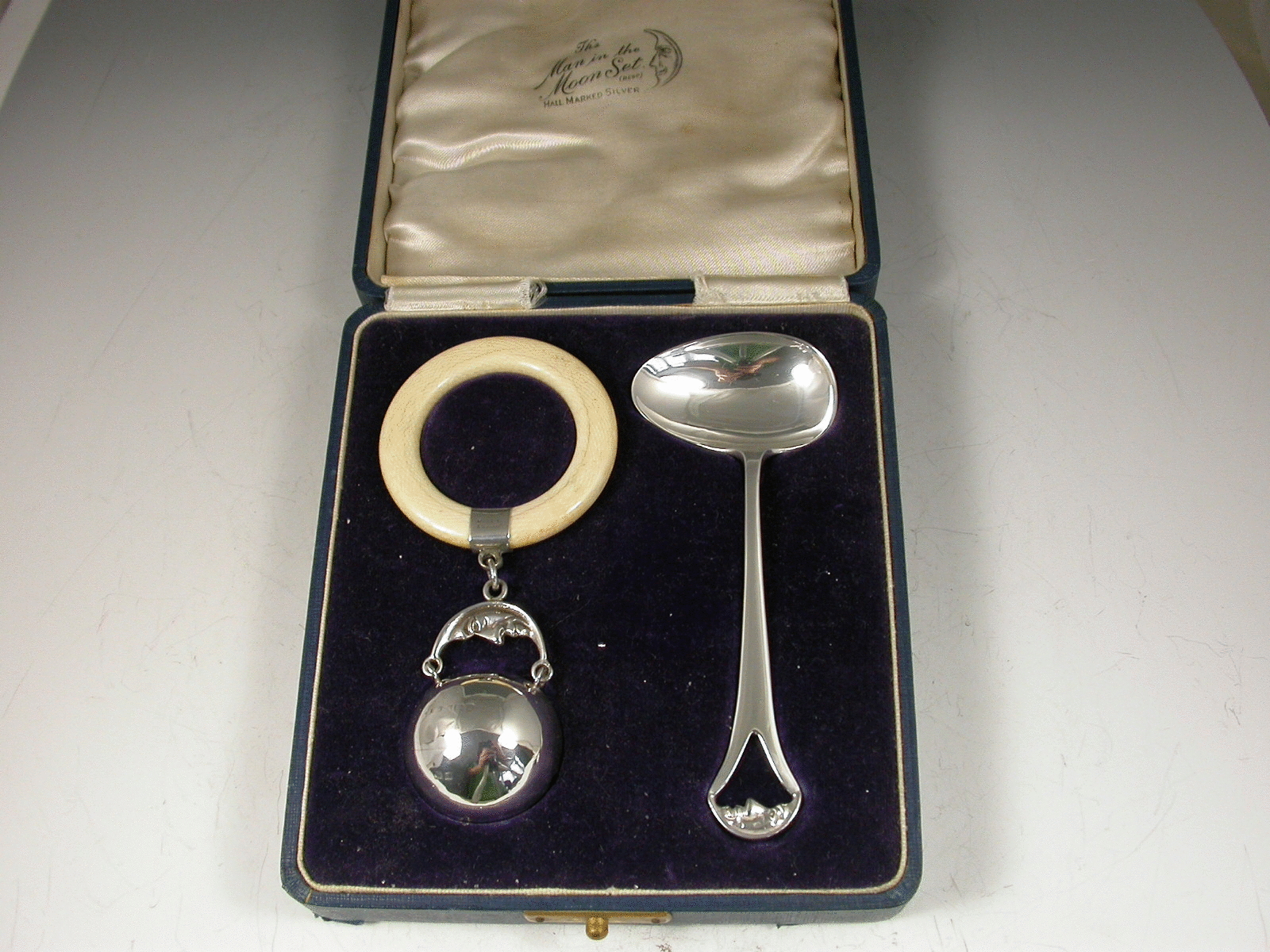 A charming George V cased silver 'Man in the Moon' Christening Set comprising, a child's feeding spoon with sideways oval bowl with man in the moon terminal, a bone teething ring attached to a ball shaped rattle, with a man in the moon link.