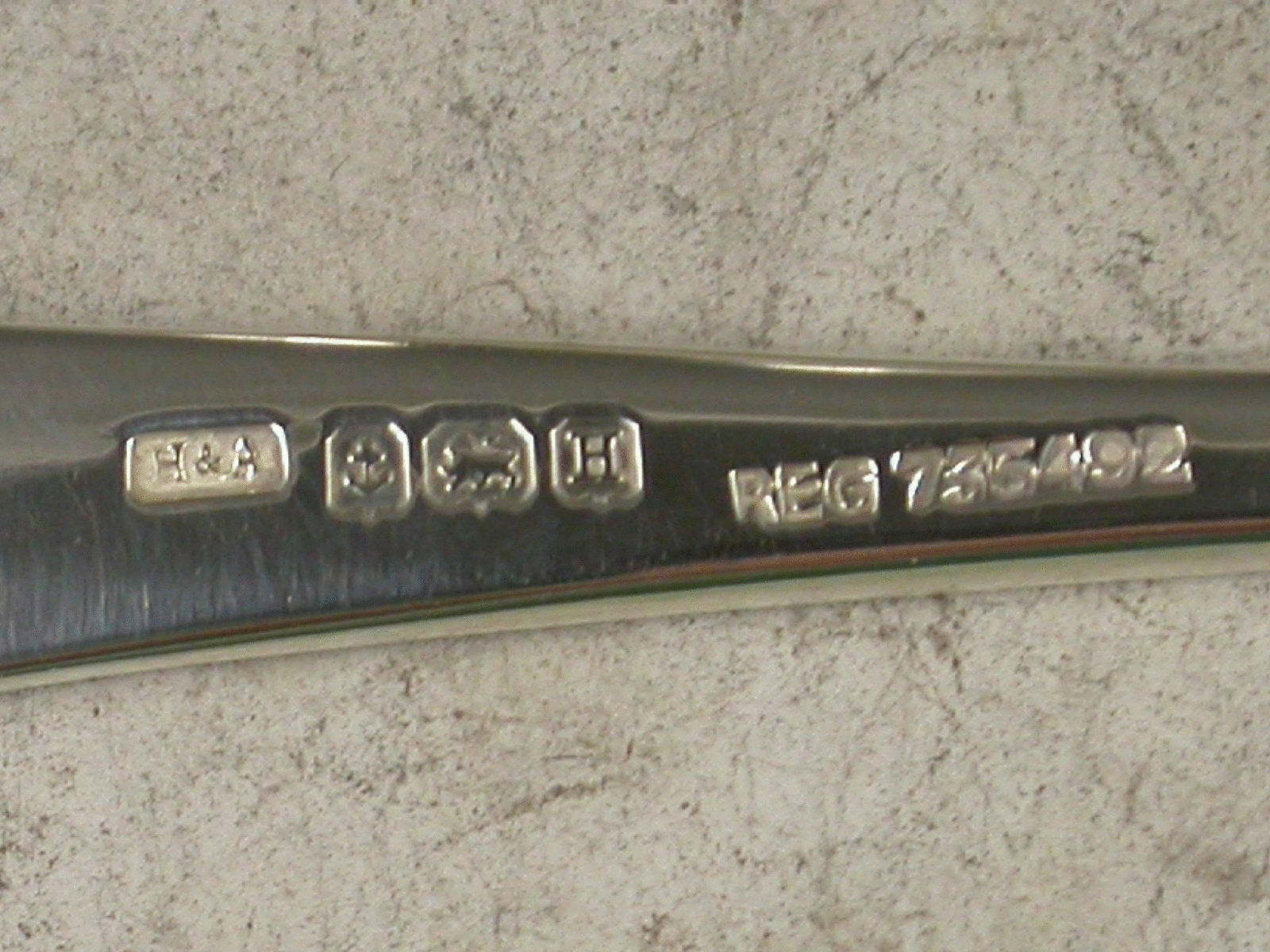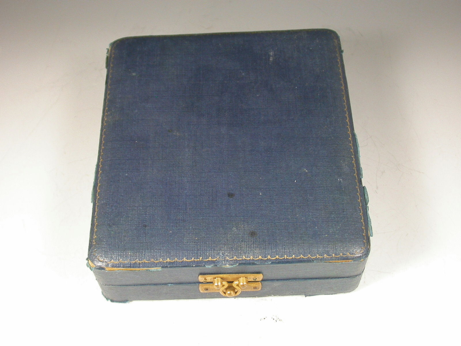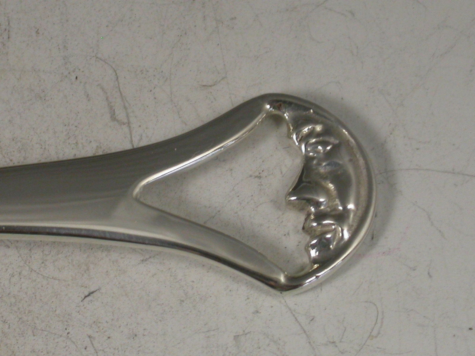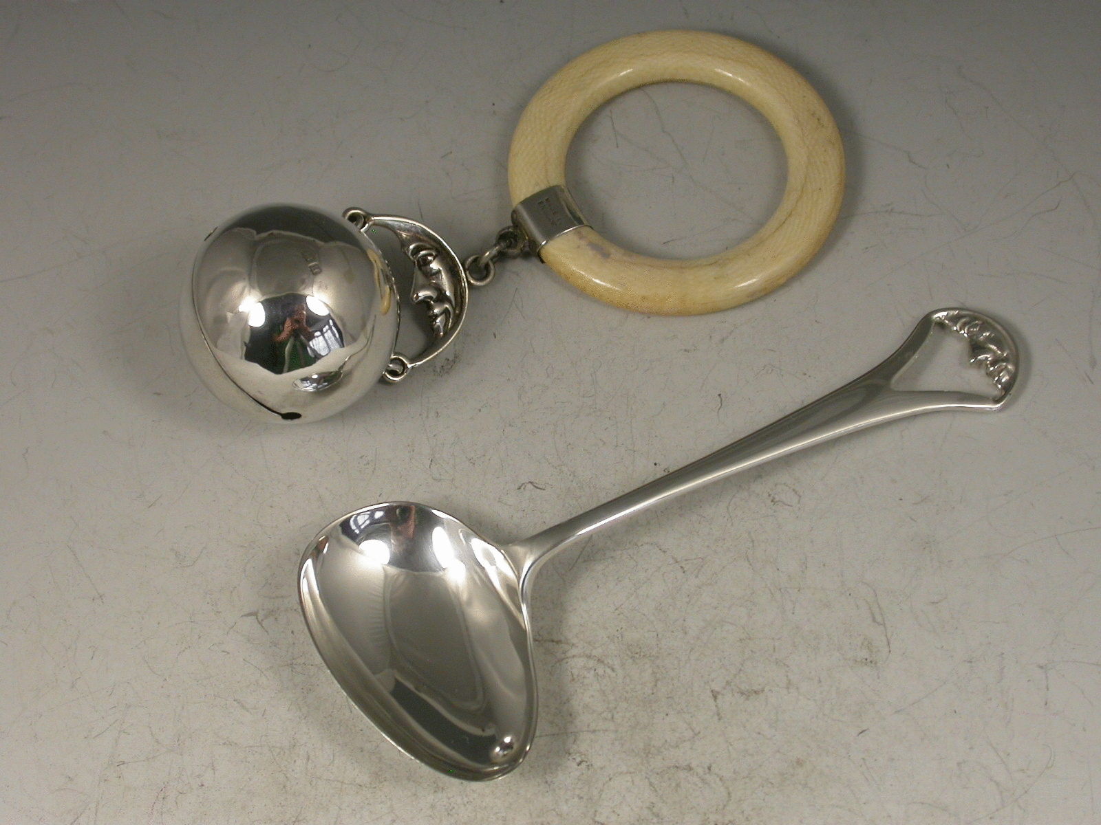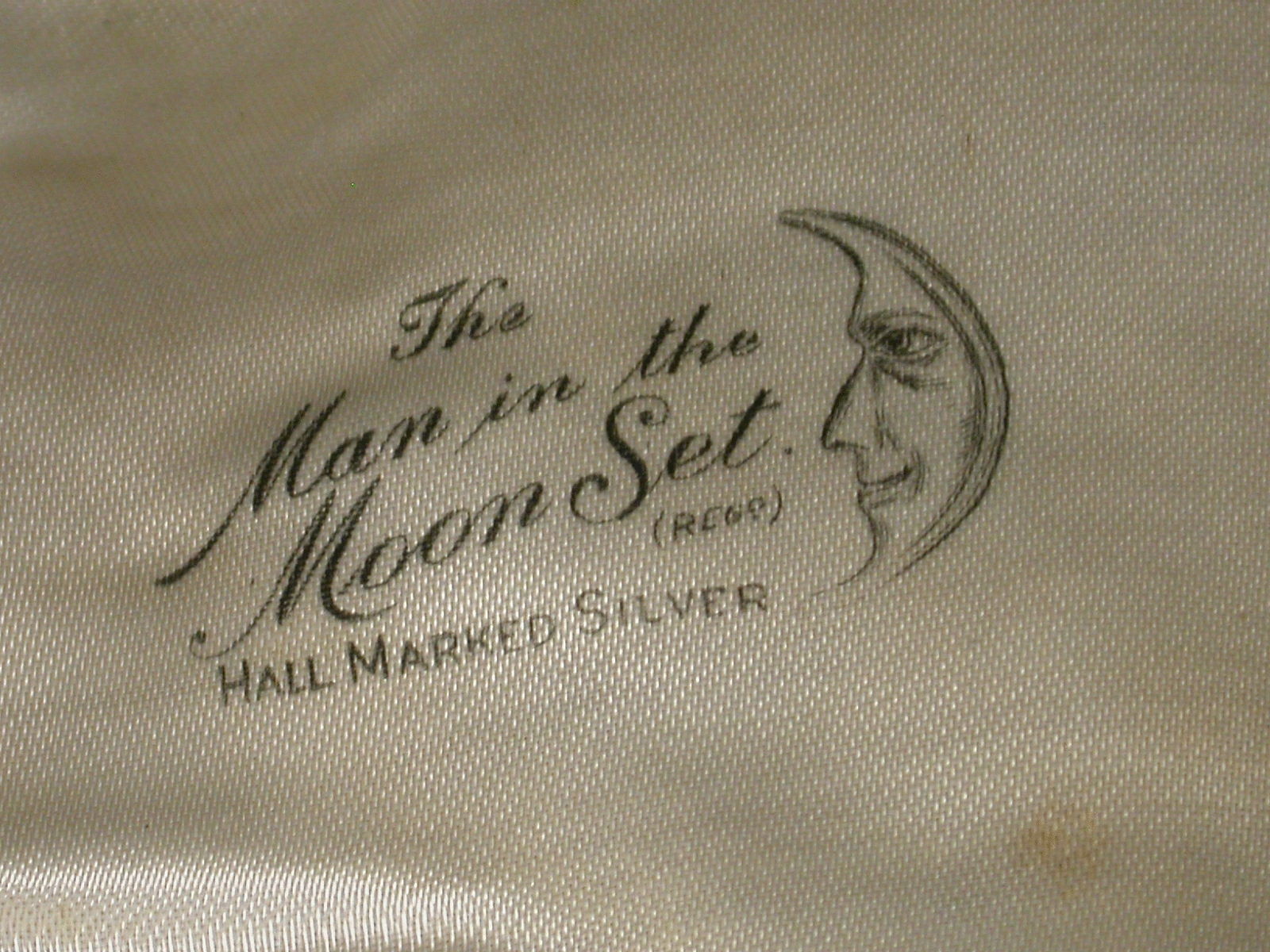 A charming George V cased silver 'Man in the Moon' Christening Set comprising, a child's feeding spoon with sideways oval bowl with man in the moon terminal, a bone teething ring attached to a ball shaped rattle, with a man in the moon link.