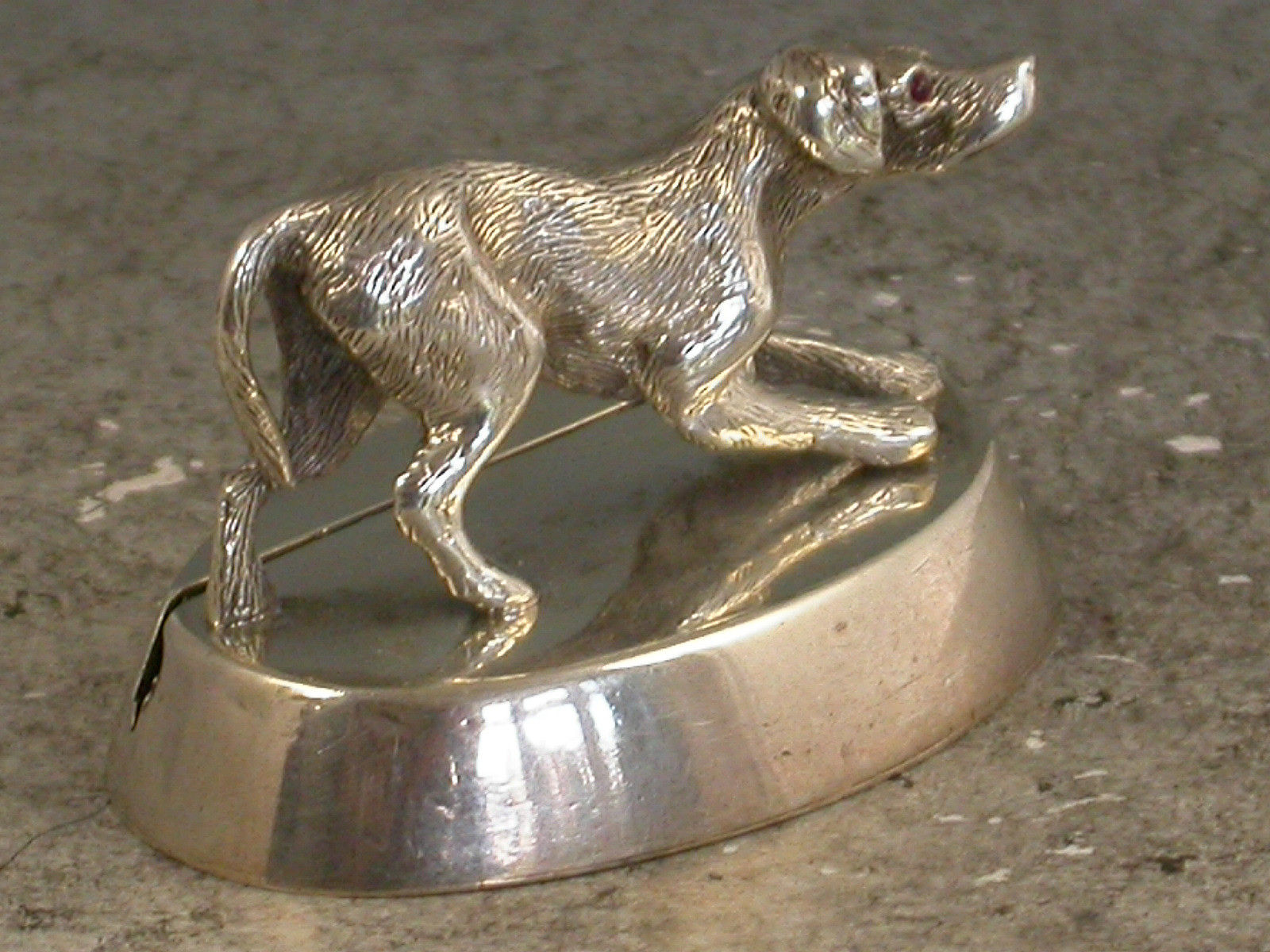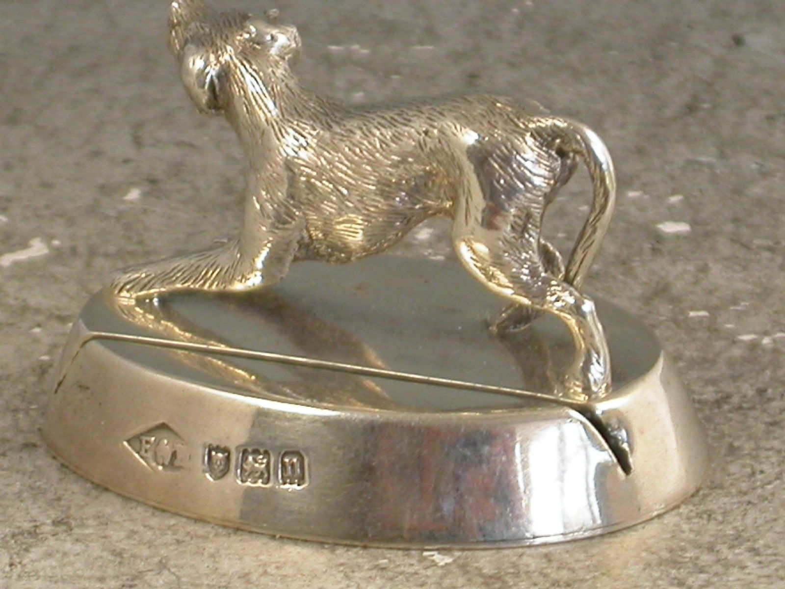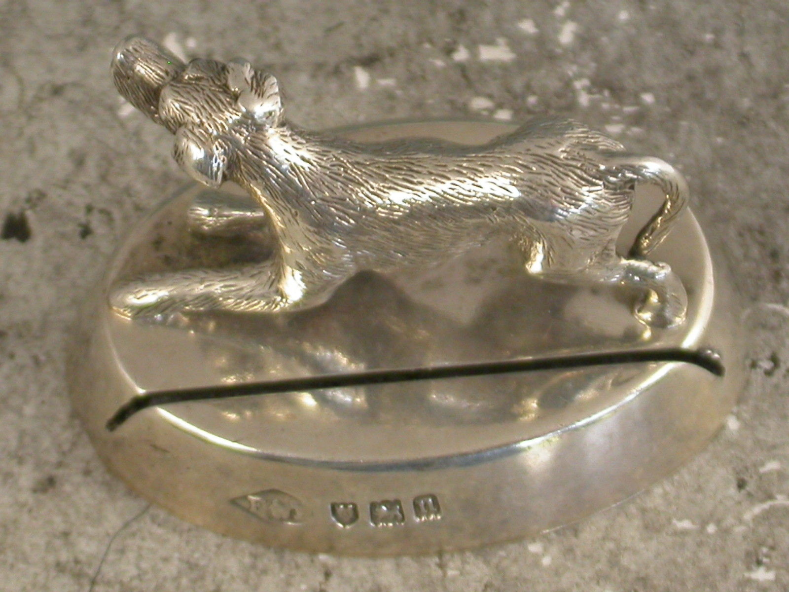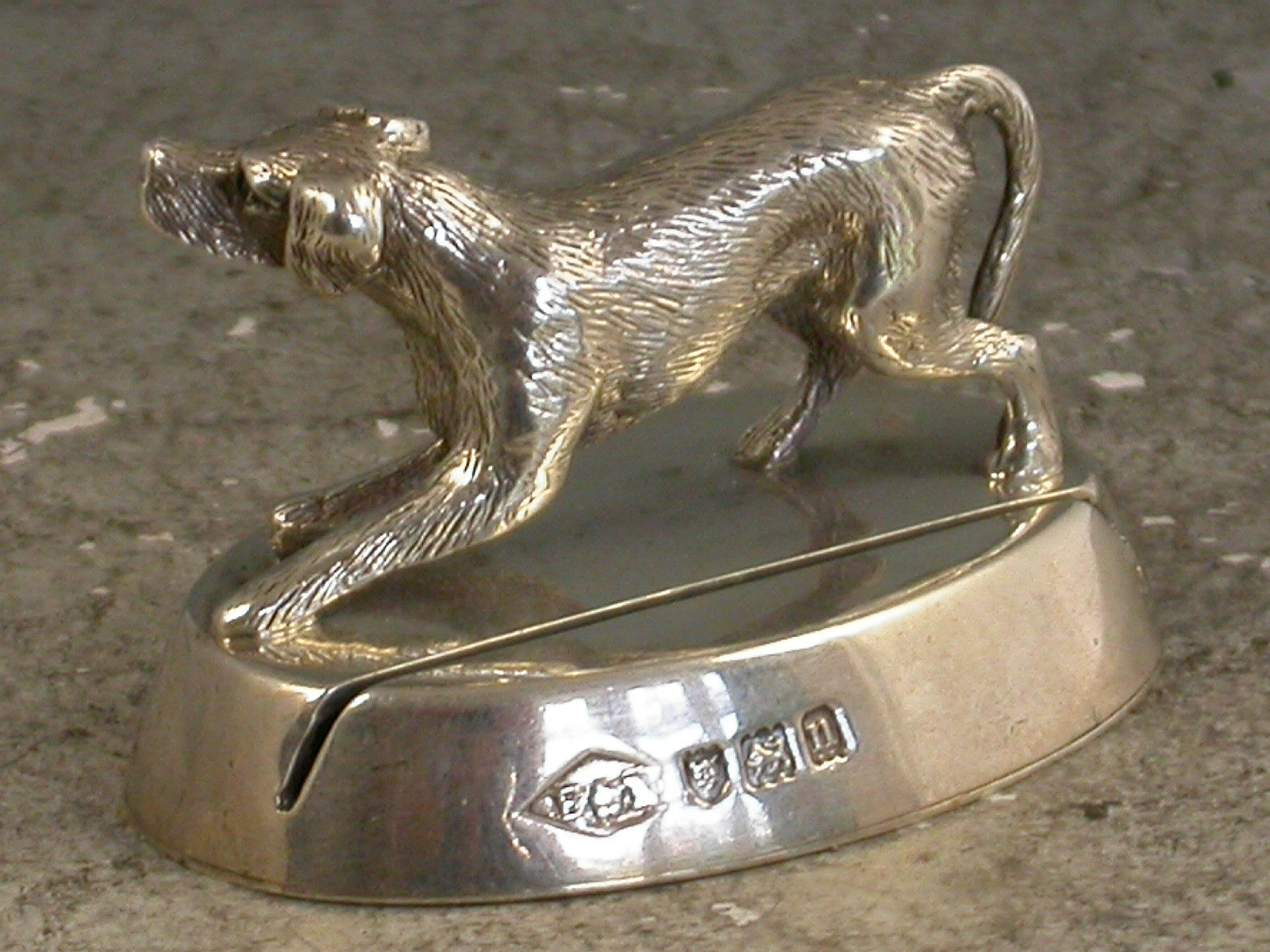 A George V cast silver Hunting Dog Menu Holder standing in a crouched position on a slotted oval base (filled).