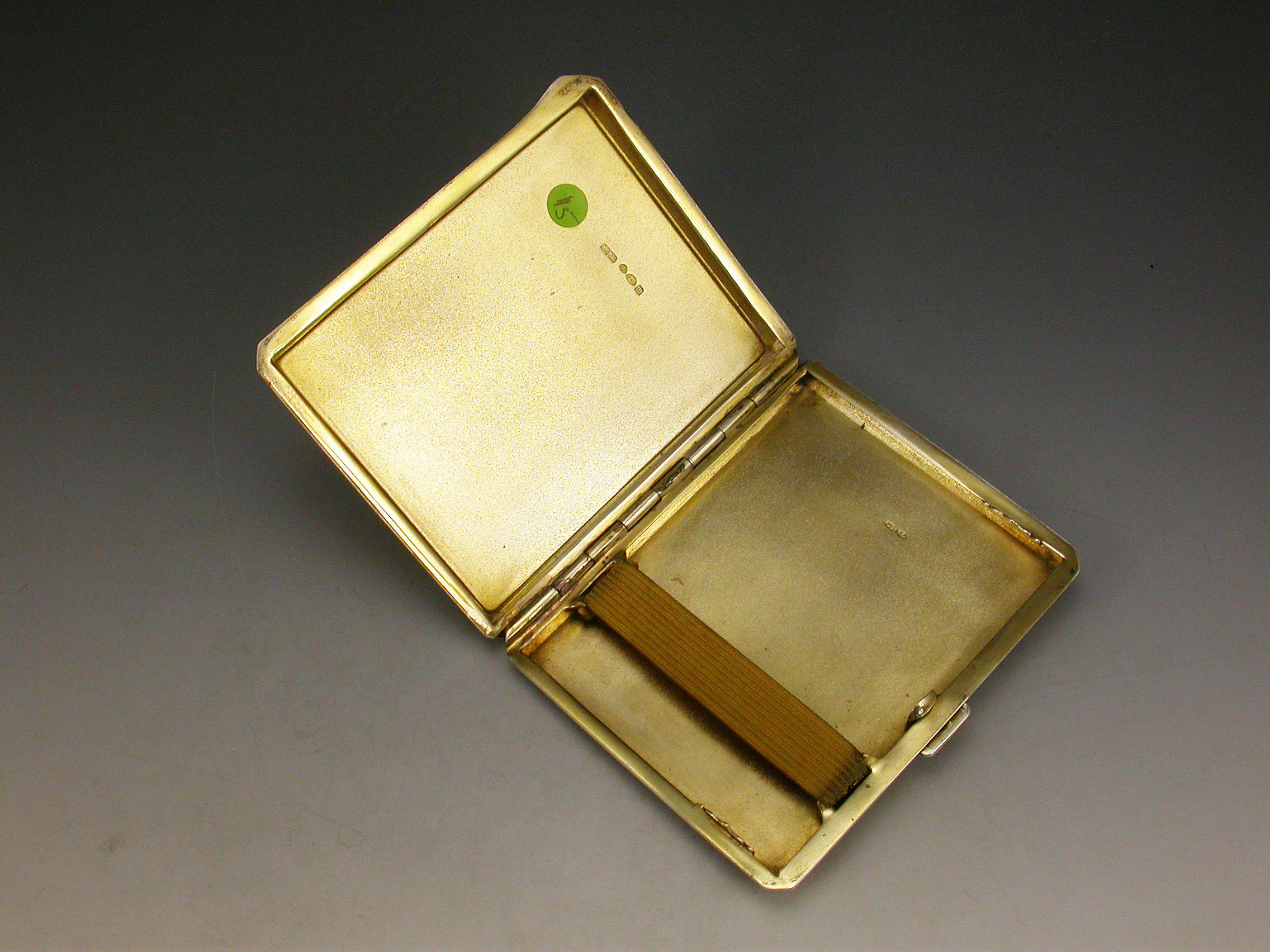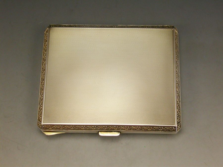 An good early 20th century silver and enamel Cigarette Case of rectangular form with sprung push button opening mechanism and chamfered sides. The front decorated with an enamel scene depicting a formal garden. Silver gilt interior.