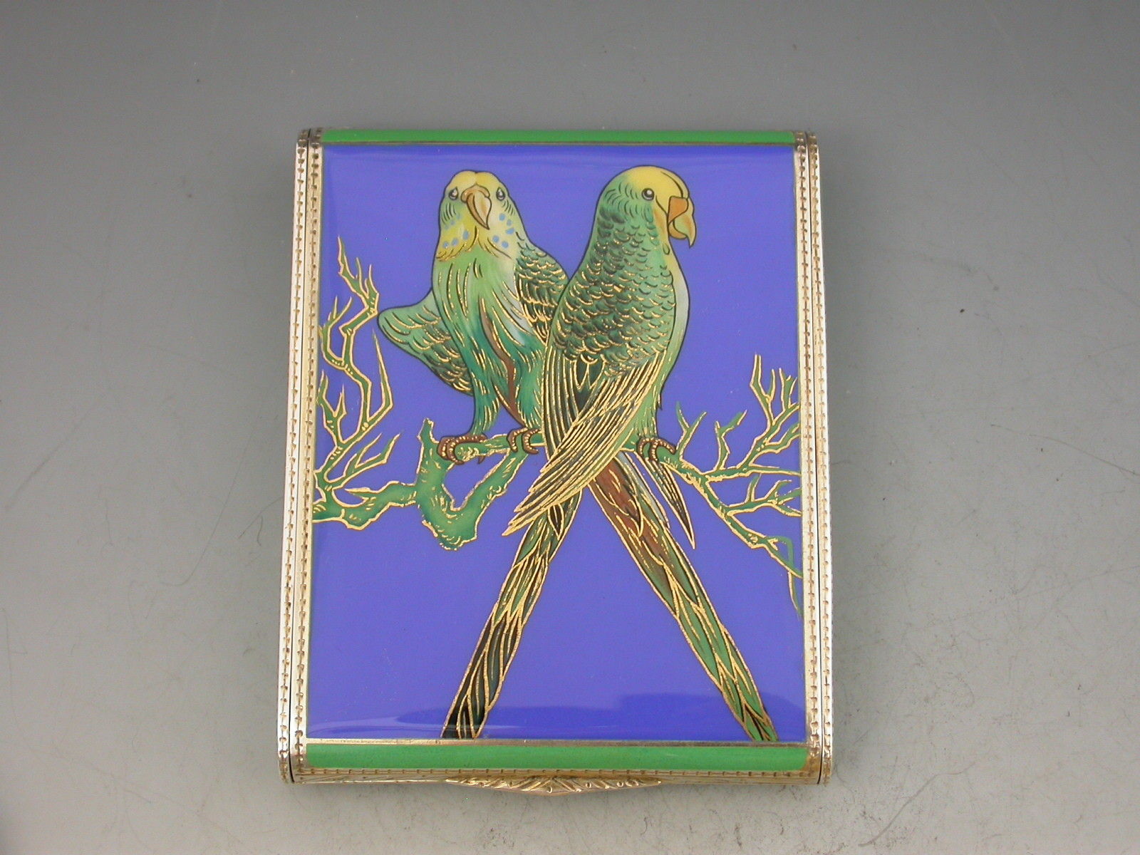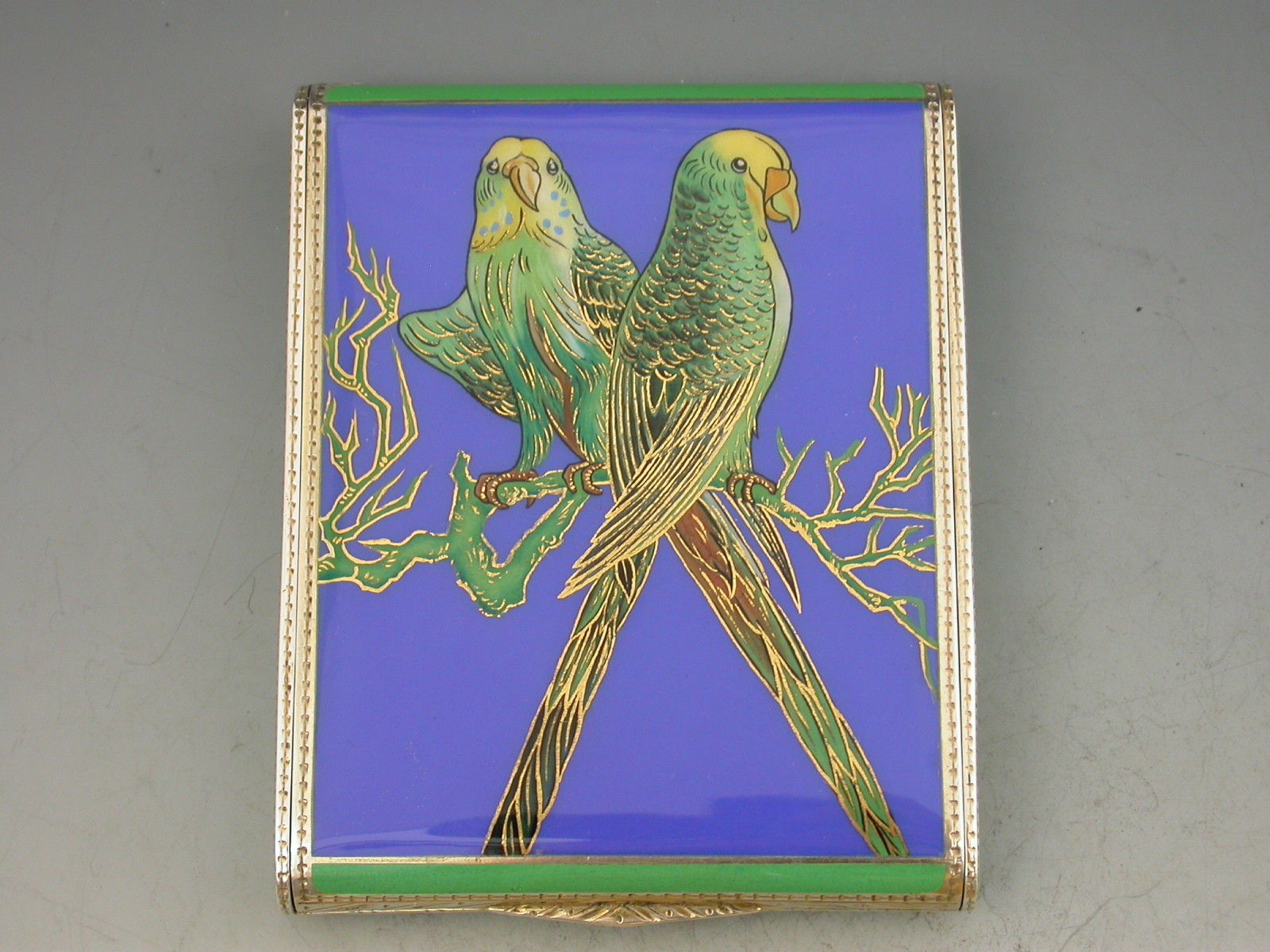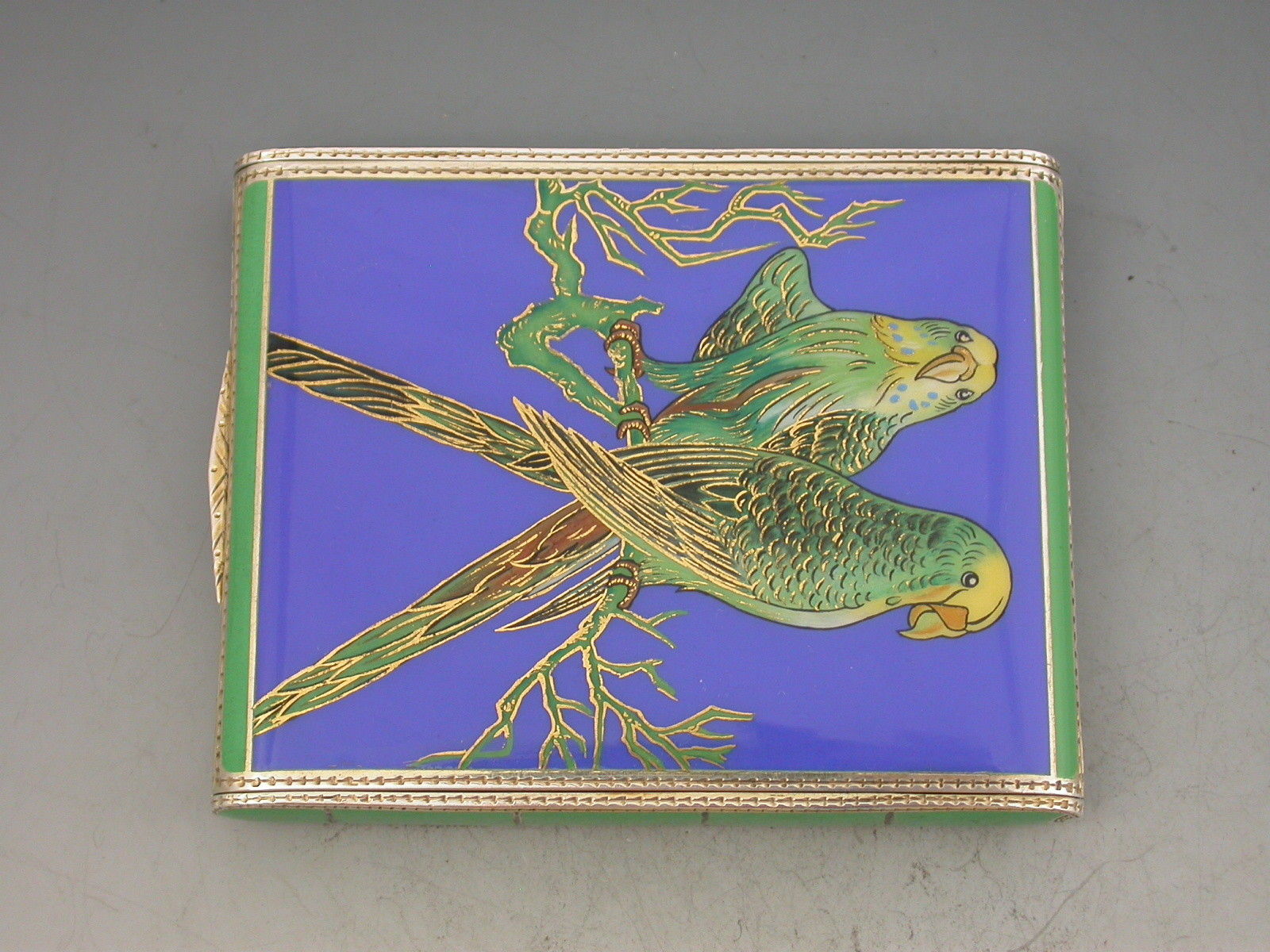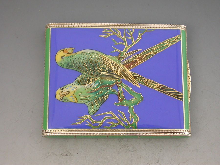 A George V Continental silver & enamel Cigarette Case of extremely fine and heavy quality, the rounded rectangular form hinged at the narrow end, decorated on all sides with striking blue and green enamels highlighted with gilt, the cover depicting two green and yellow Budgerigars or Parakeets on a blue background.
