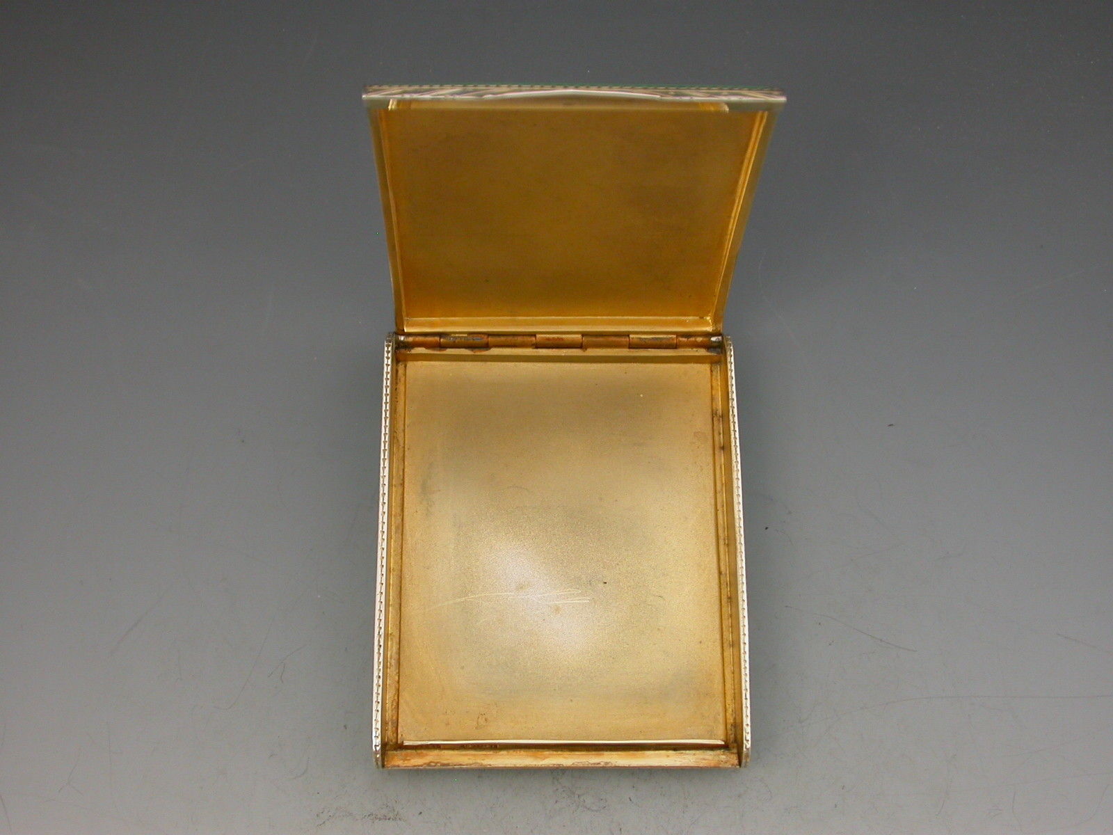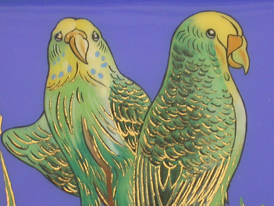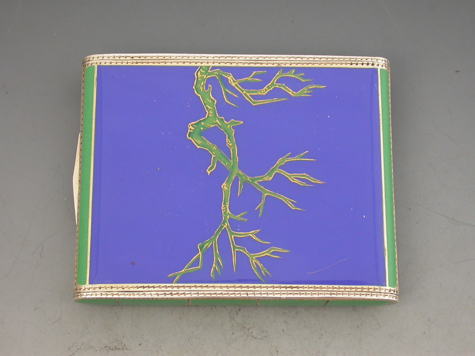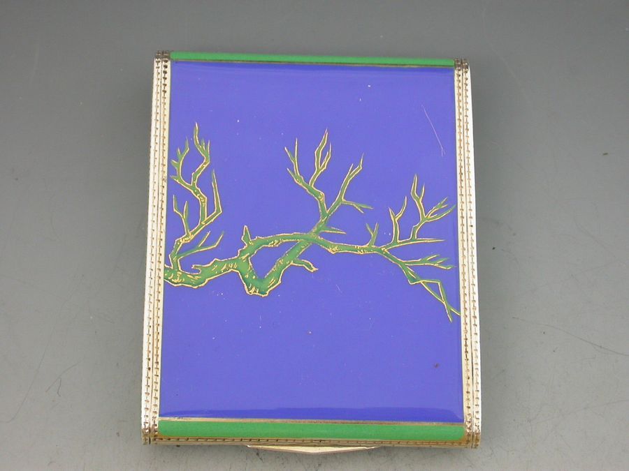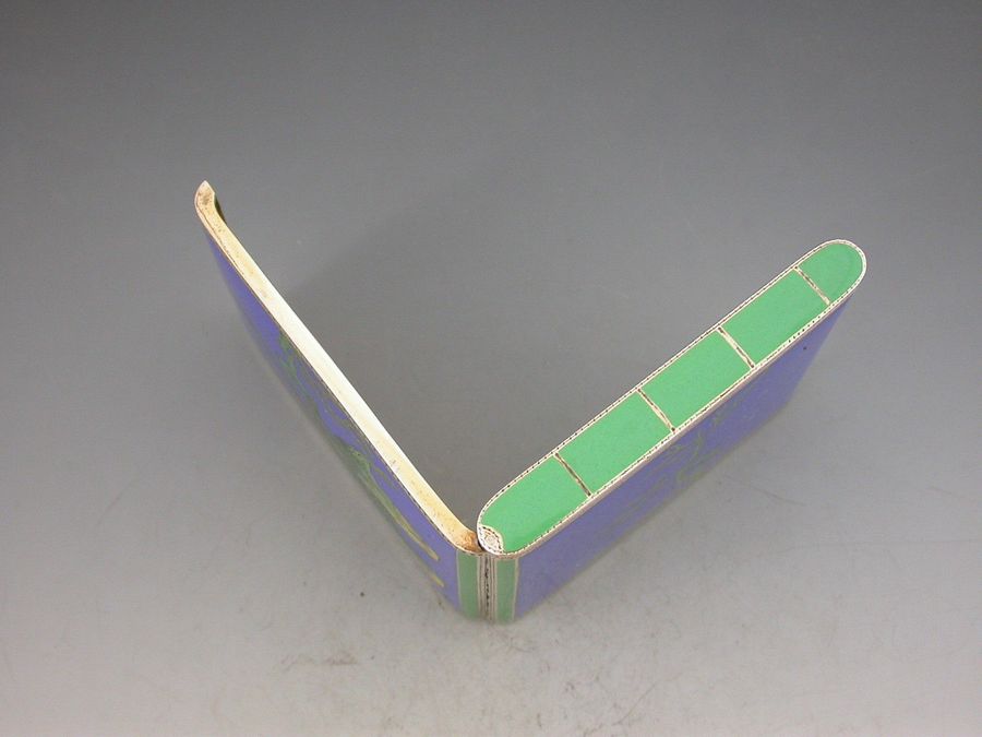 A George V Continental silver & enamel Cigarette Case of extremely fine and heavy quality, the rounded rectangular form hinged at the narrow end, decorated on all sides with striking blue and green enamels highlighted with gilt, the cover depicting two green and yellow Budgerigars or Parakeets on a blue background.