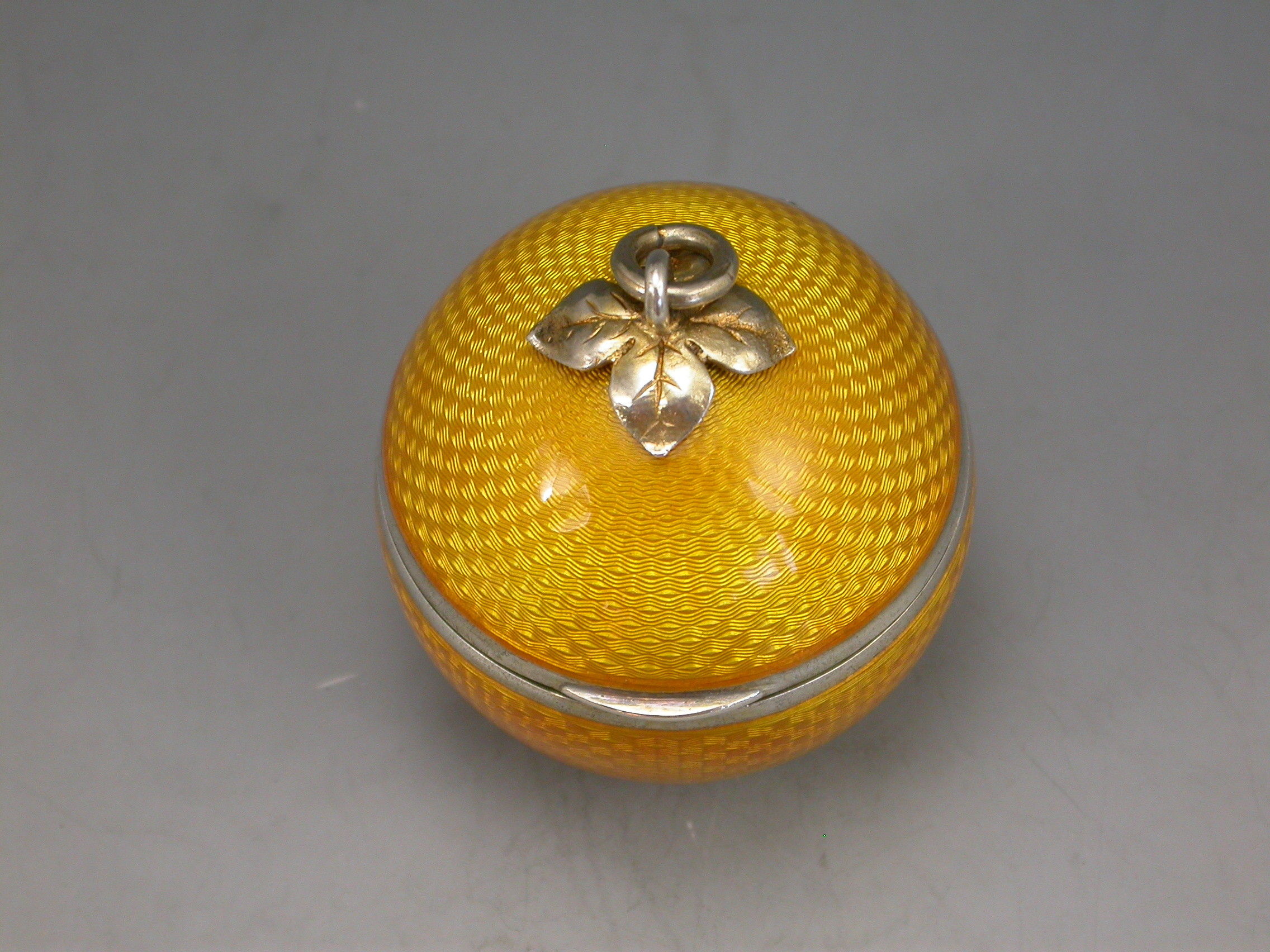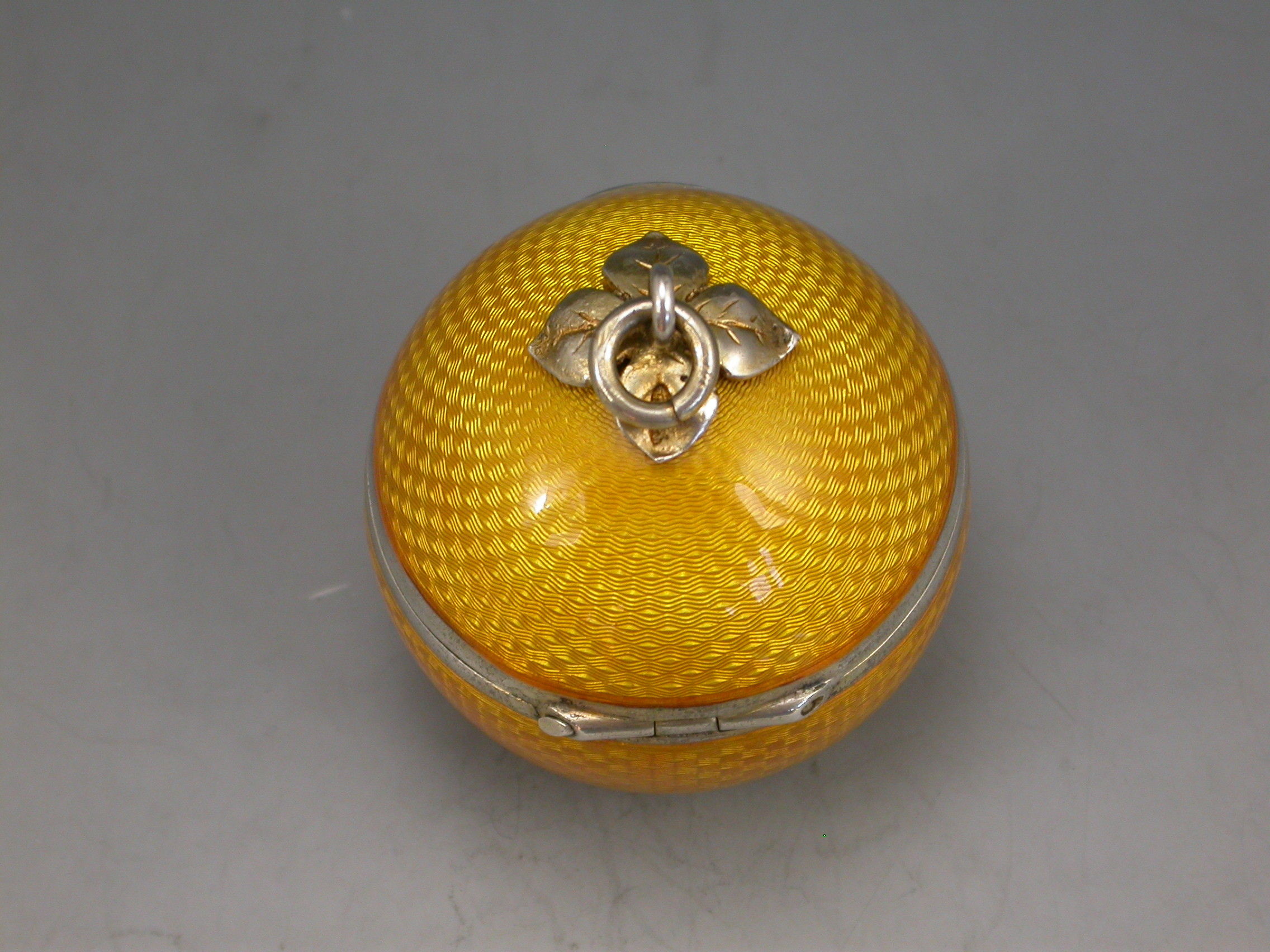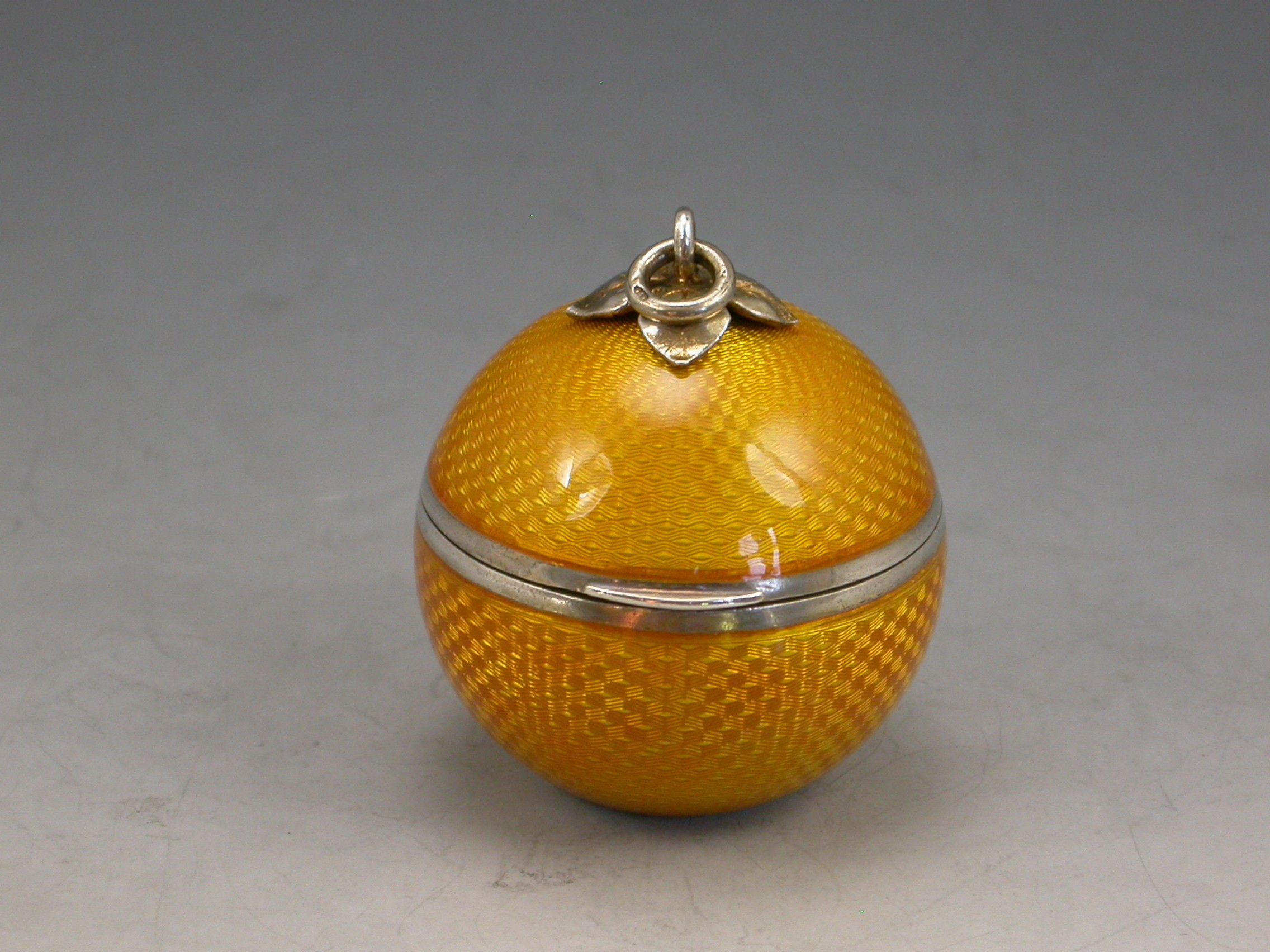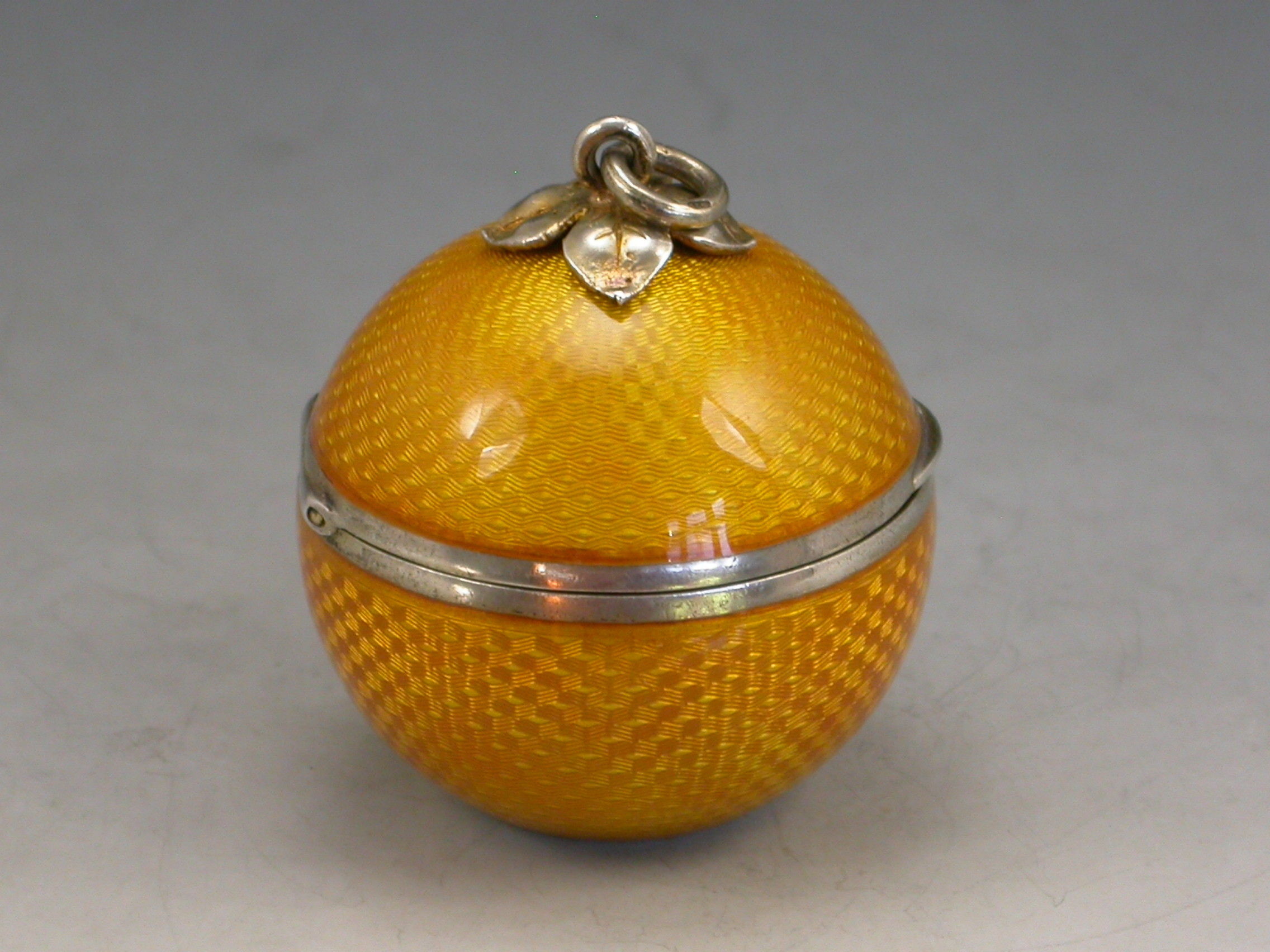 A good quality early 20th century silver and guilloche enamel Powder Compact made in the form of an orange, with attached suspension ring, the silver gilt interior with mirror and pierced cover.