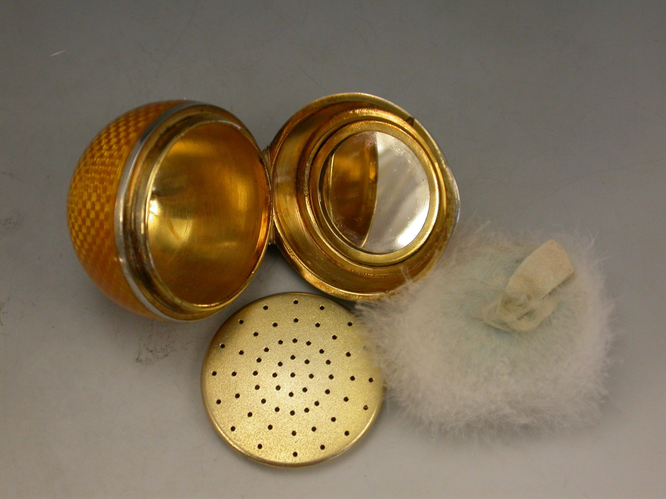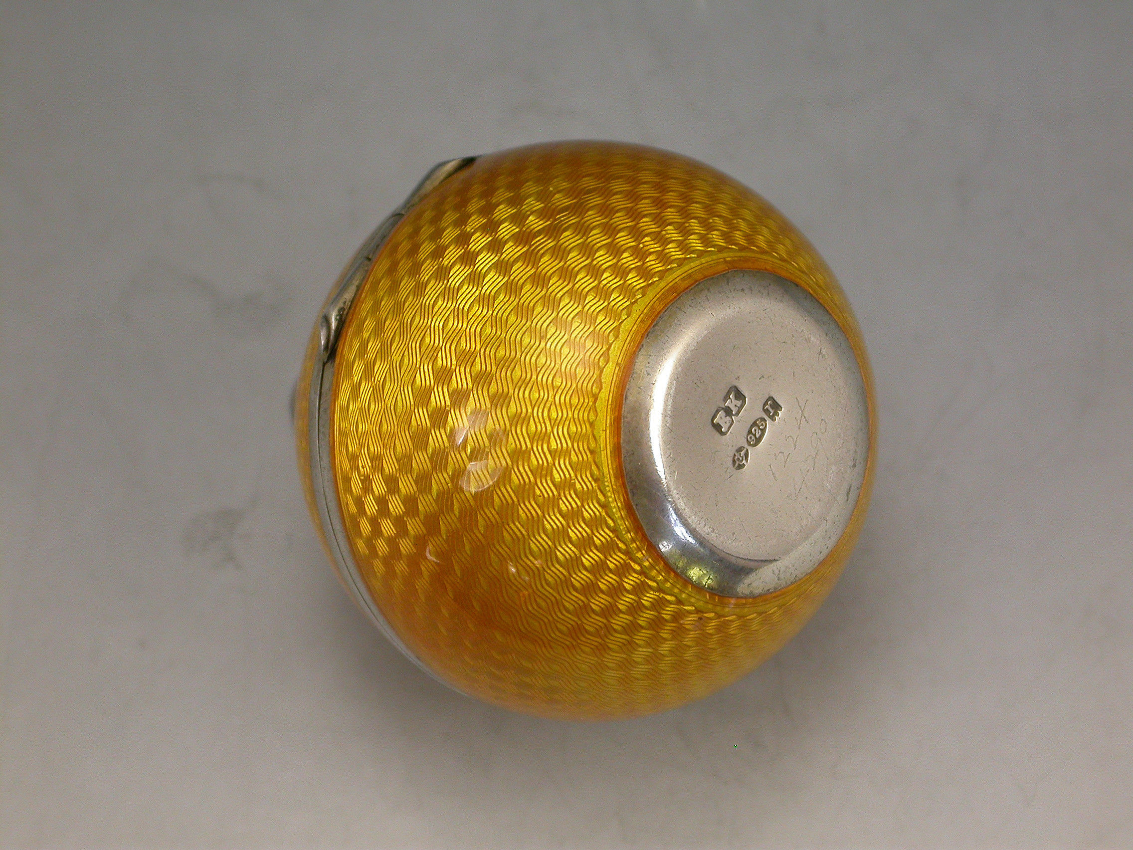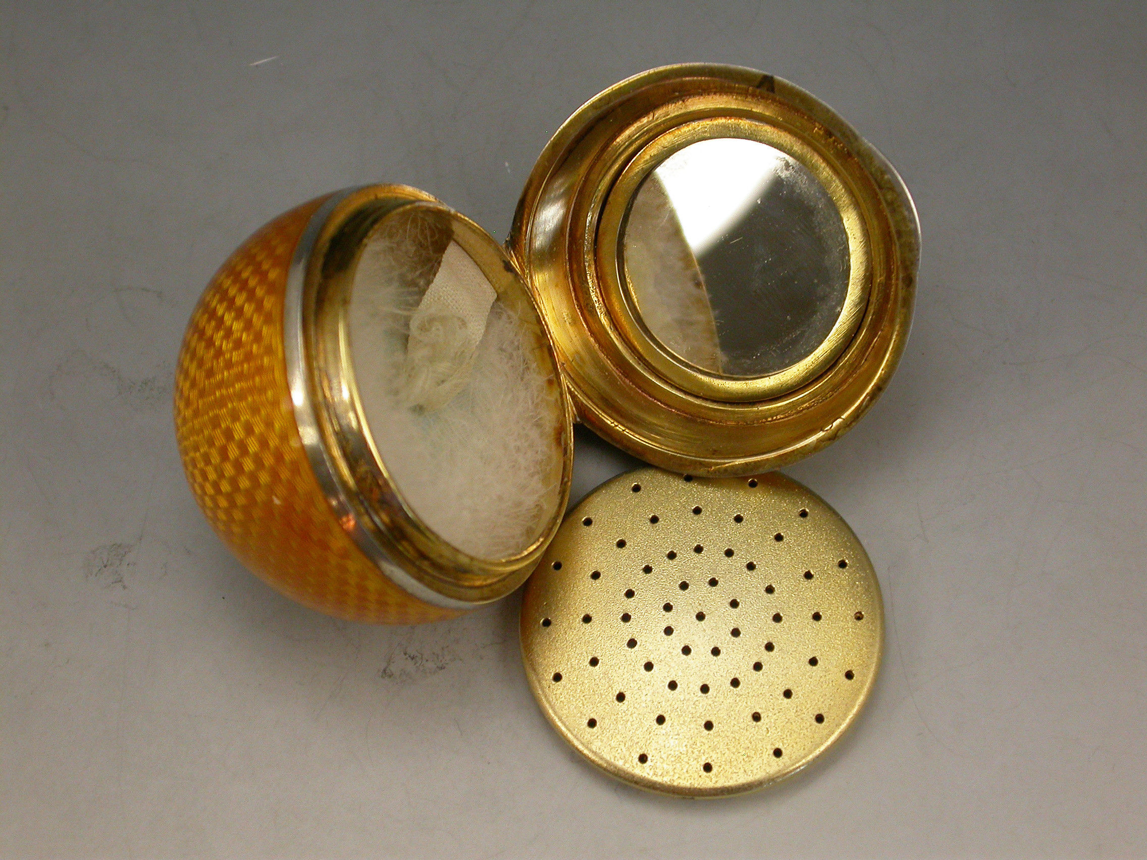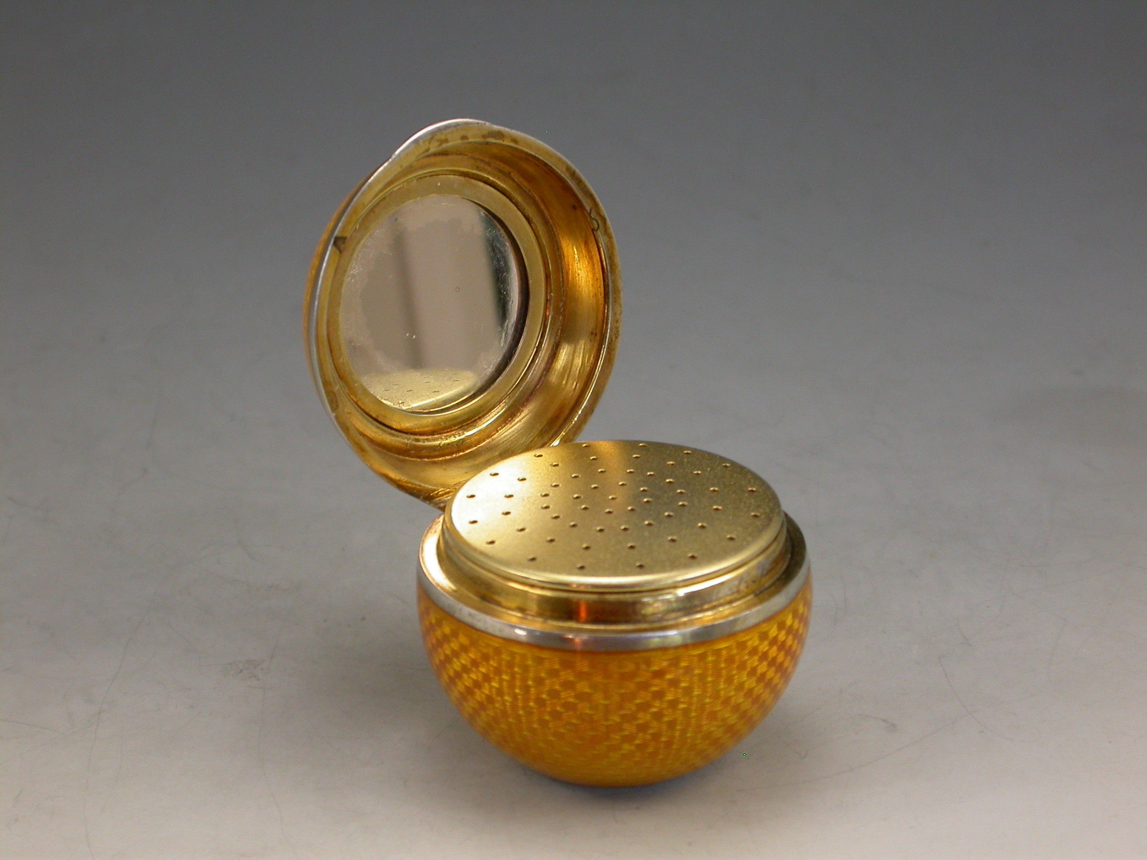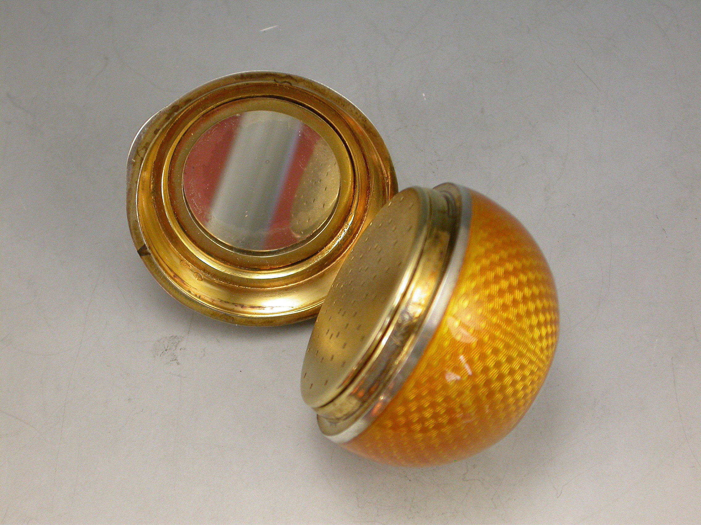 A good quality early 20th century silver and guilloche enamel Powder Compact made in the form of an orange, with attached suspension ring, the silver gilt interior with mirror and pierced cover.