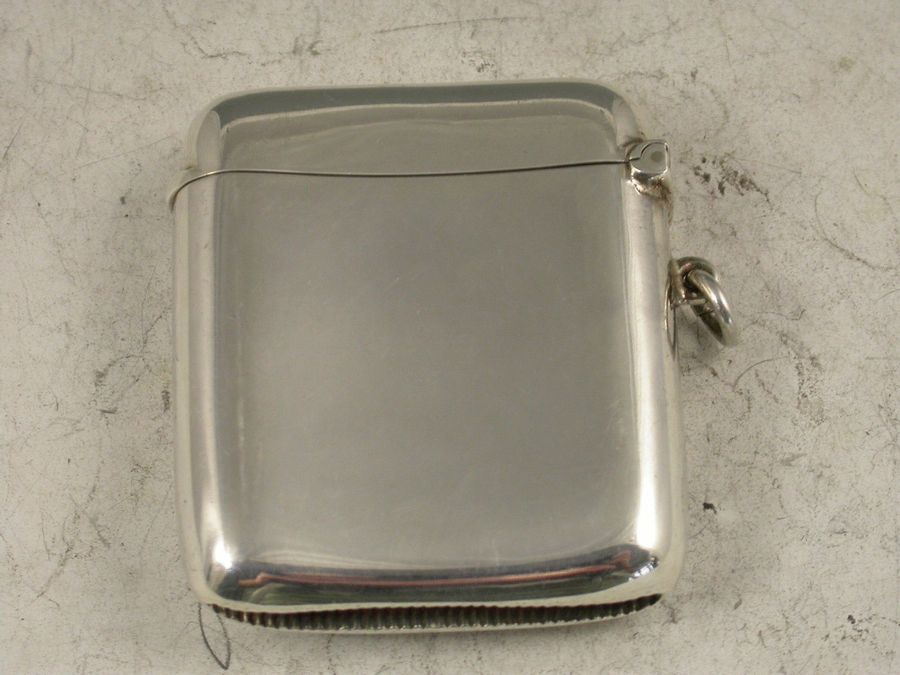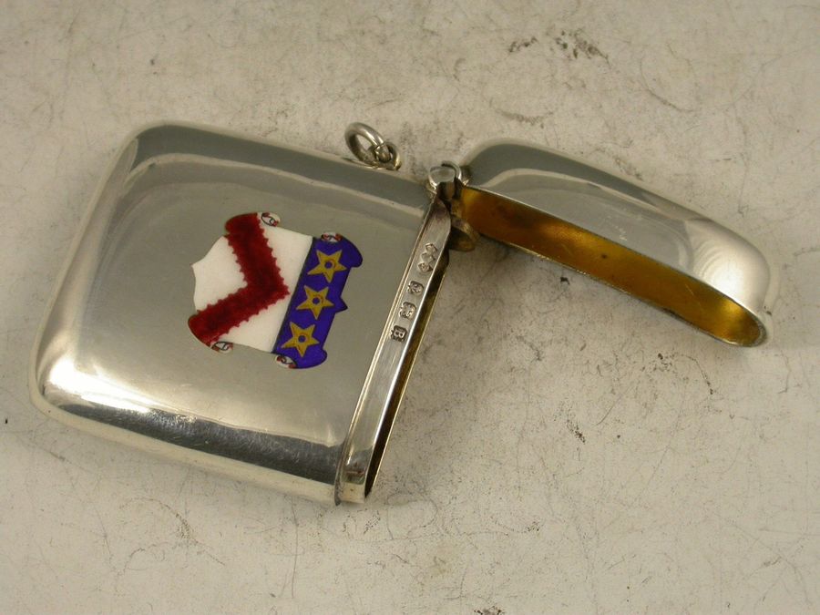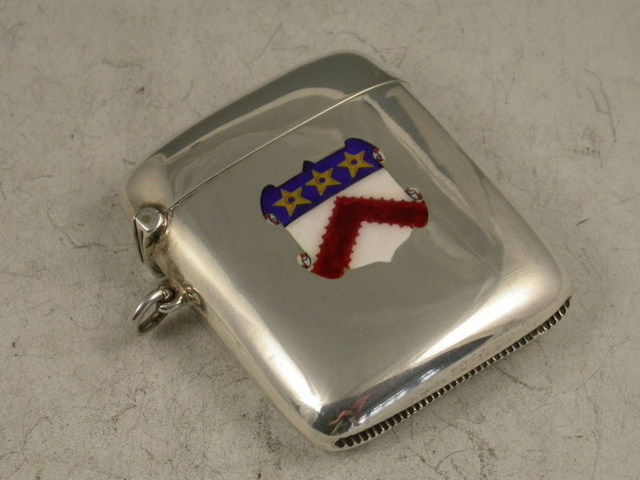 A good George V silver Vesta Case of rounded rectangular form with hinged flip top lid, the face with enamel plaque depicting the Arms of Keble College, Oxford University.