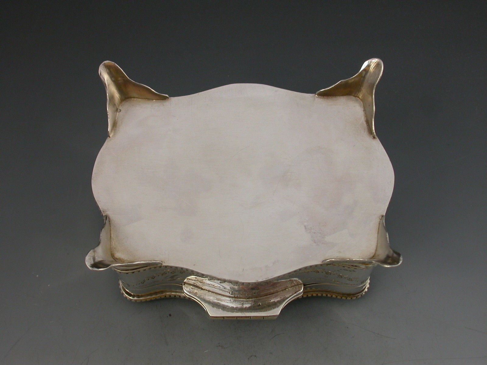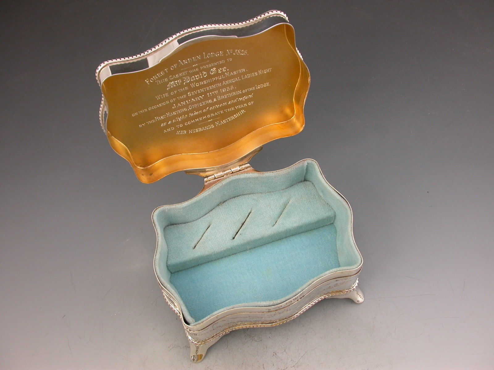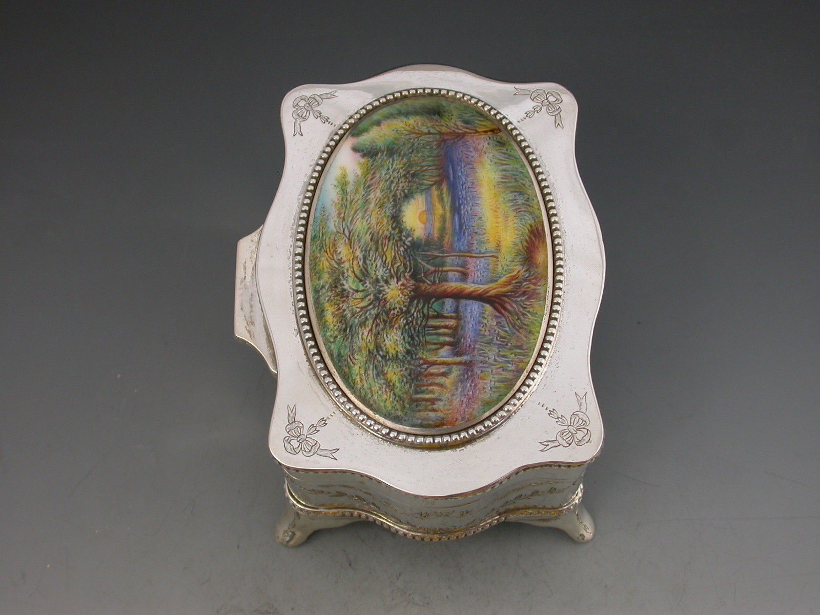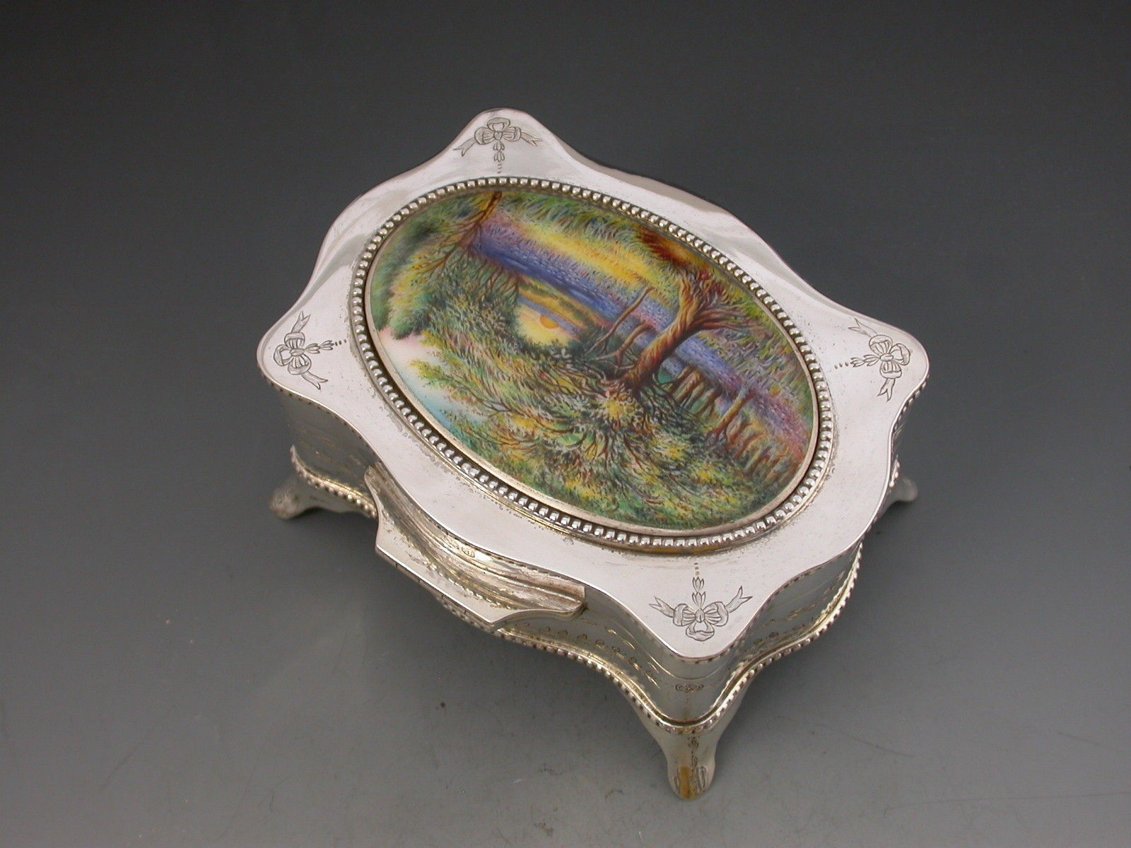 A good quality George V silver Jewellery Box of shaped rectangular form with serpentine sides and standing on four flared feet, the hinged lid inset with an oval enamelled panel depicting the sunrise in a woodland clearing carpeted with bluebells. The interior base lined with sky blue velvet and fitted to accept rings. The gilded interior lid inscribed with Masonic presentation inscription.