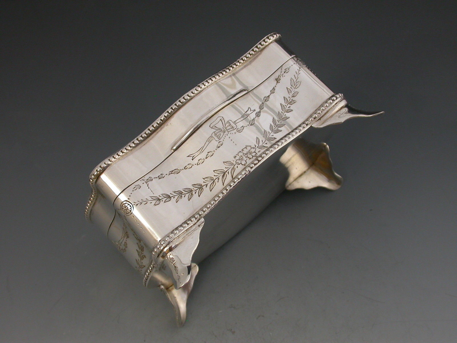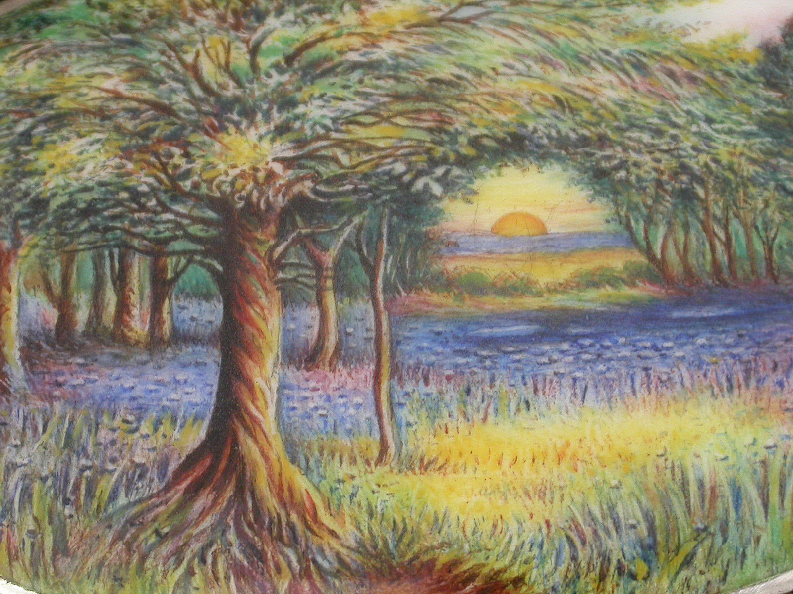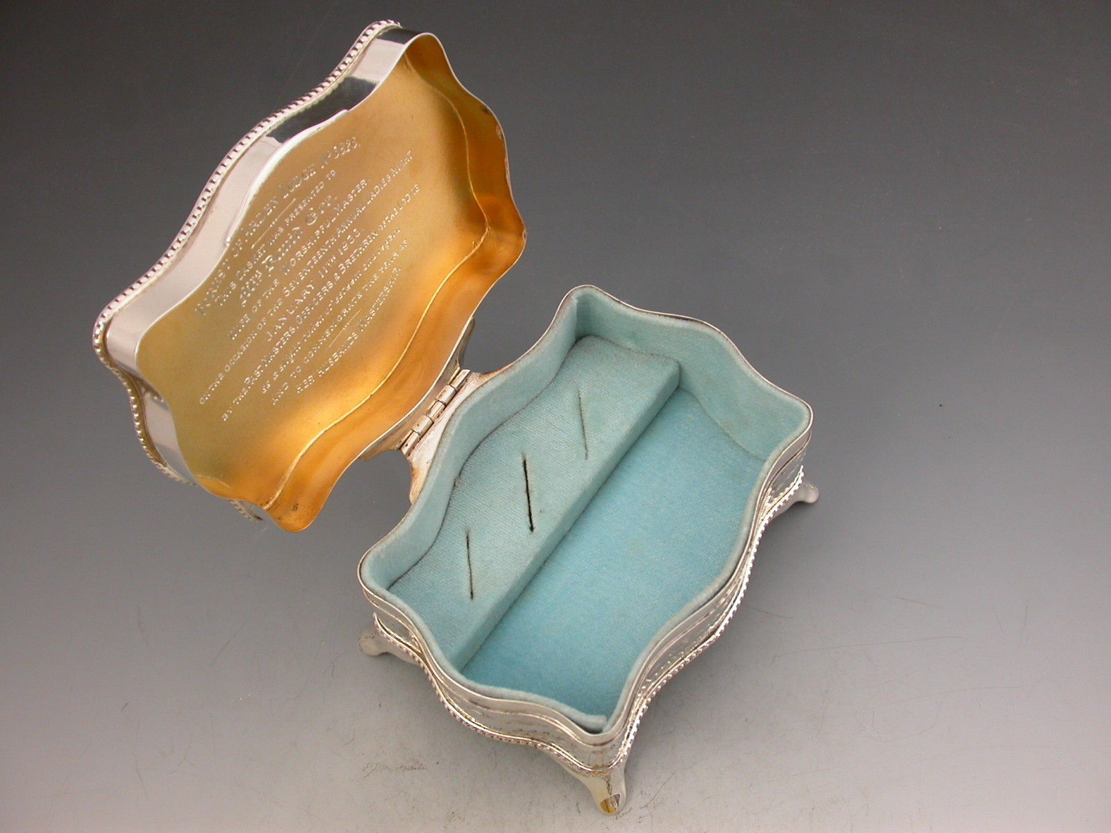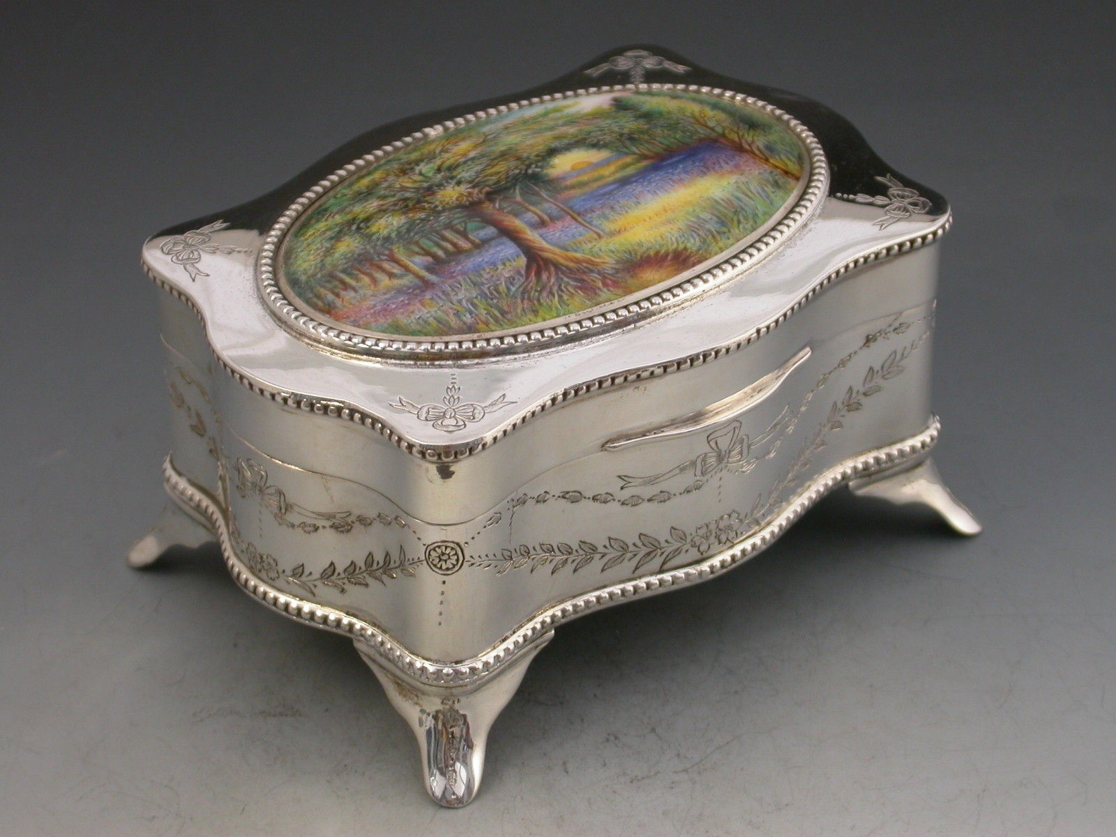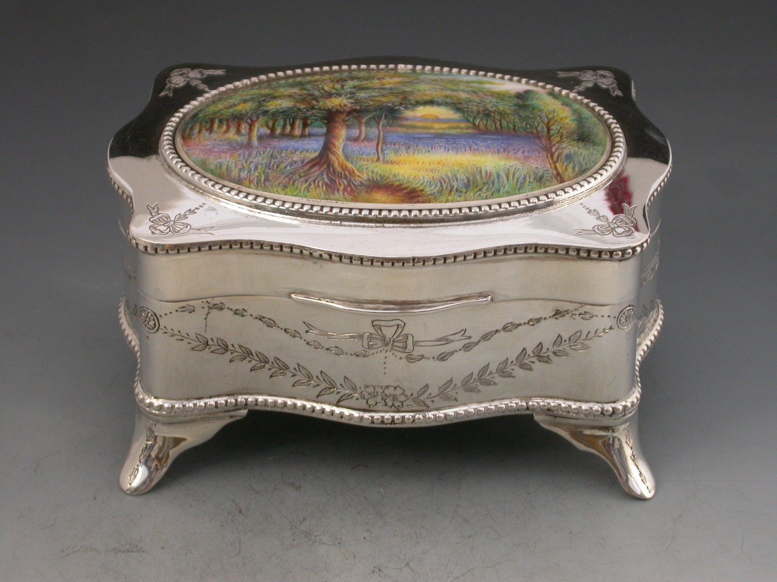 A good quality George V silver Jewellery Box of shaped rectangular form with serpentine sides and standing on four flared feet, the hinged lid inset with an oval enamelled panel depicting the sunrise in a woodland clearing carpeted with bluebells. The interior base lined with sky blue velvet and fitted to accept rings. The gilded interior lid inscribed with Masonic presentation inscription.