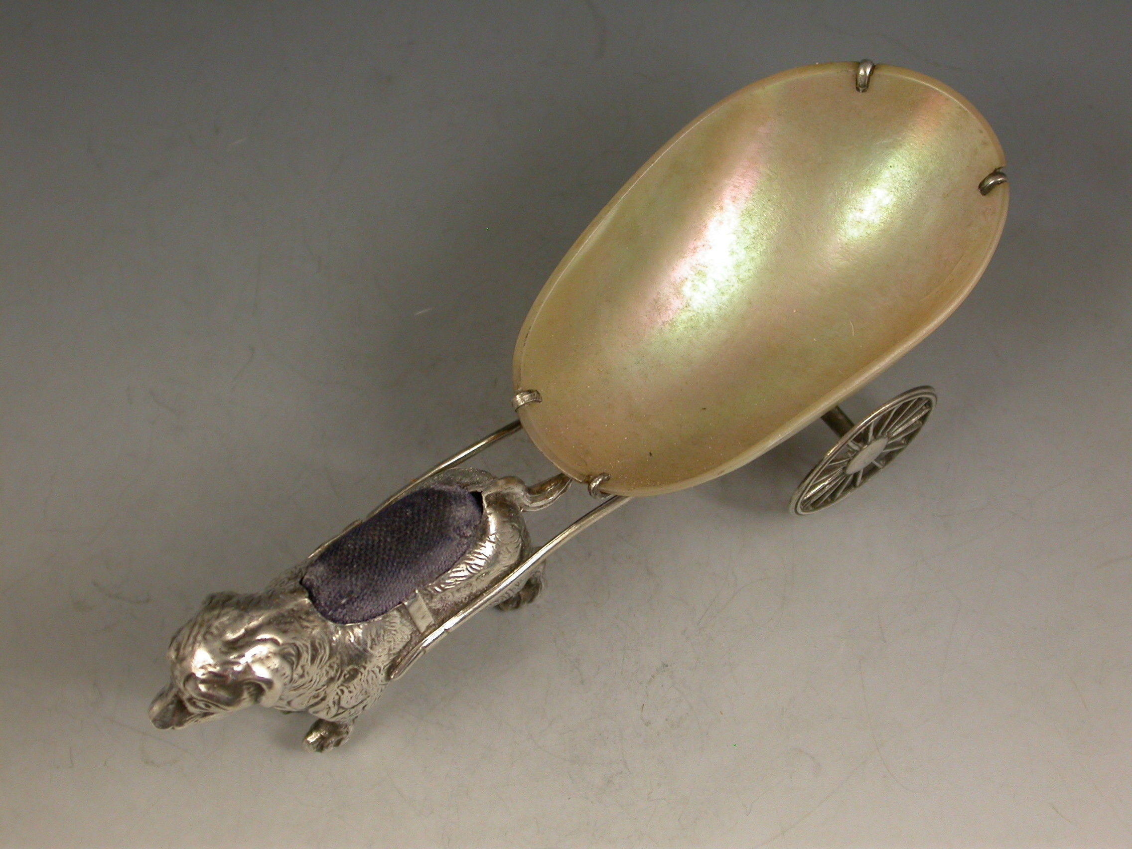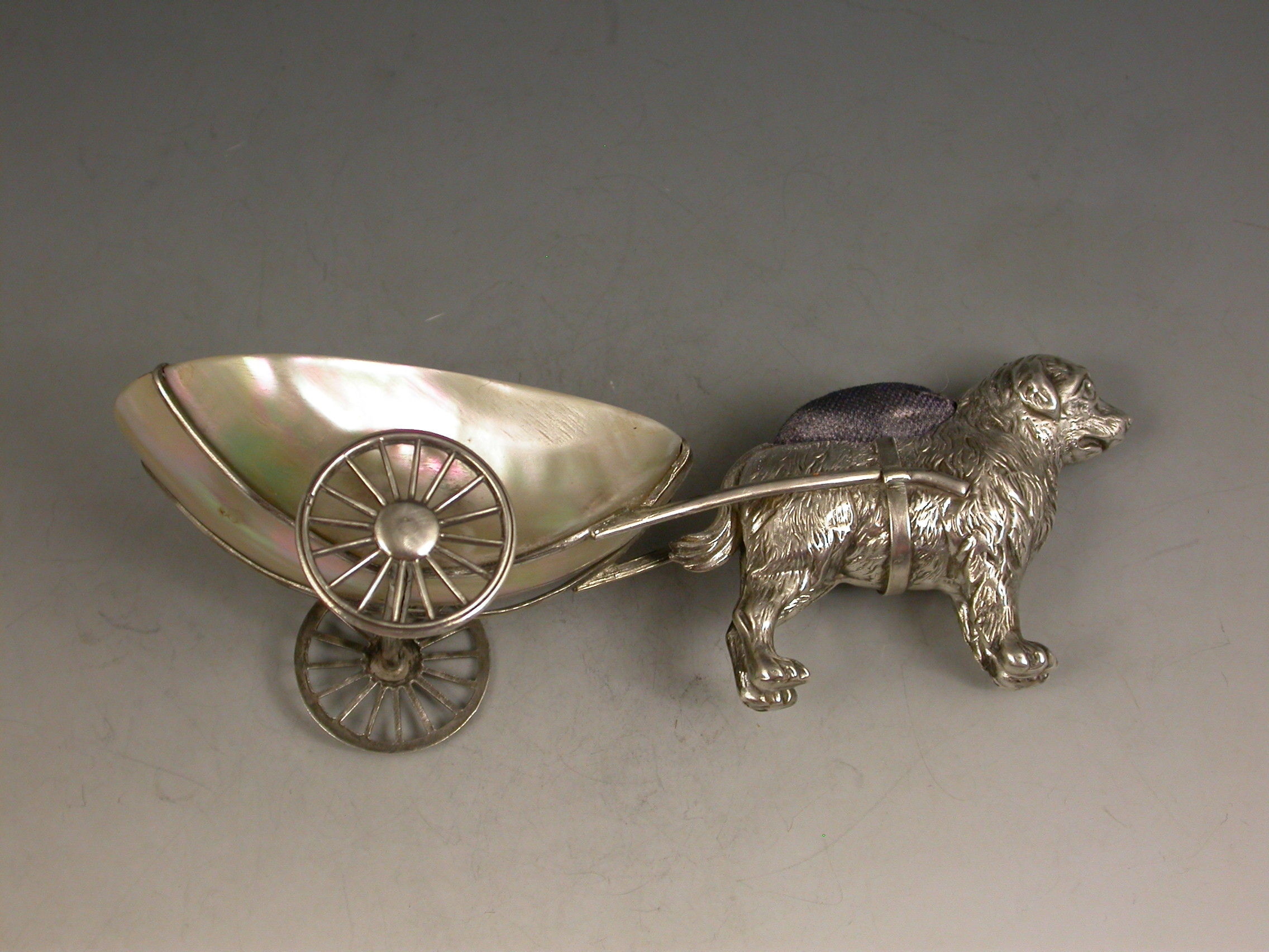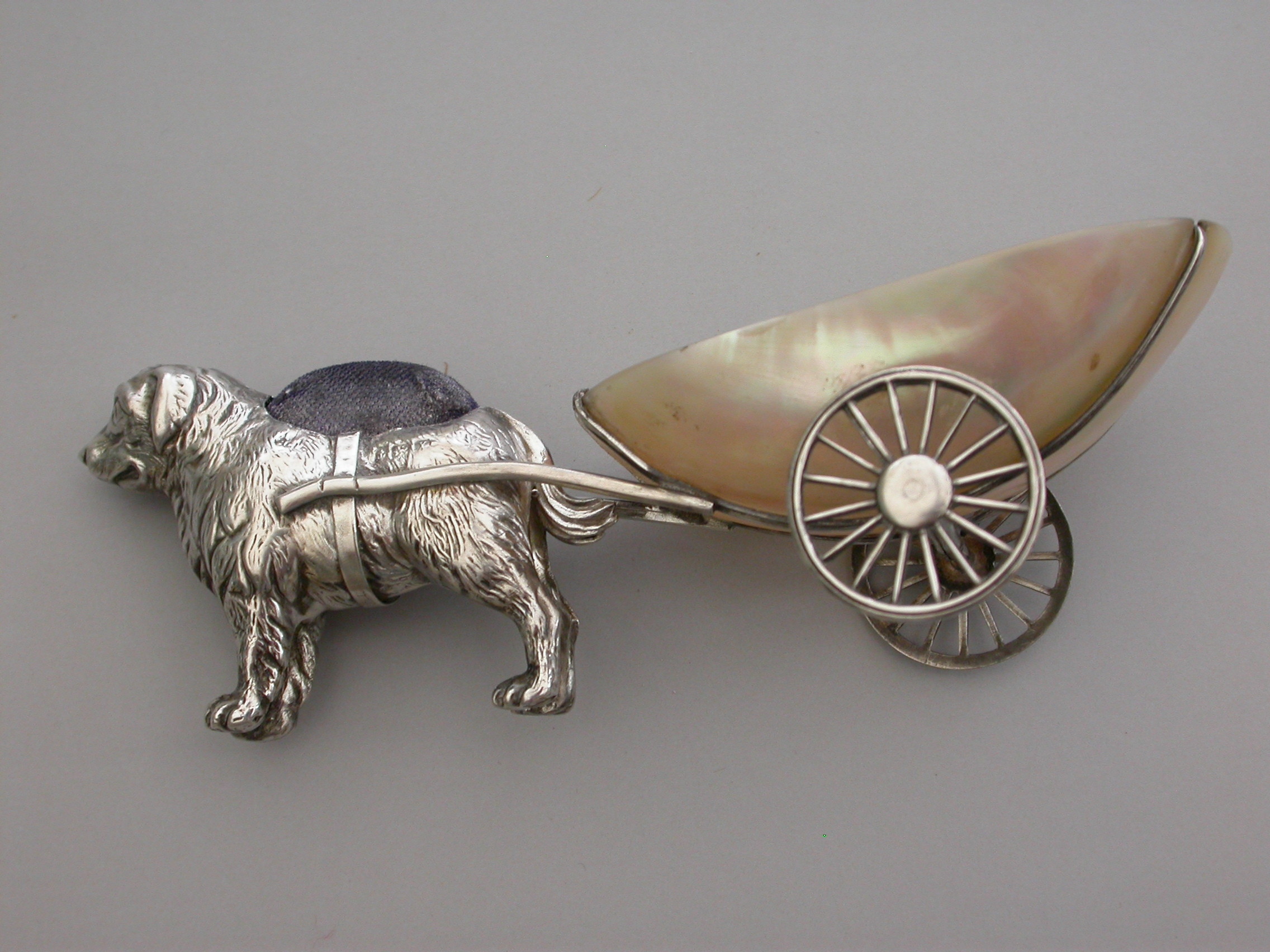 An extremely rare George V novelty silver Pin Cushion, modeled as a dog (possibly a Newfoundland) pulling a shaped Mother of Pearl cart on two wheels. The dog realistically modeled with fine detail and complete with original blue velvet cushion.