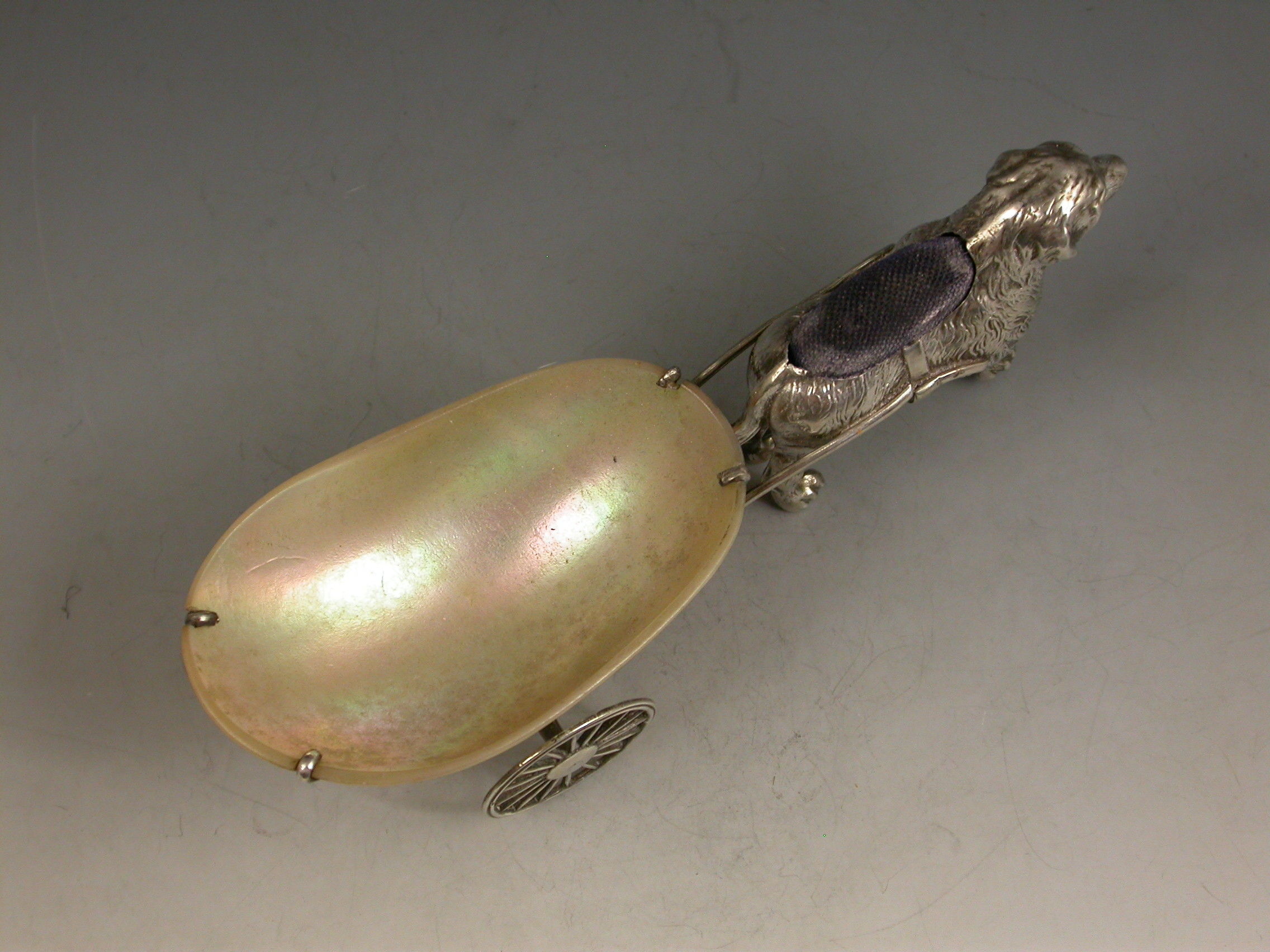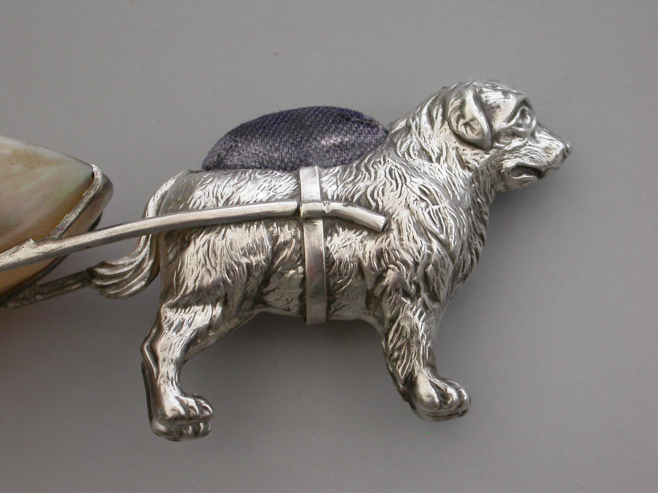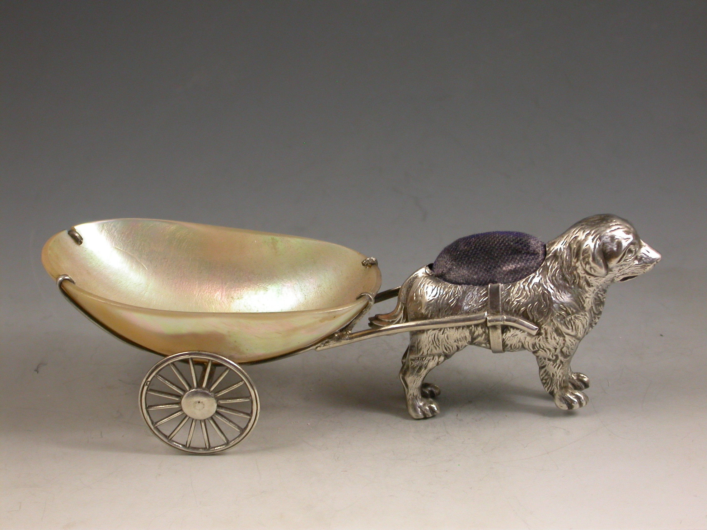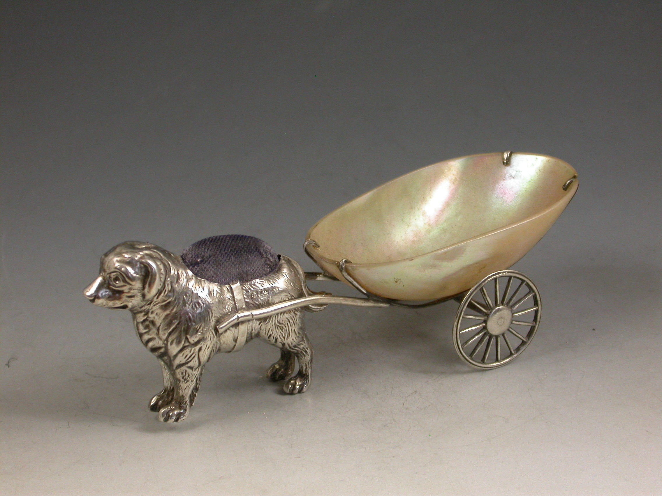 An extremely rare George V novelty silver Pin Cushion, modeled as a dog (possibly a Newfoundland) pulling a shaped Mother of Pearl cart on two wheels. The dog realistically modeled with fine detail and complete with original blue velvet cushion.