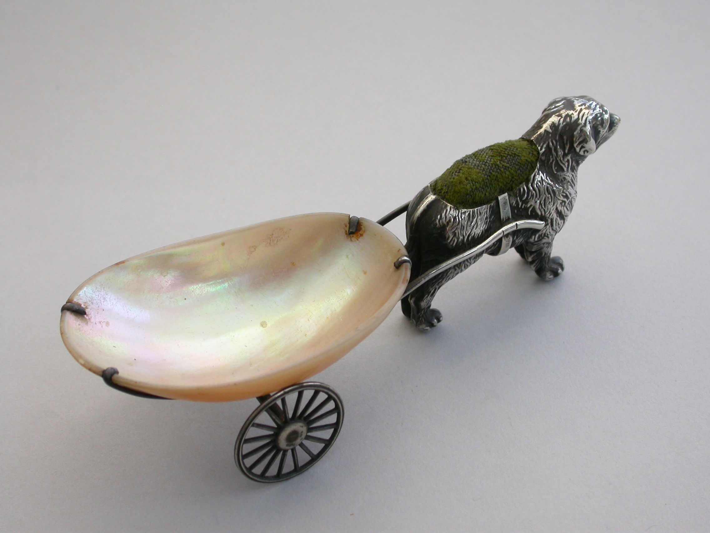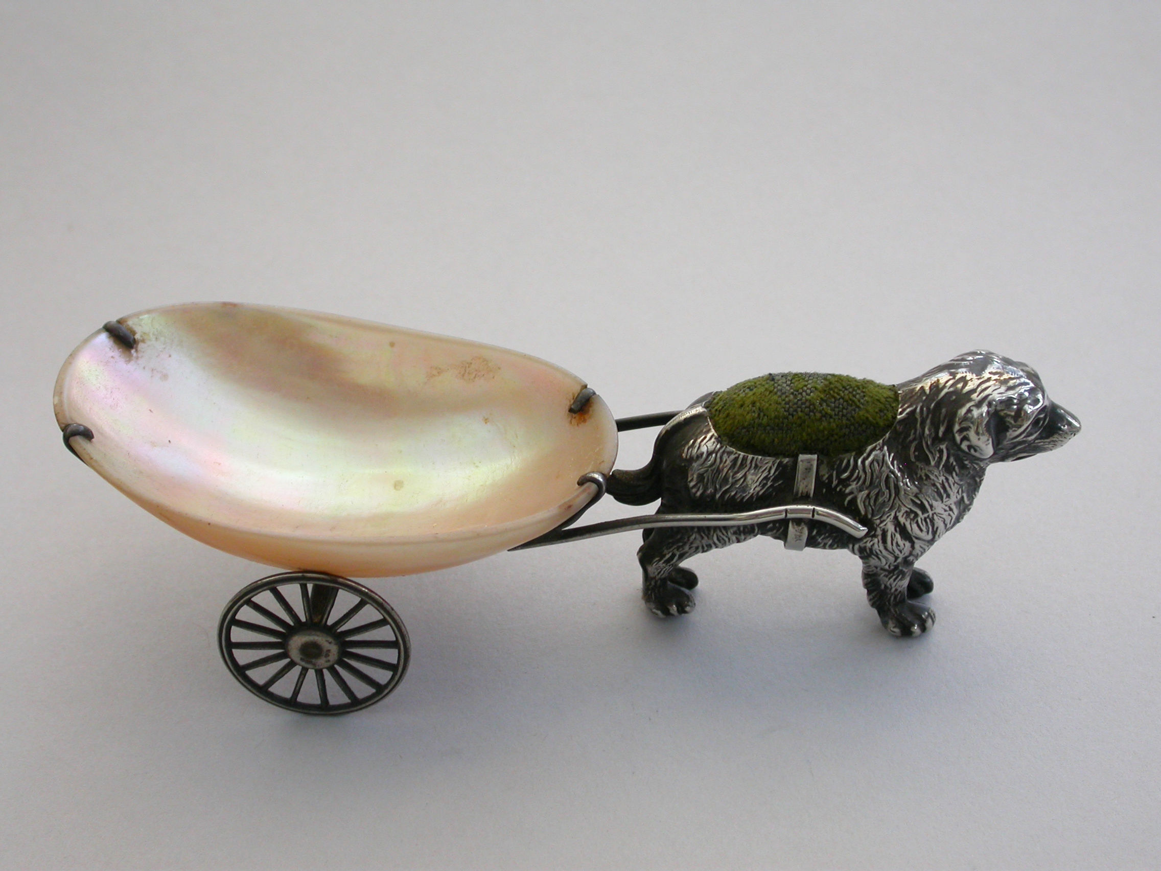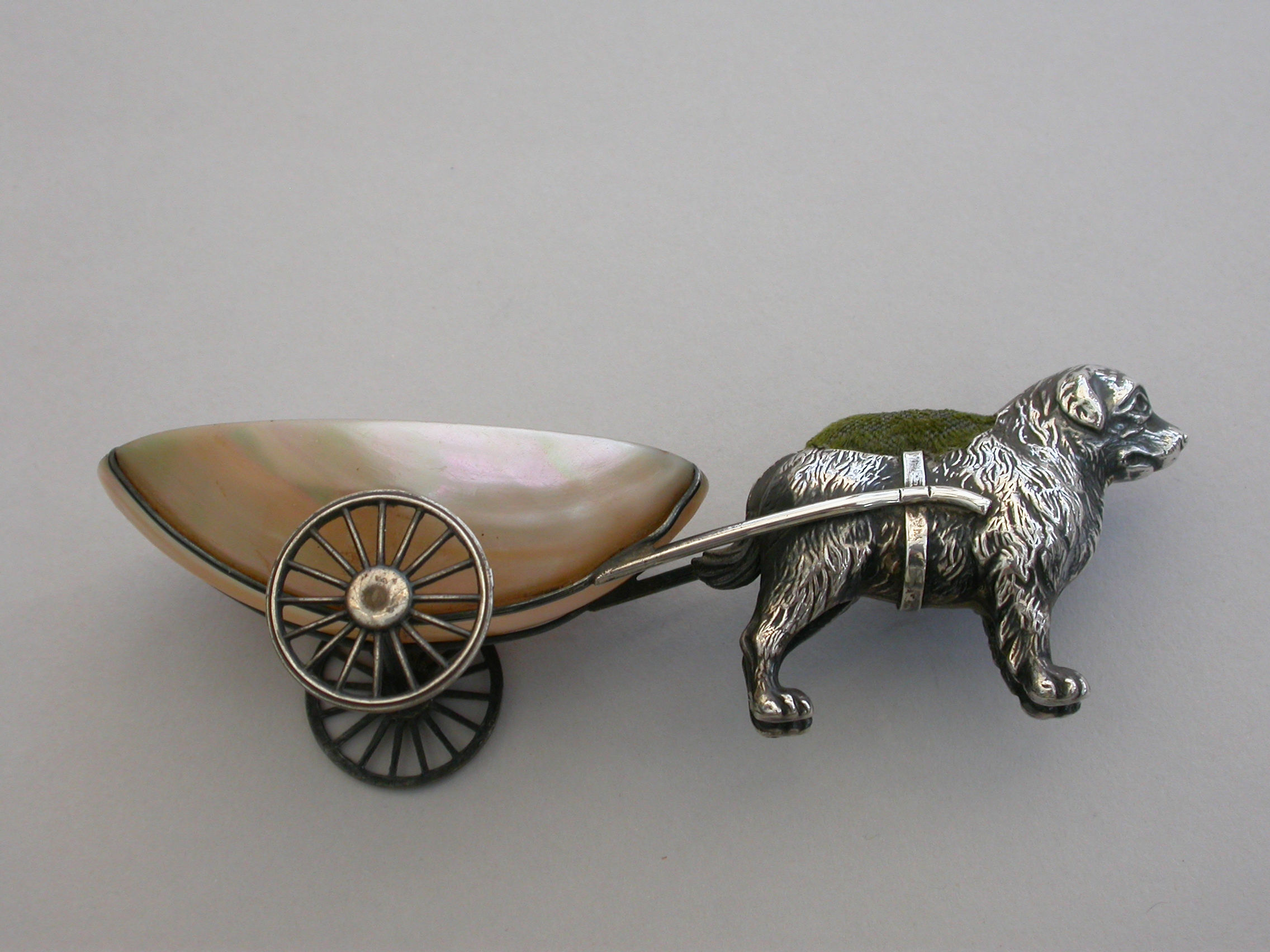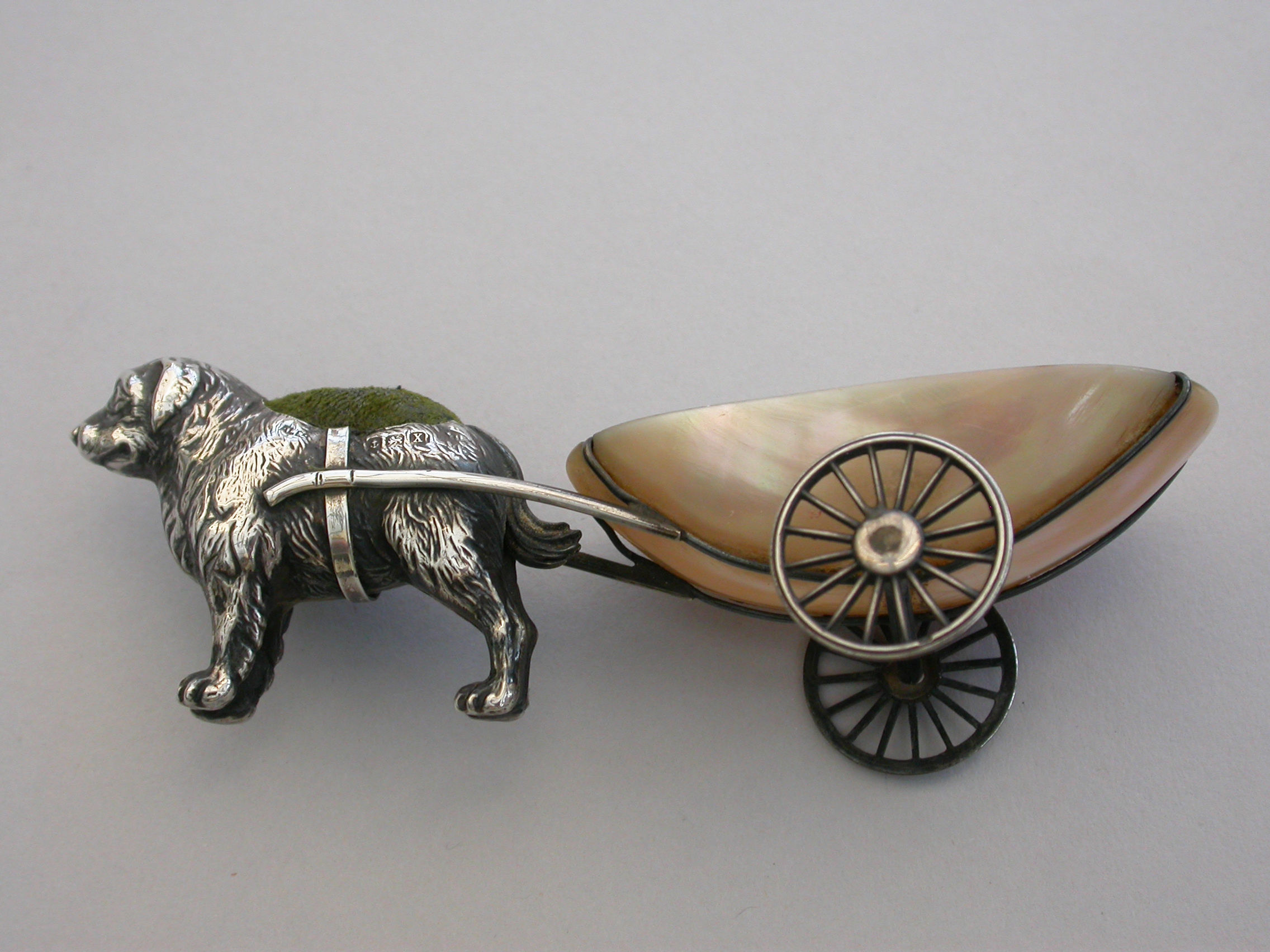 An extremely rare George V novelty silver Pin Cushion, modeled as a dog (possibly a Newfoundland) pulling a shaped Mother of Pearl cart on two wheels. The dog realistically modeled with fine detail and complete with original velvet cushion.