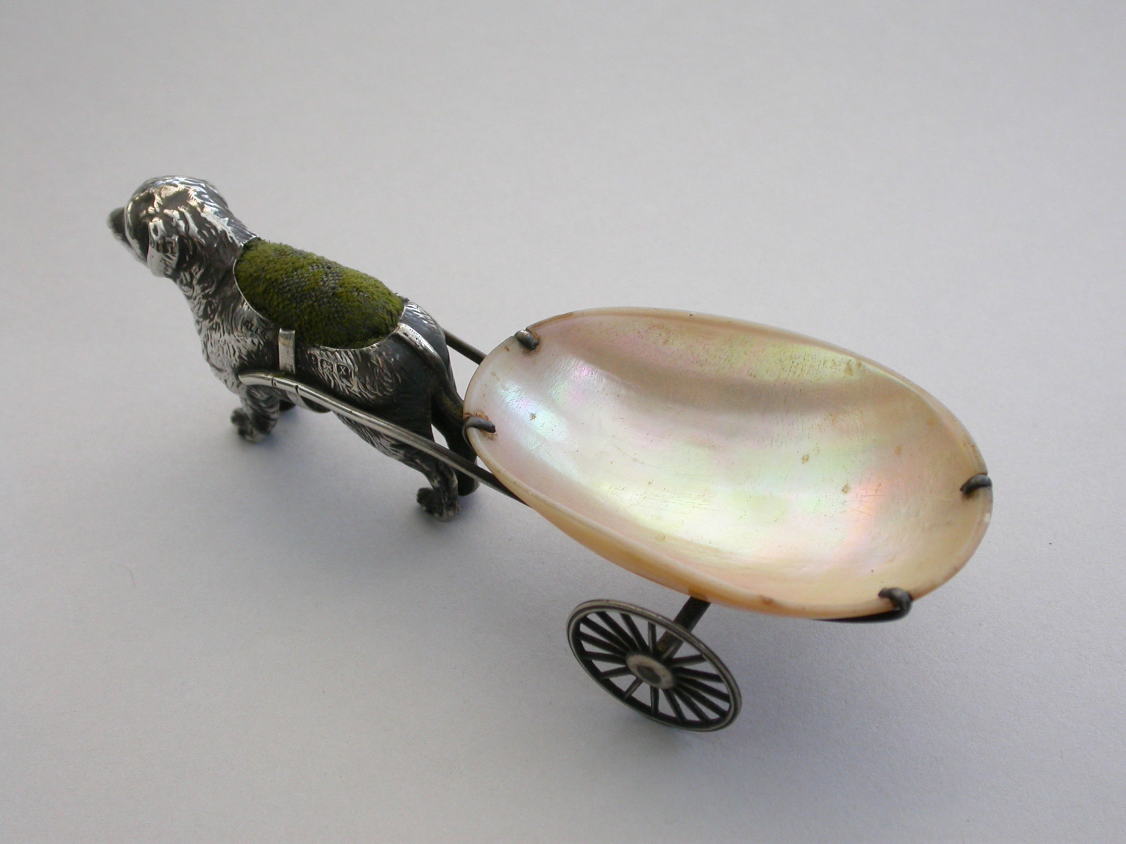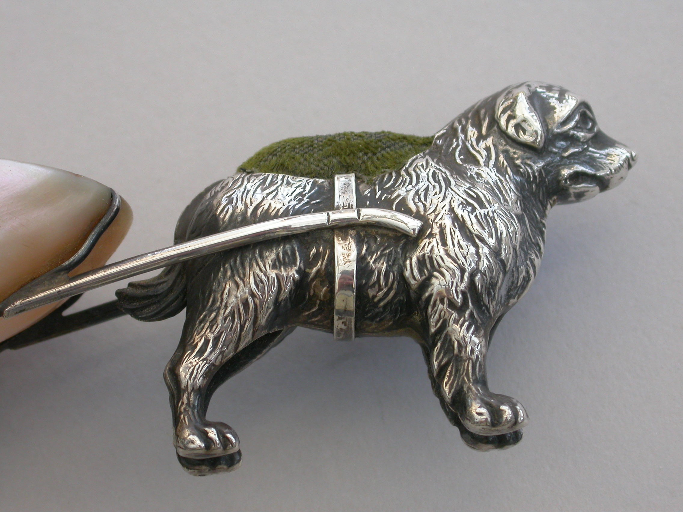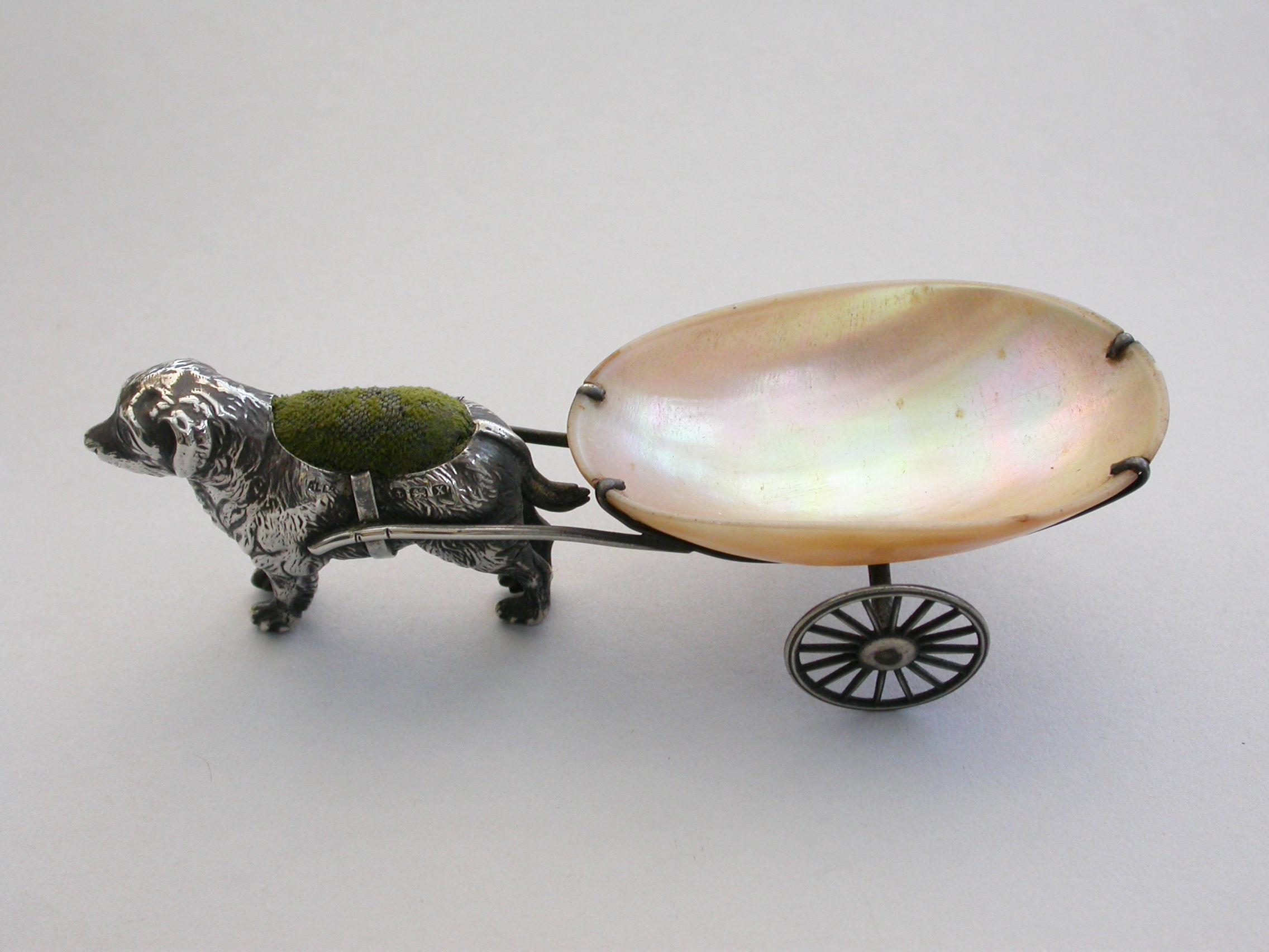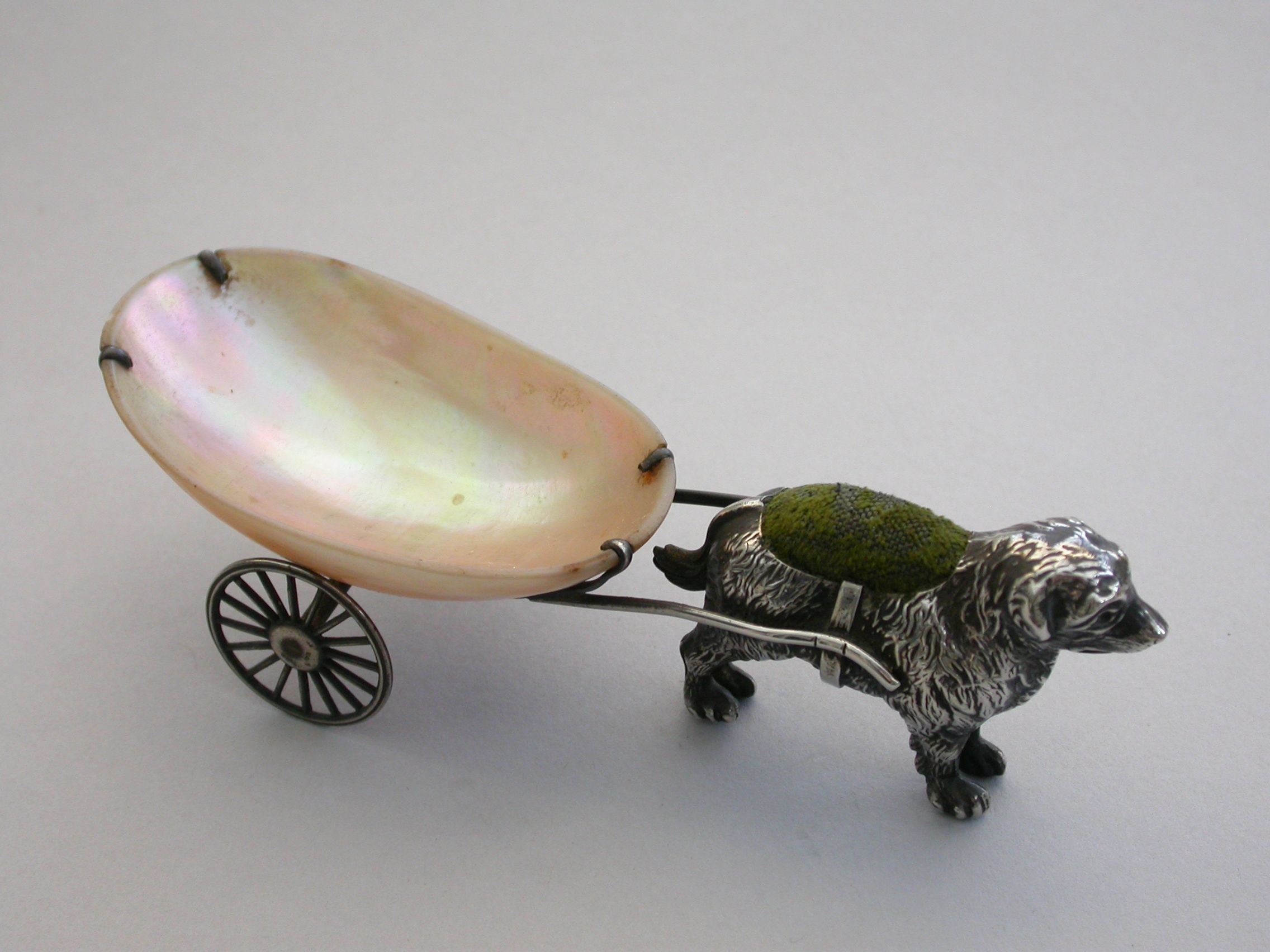 An extremely rare George V novelty silver Pin Cushion, modeled as a dog (possibly a Newfoundland) pulling a shaped Mother of Pearl cart on two wheels. The dog realistically modeled with fine detail and complete with original velvet cushion.