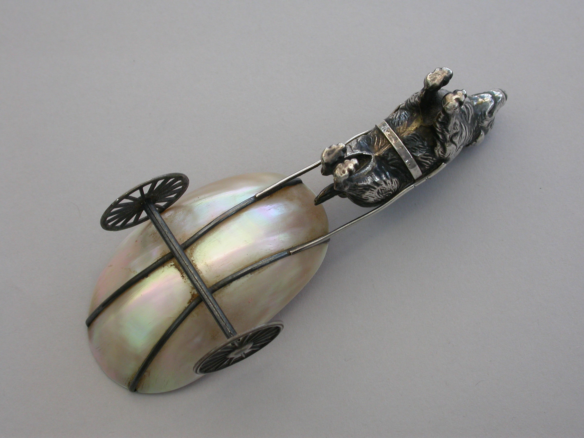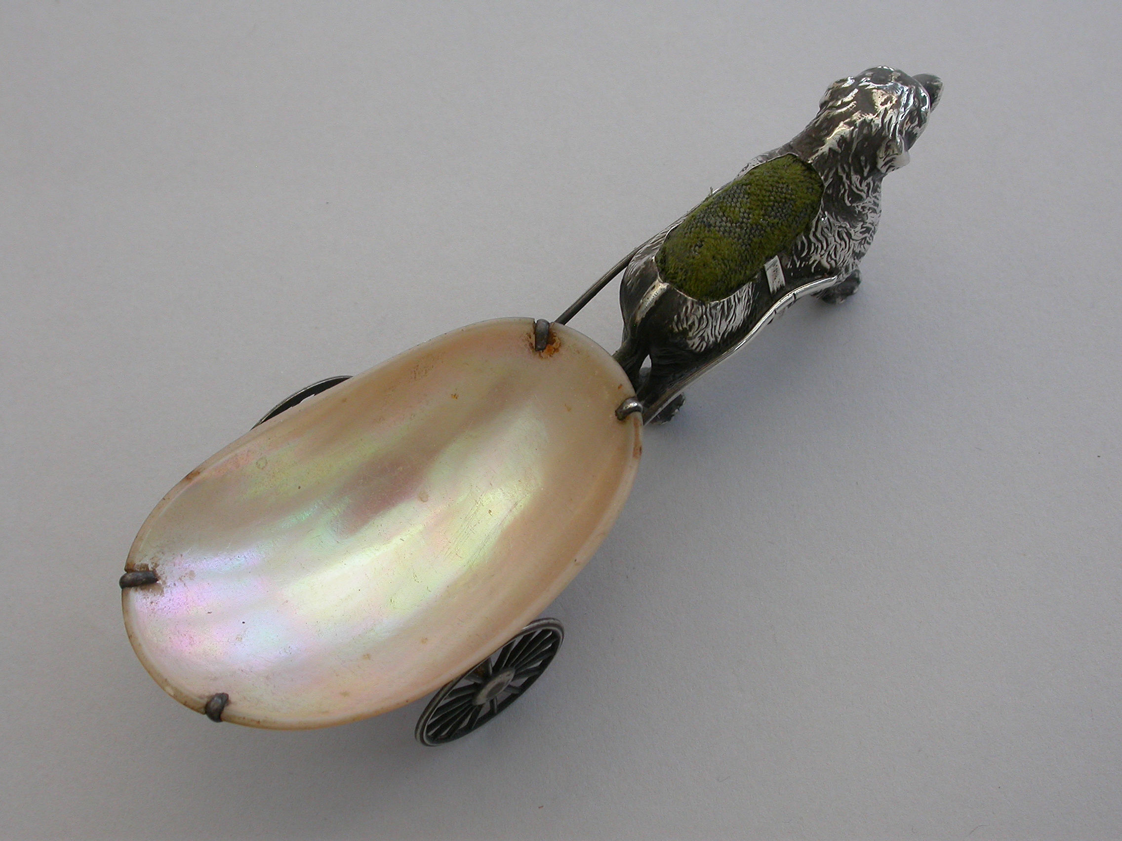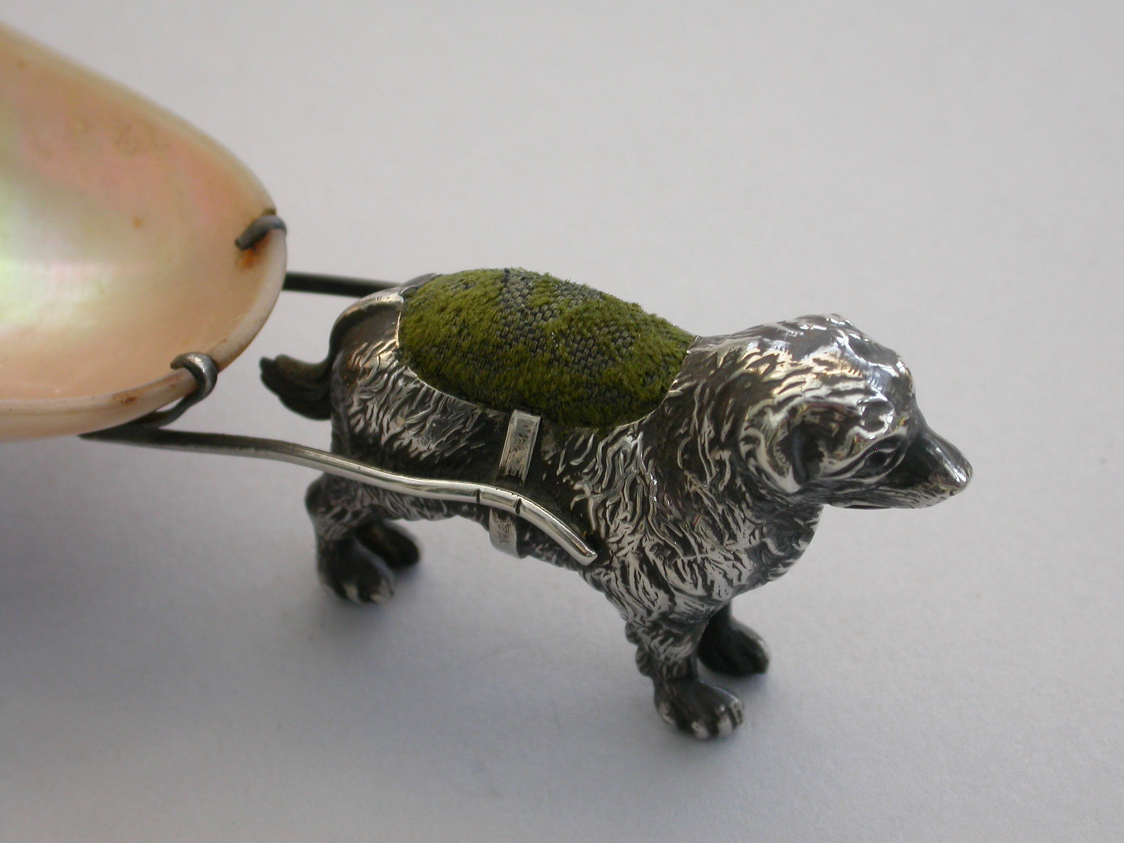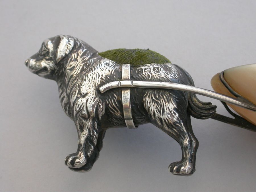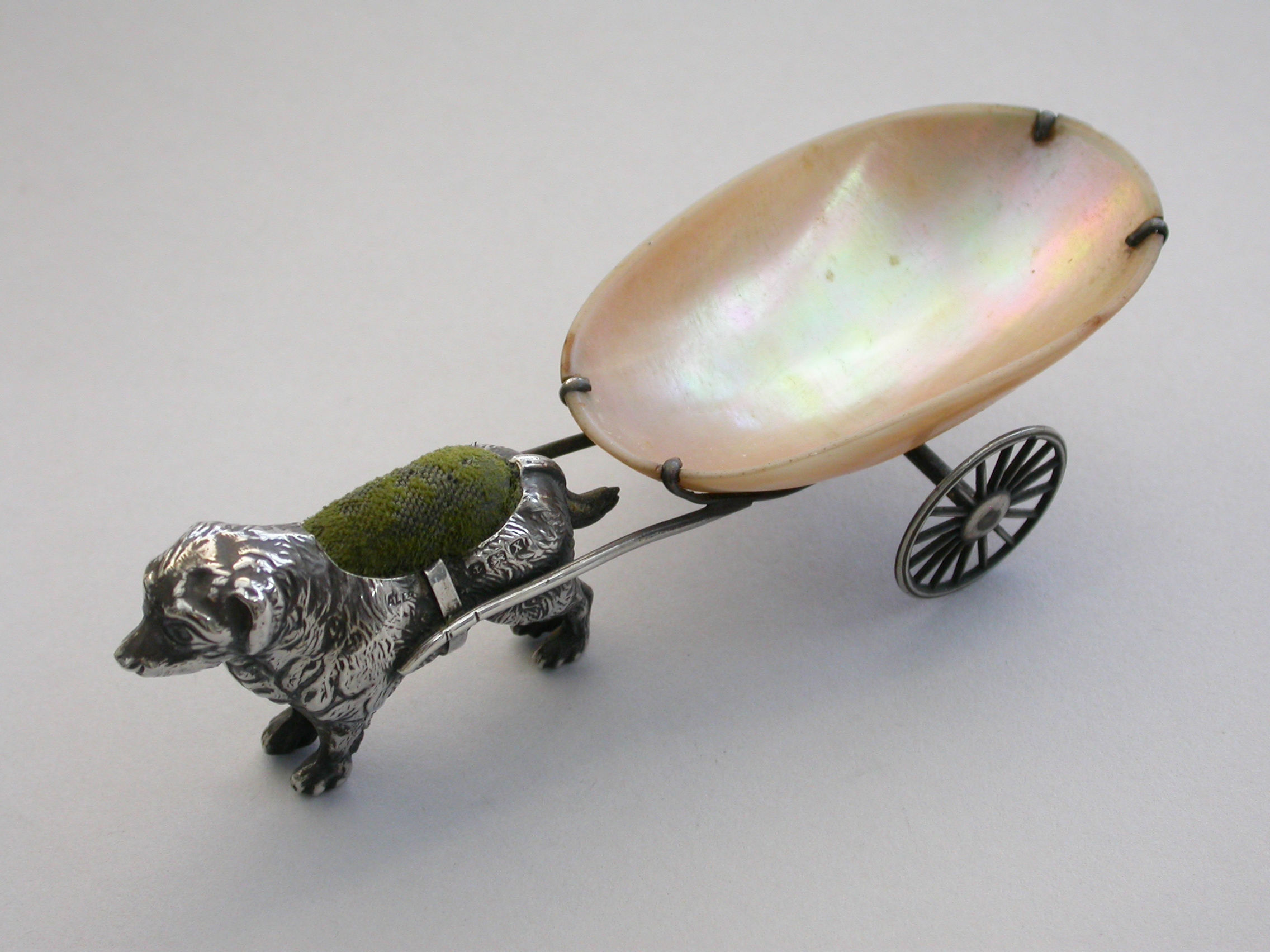 An extremely rare George V novelty silver Pin Cushion, modeled as a dog (possibly a Newfoundland) pulling a shaped Mother of Pearl cart on two wheels. The dog realistically modeled with fine detail and complete with original velvet cushion.