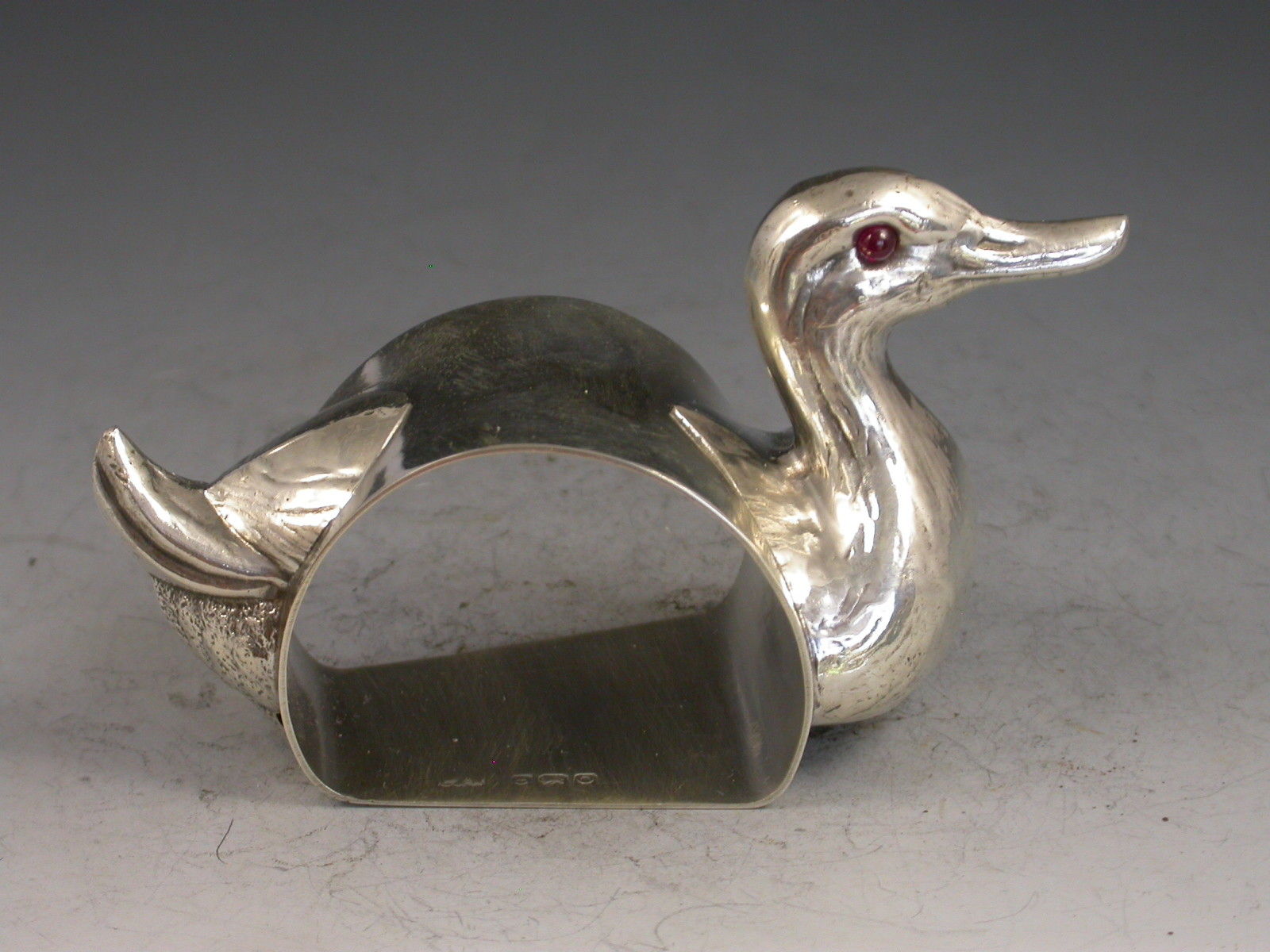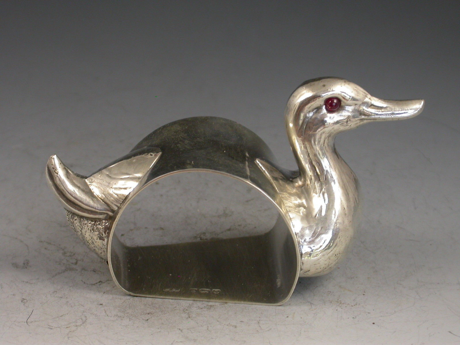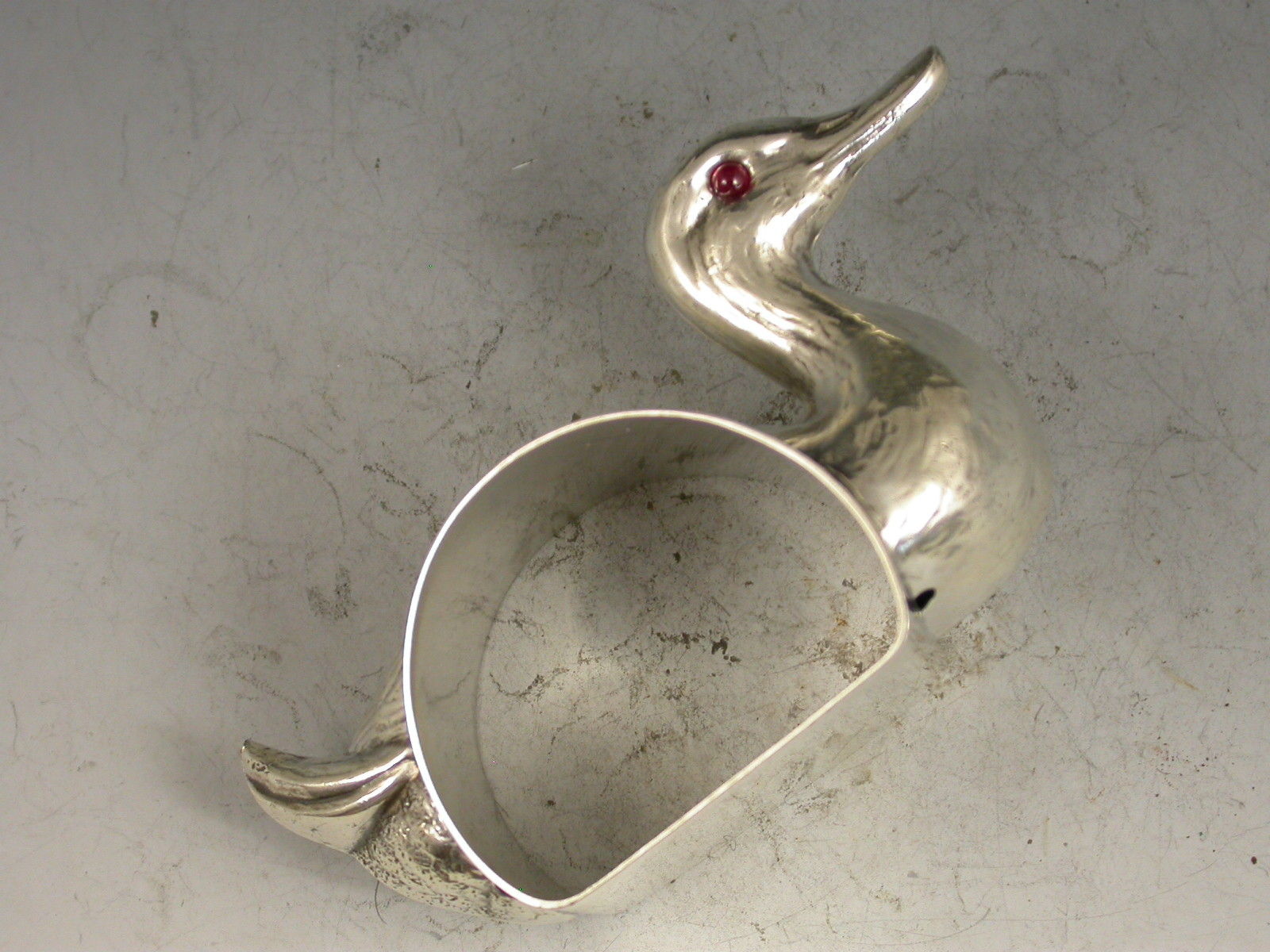 A good quality early 20th century novelty silver Napkin Ring made in the form of a Duck, with ruby glass eyes.