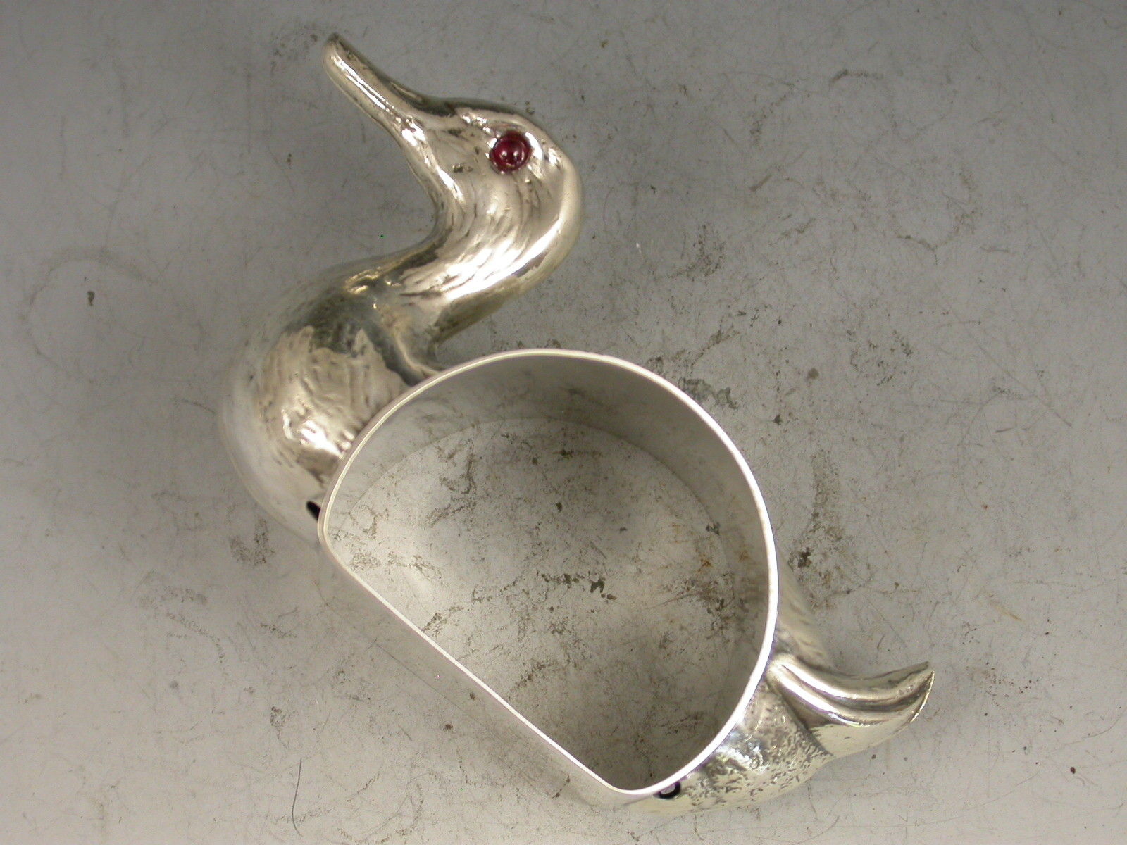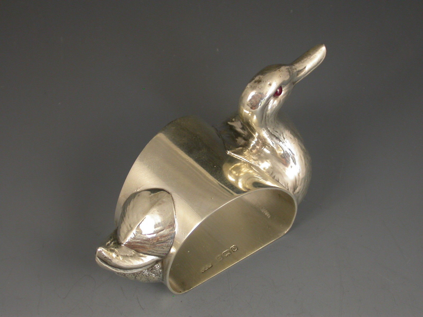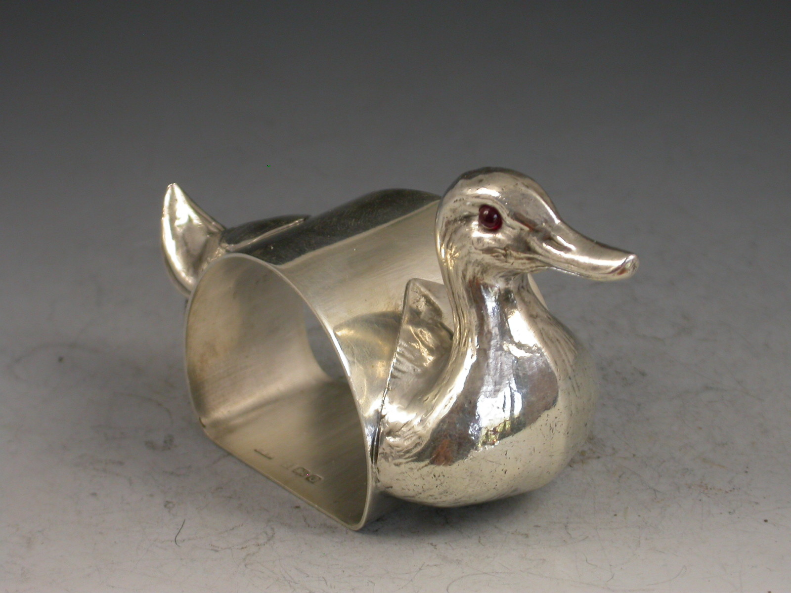 A good quality early 20th century novelty silver Napkin Ring made in the form of a Duck, with ruby glass eyes.