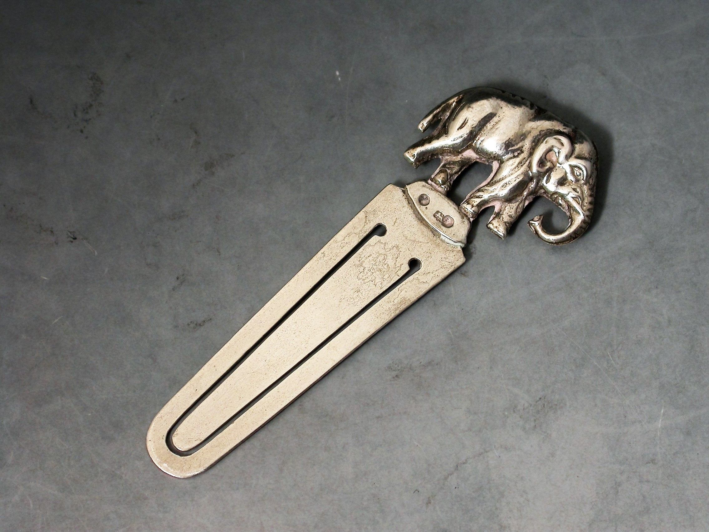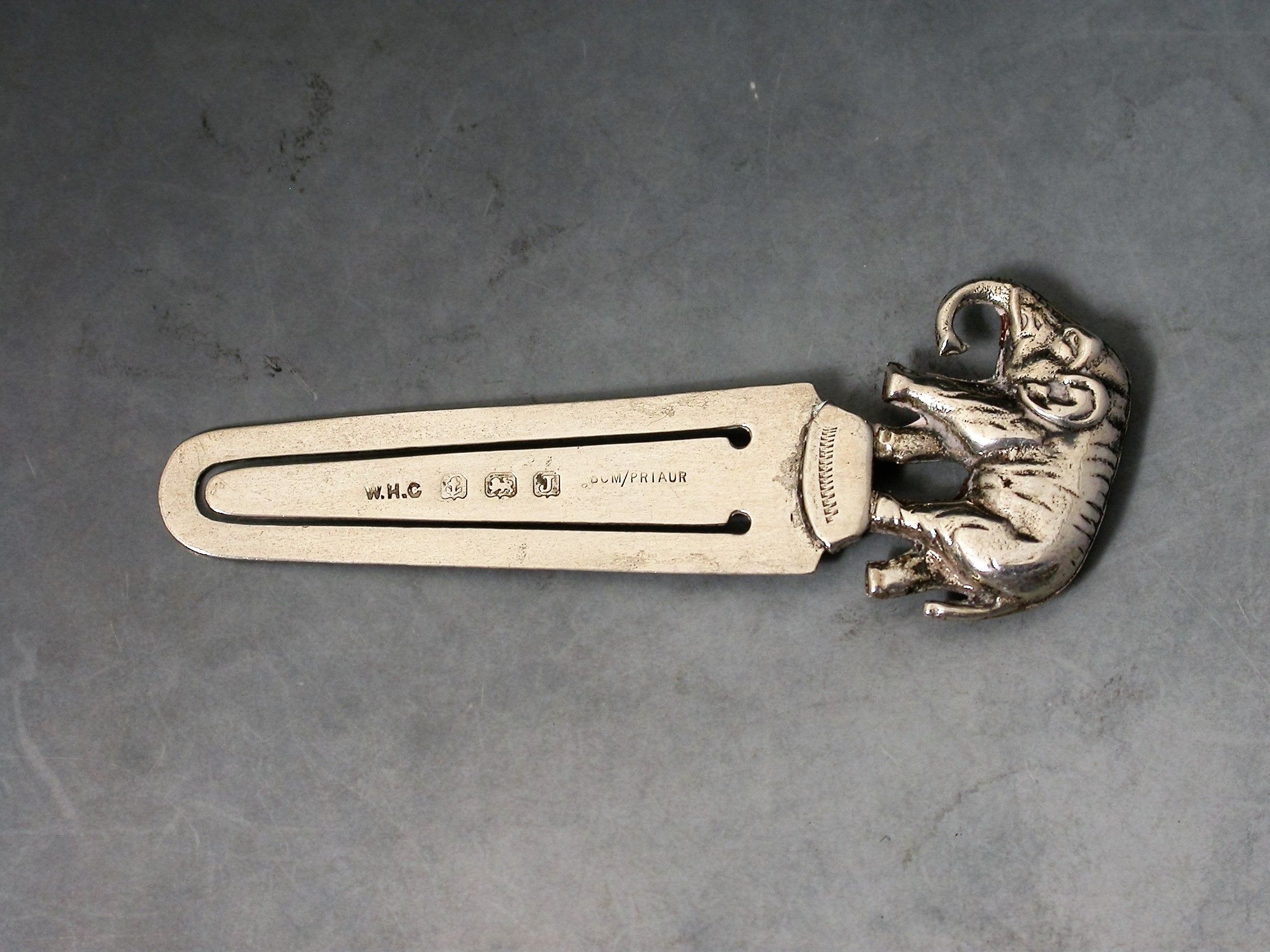 A small early 20th century novelty silver Bookmark, the terminal formed as a walking Elephant.